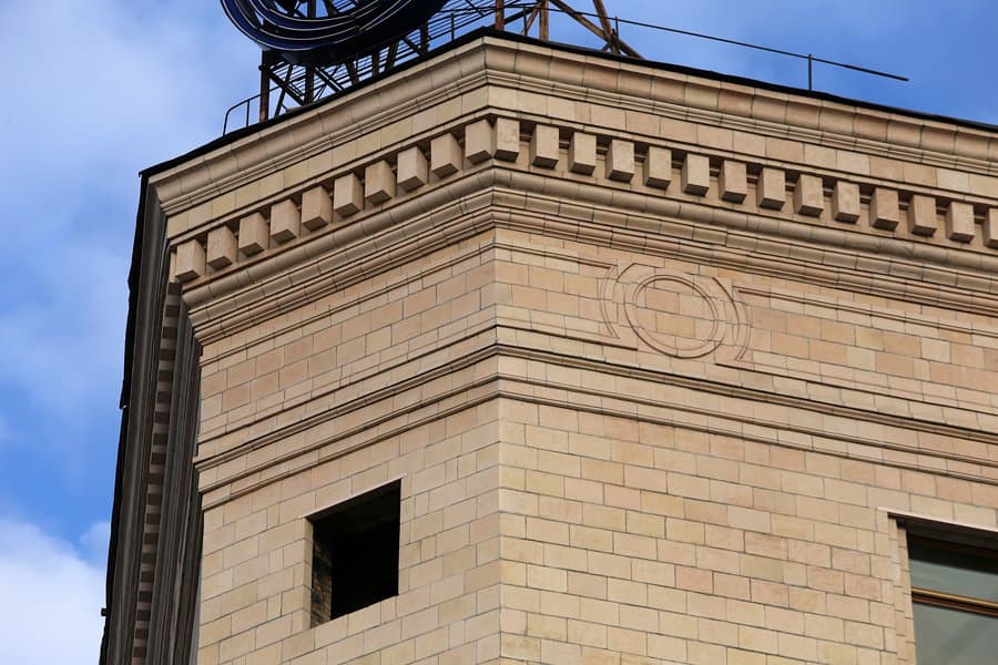 Фасад здания облицован керамическими блоками. Декоративные детали также выполнены из керамики, широко применявшейся в строительстве в те годы. Гигантские арочные дуги, обрамляющие огромные витражные окна, выполнены из гранита. Гранитом же облицован цокольный этаж.