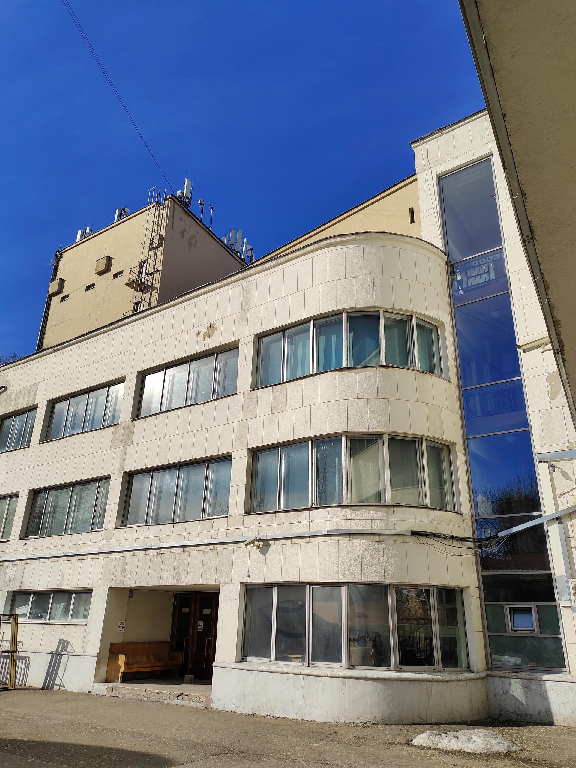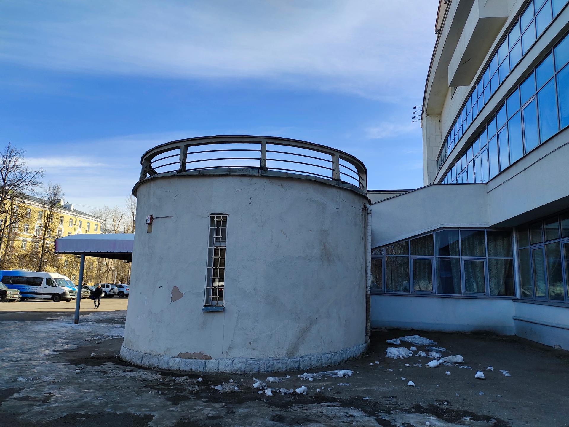 Клубное крыло расположено слева от театрально-зрелищной части, коридор связывает несколько его объемов, самый крупный из которых – спортзал, примыкающий с задней стороны. Театральный зал занимает трапециевидный в плане разновысотный объём с эффектным полуциркульным планом задней части: это дань как модным корбюзианским параболическим планам, так и идее радиального расположения артистических уборных вокруг трюма сцены.