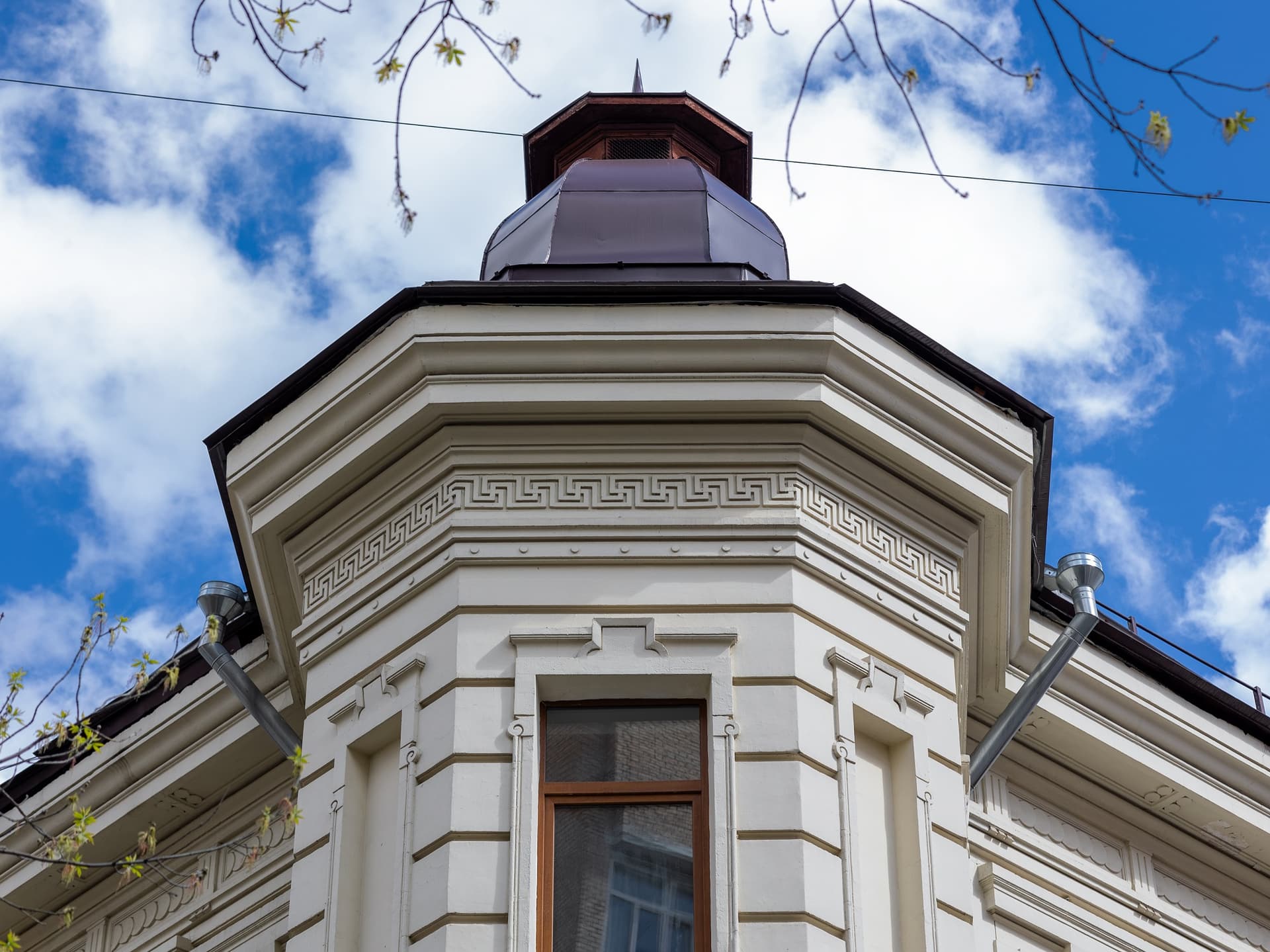 Доходный дом в Большом Харитоньевском, 10, был построен в очень модном в конце XIX века стиле неоренессанса в сочетании с эклектикой. Каждый этаж дома декорирован по-своему: первый этаж отделан рустом, над окнами расположены замковые камни, на втором этаже окна увенчаны треугольными наличниками-фронтонами и обрамлены пилястрами, а на третьем окна оформлены более строго - прямоугольными широкими пилястрами и небольшими лепными украшениями под оконными проёмами. Окна эркеров нарочито узкие и создают впечатление средневекового бастиона, башенки над эркерами становятся логичным продолжением этой ассоциации.