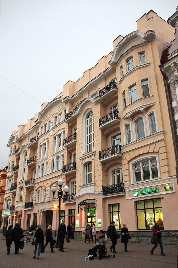 Сейчас это отреставрированный доходный дом, построенный в стиле модерн. Плавные линии фасада, узорчатые балконы, разнообразие окон и эркеров делают его украшением Арбата.
