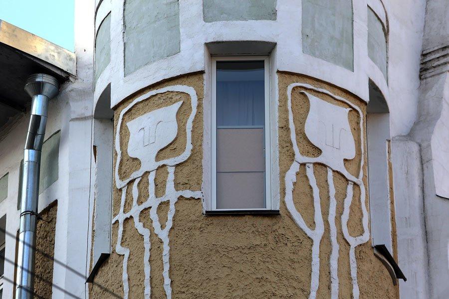 «Дом с маками» - фасады дома украшены изящной лепниной с изображением маков (до революции лепнина была раскрашена в соответствующие цвета). Помимо этого в верхней части здания имелись полихромные керамические вставки с изображением красных маков на голубом фоне.