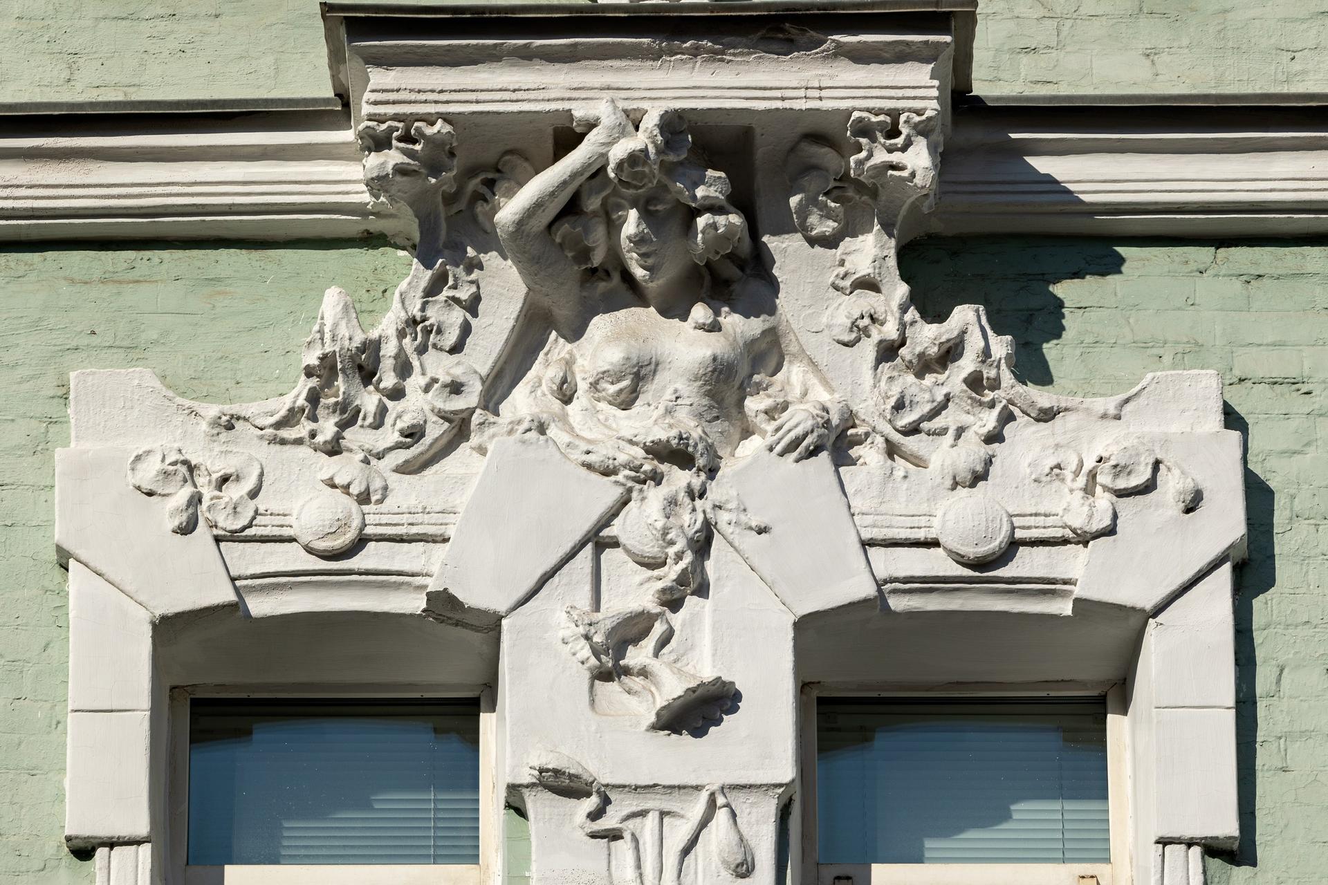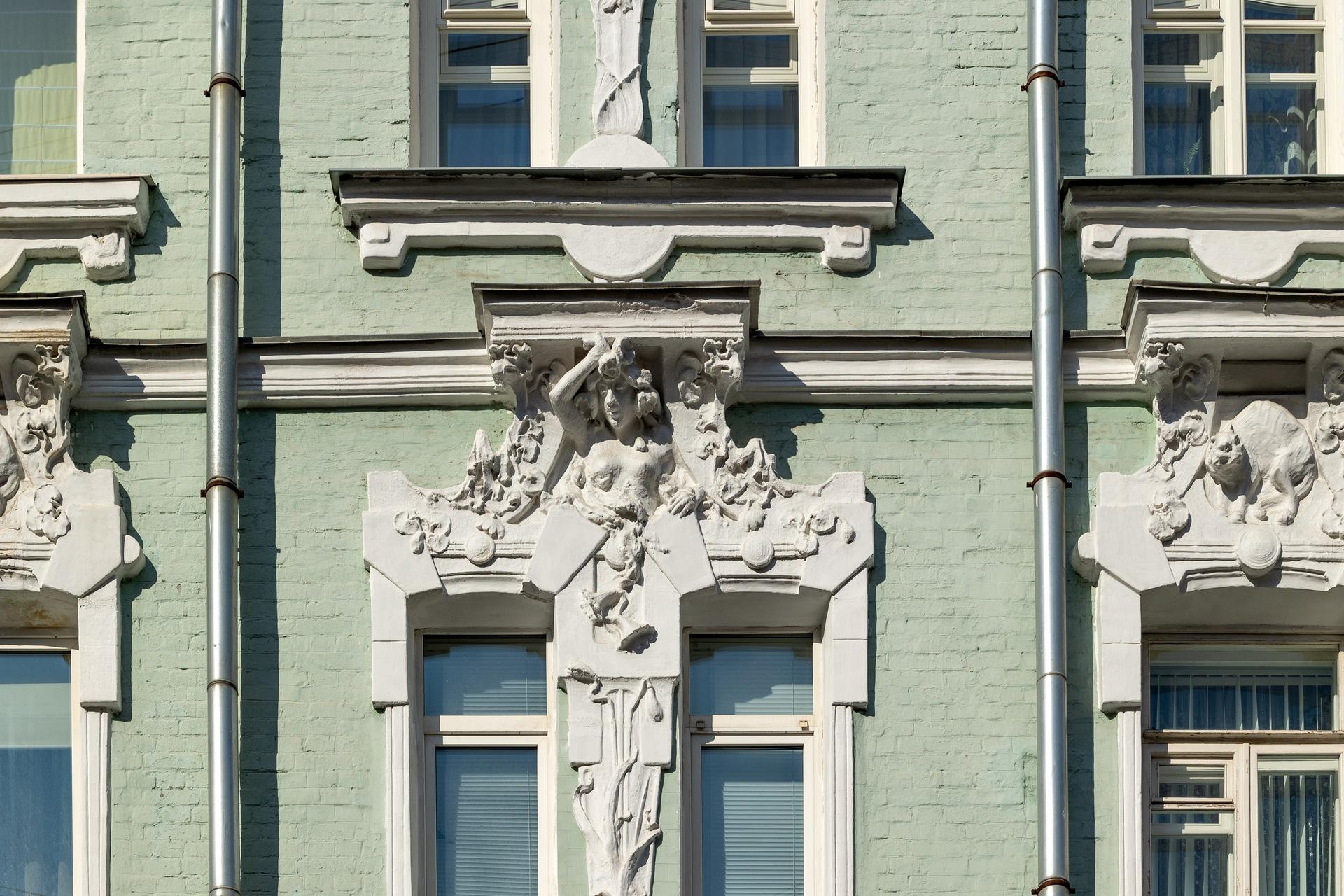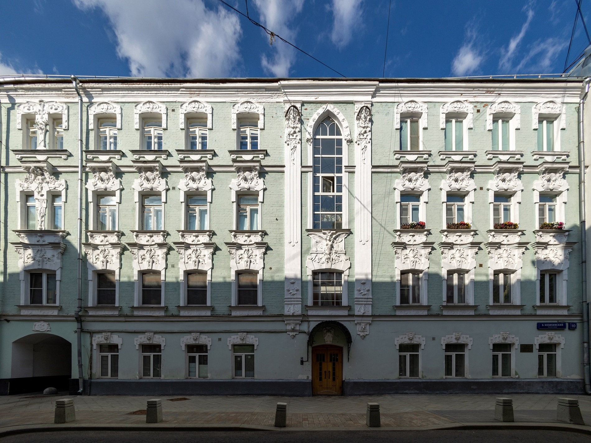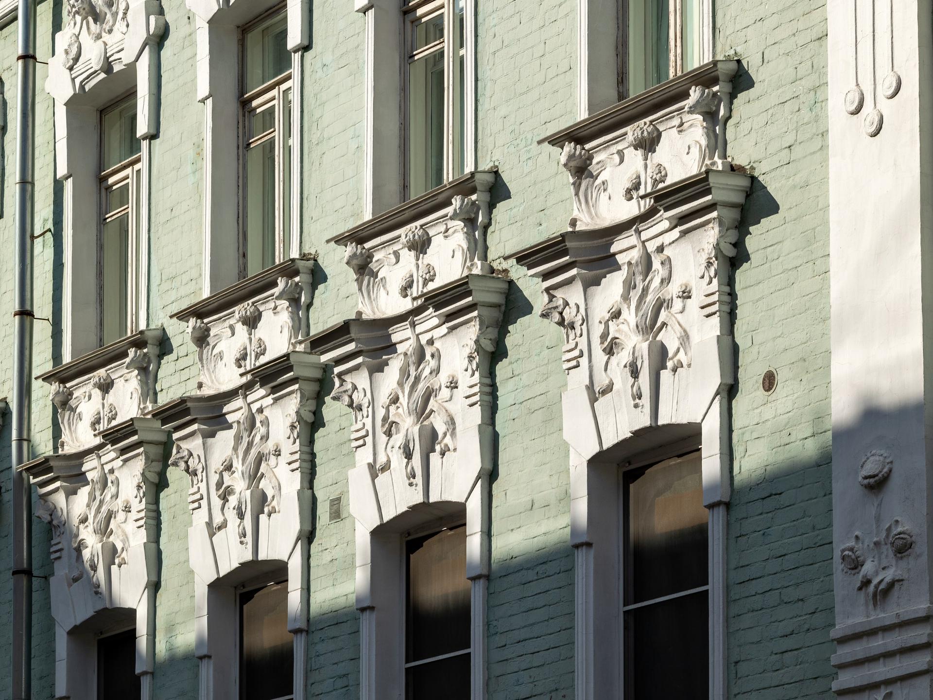 Здание в Большом Козихинском переулке — образец доходного дома среднего класса с пяти- и шестикомнатными квартирами. В первую очередь внимания заслуживает его уникальный фасад, декорированный разнообразными необычными художественными элементами. Стилистика его оформления является редким примером московского модерна в раннем, тяготеющем к образам символизма варианте. Горожане могут разглядеть здесь растительные и животные мотивы. Например, оконные проемы украшают скульптуры в виде голов лисиц, шипящих кошек с выгнутыми спинами и химер. Кроме этого, на фасаде можно найти скульптурное изображение птицы Сирин и капители в виде женских голов в средневековых шлемах.