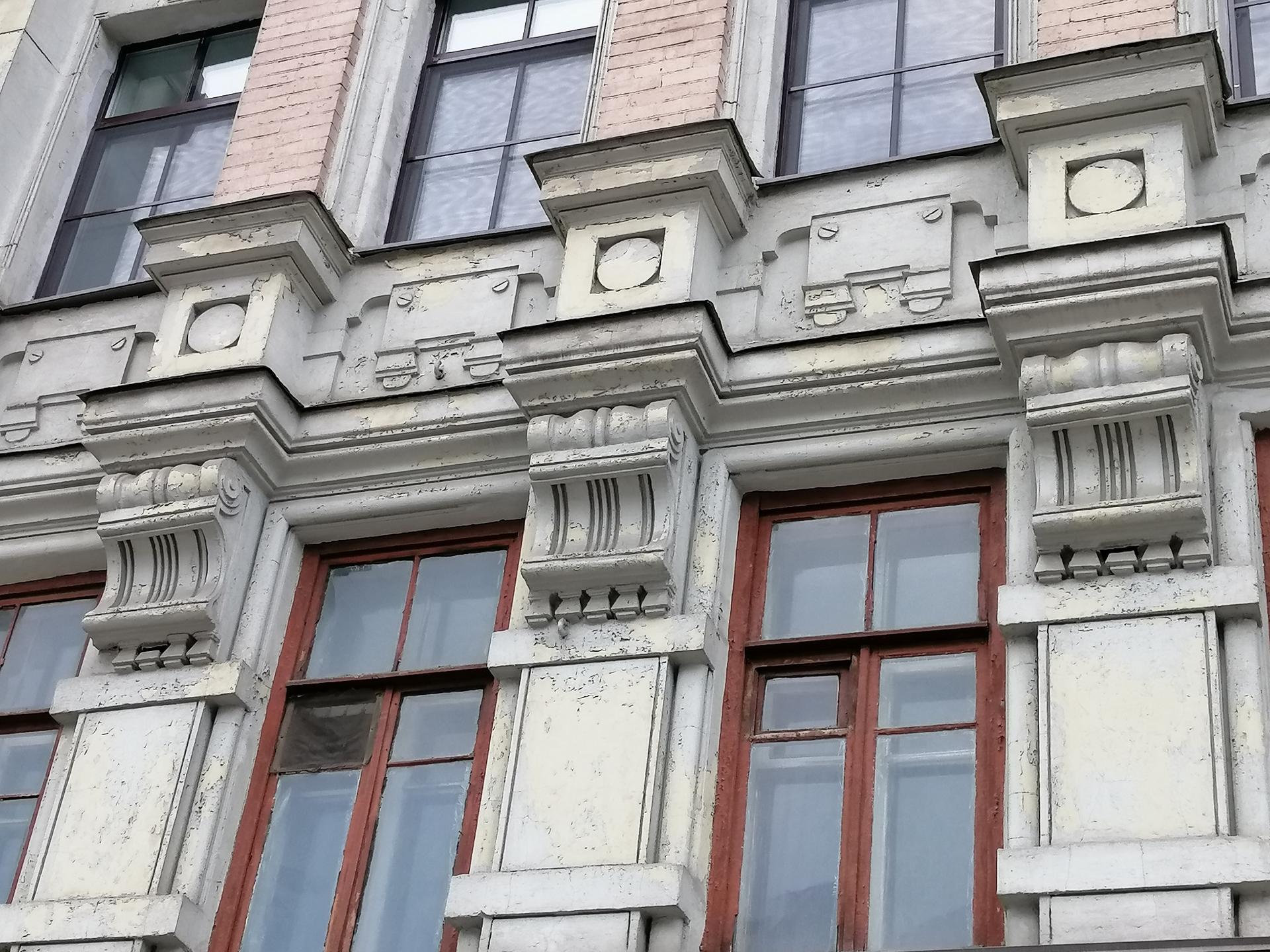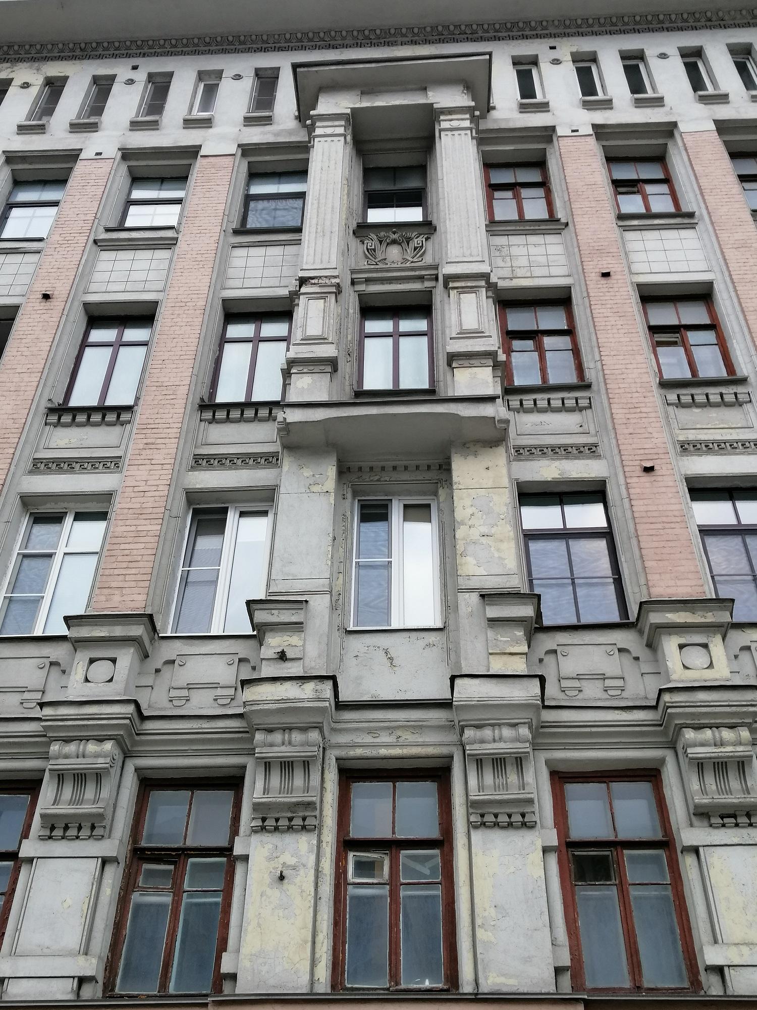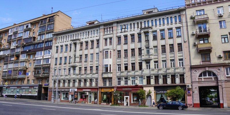 Дом на Красной Пресне имеет не только мемориальную, но и архитектурную ценность. Здание является характерным образцом доходных домов начала прошлого века. Его фасады оформлены в стиле французского модерна, для которого свойственны симметричная композиция и лаконичный декор. Так, в центральной части главного фасада на уровне второго и четвертого этажей расположен эркер. Симметрично по бокам от него на уровне четвертого и пятого этажей можно увидеть две вертикальные композиции — обрамленные резными пилястрами (полуколоннами) окна. Кроме того, главный фасад украшен лепным карнизом, окантованным зубцами (или “сухариками”), и меандром — декоративным греческим орнаментом
