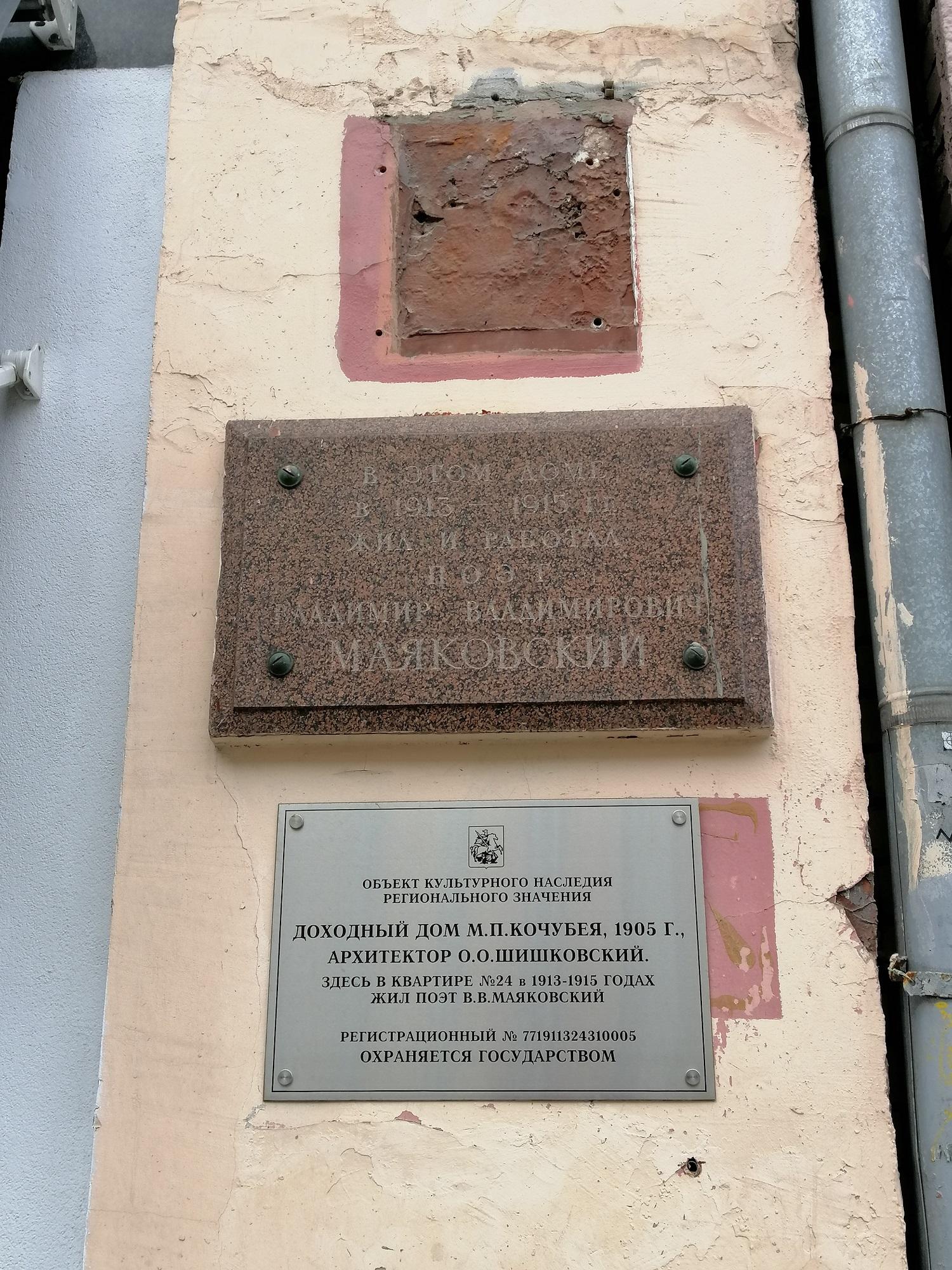 Вместе с матерью и двумя сестрами поэт арендовал в доме 36 на Большой Пресненской улице (сегодня — улица Красная Пресня, дом 36, строение 1) четырехкомнатную квартиру на первом этаже. Именно там Владимир Маяковский написал много своих известных стихотворений, среди которых «Послушайте» (1914), «Война объявлена» (1914) и «Я и Наполеон» (1915). Последнее начинается так: «Я живу на Большой Пресне, 36, 24…» Кроме того, в доме на Красной Пресне Маяковский работал над поэмой «Облако в штанах» (1915).