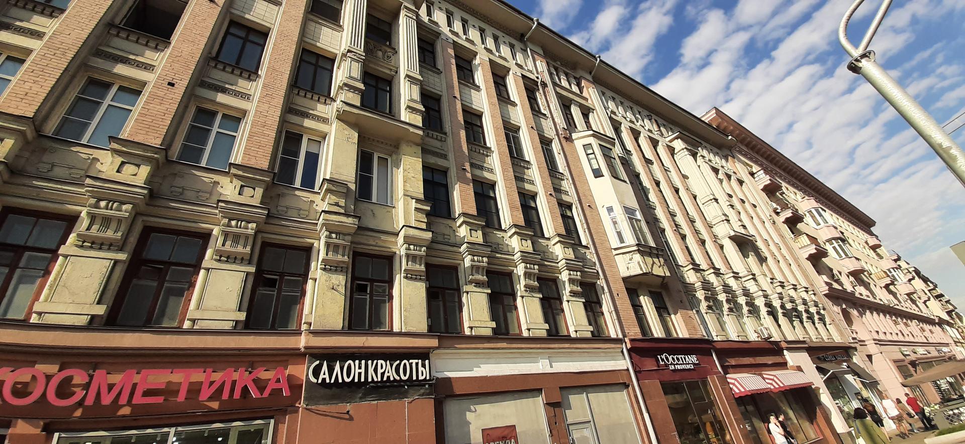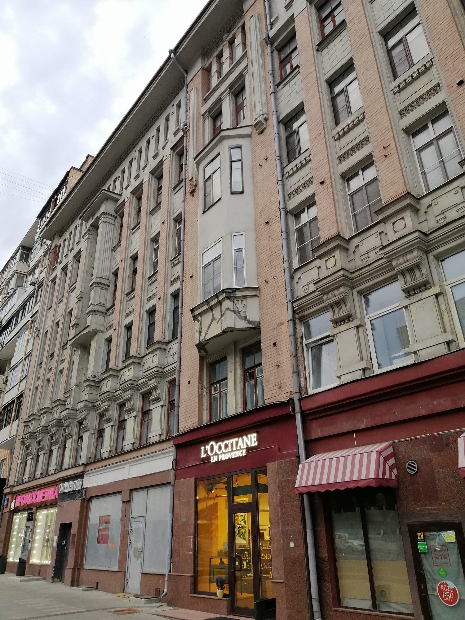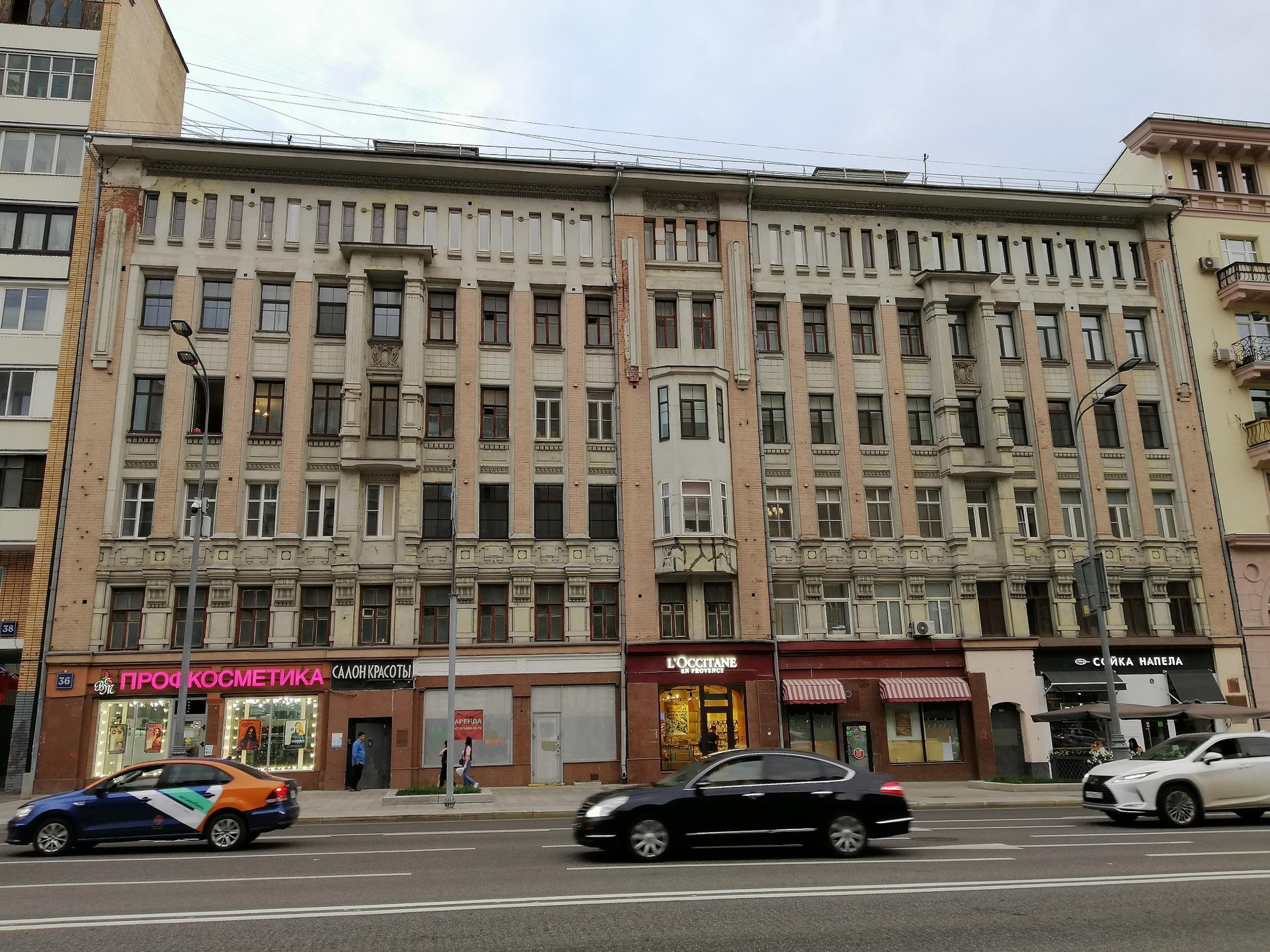 Здание доходного дома было построено в 1905 году по проекту архитектора Осипа Шишковского. Его возвели на месте деревянного двухэтажного строения. Разные части дома имеют разное количество этажей. Дело в том, что в 1904 году построили пятиэтажное здание, а год спустя перед ним — схожее по планировке шестиэтажное, и дома объединили. Фасад шестиэтажного корпуса (главный фасад здания) сейчас выходит на улицу Красная Пресня. На первом этаже дома располагались торговые помещения, в том числе молочная лавка и мануфактурный магазин, а в полуподвале — модная мастерская. В остальных помещениях находились квартиры.