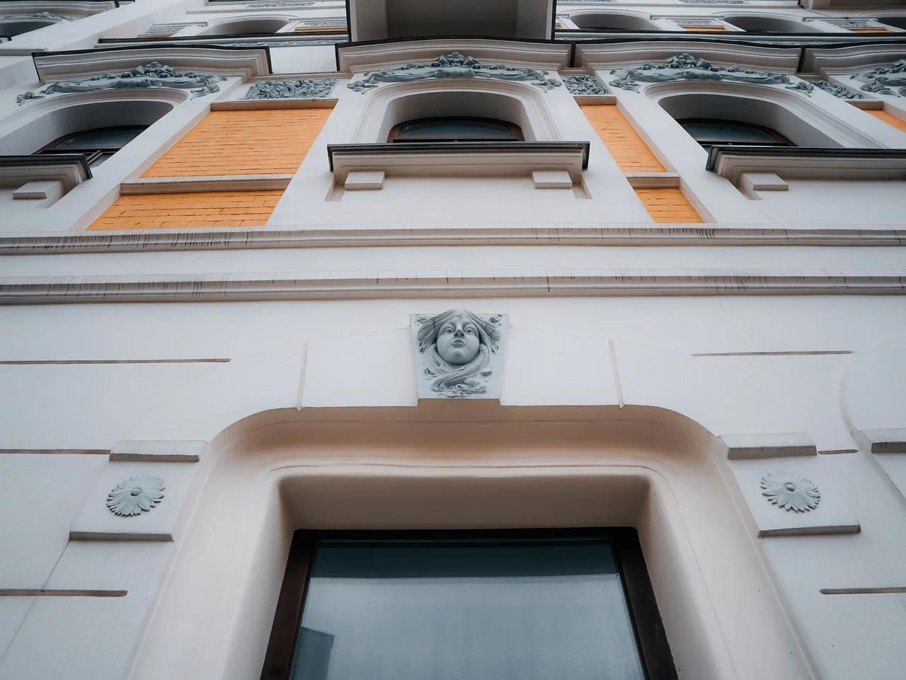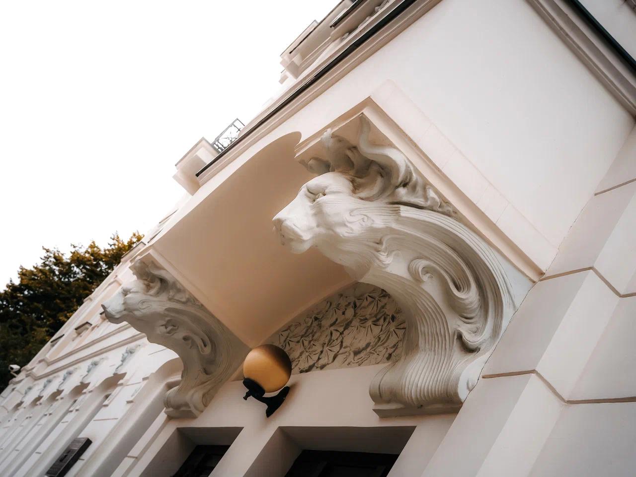 Лепнина характерна для модерна: девы-лорелеи над окнами первого этажа, головы львиц в качестве консолей, поддерживающих эркер, разнообразные цветочные мотивы, листья и плоды каштана. Над входом расположено рельефное панно с листьями и плодами каштана — один из ключевых декоративных акцентов. В замковых камнях наличников встречаются аккуратные женские маскароны.