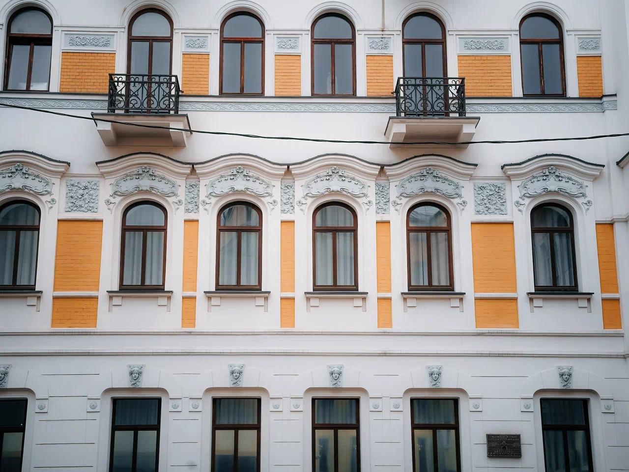 Третий этаж также объединяет штукатурку и кирпич; наличник с волнообразным фронтоном «перебирается» на окно ризалита и декорирован в общей тематике этажа; подоконные панно выполнены в виде венков из травяных побегов, аналогичный мотив присутствует в тимпане; фасад дополнен рельефной тягой и фризом между окнами. Верхний (четвёртый) этаж гладкий и светлый, что визуально облегчает верх постройки; здесь повторяются подоконные панно с травяными венками и объединяющий окна растительный фриз; эркер завершается крупным фронтоном со скульптурным картушем и гирляндами, под фронтоном — небольшие квадратные панели. На верхних этажах ритм окон прорезан двумя парами небольших балкончиков с ажурными металлическими ограждениями; ковка и литьё — типичные для модерна приёмы. В целом сочетание цветов, фактур и рельефного декора формирует цельный и благозвучный образ.