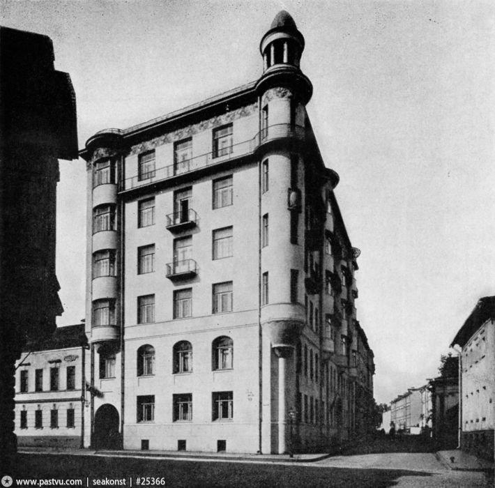 В 1909 г. супруги Любовь Васильевна и Александр Иванович Шамшин перестраивают купленную недавно усадьбу на Знаменке. Архитектор Н.Н. Благовещенский сделал проект шестиэтажного доходного дома, фасады которого выходили на Знаменку и Староваганьковский переулок. Но А.И. Шамшину декор дома показался скучным и он заказал архитектору Ф.О. Шехтелю новый проект фасада и внутреннего декора. У дома таким образом оказалось два автора — планировка сделана Благовещенским, декор — Шехтелем.