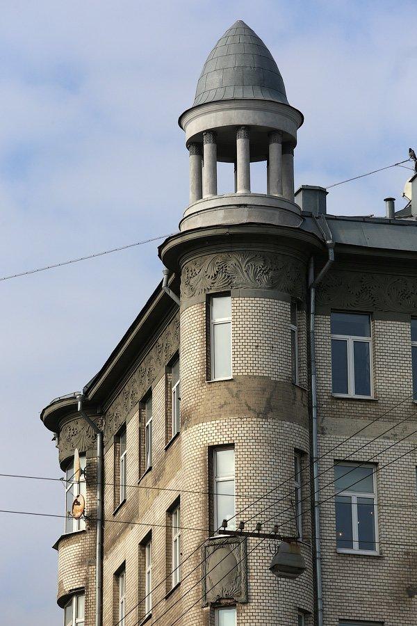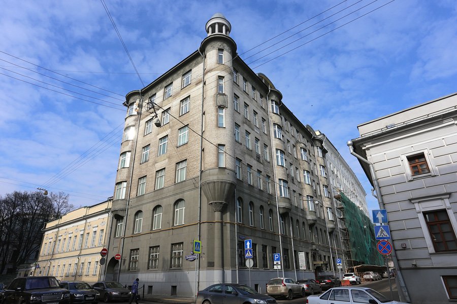 Шехтель акцентировал внимание на угол здания. Два фасада по улице и переулку как будто стянуты угловым эркером с башенкой. Она перекликается с бельведером дома Пашкова, что создает хорошую видовую перспективу. Эркер как будто опирается на колонну, капитель которой декорирована рельефом в виде репейника. Фасад имеет довольно строгий декор без излишеств. Его ритм разнообразят вертикальные эркеры. Разная отделка оттеняет горизонтальные акценты: два первых этажа отделаны цементной штукатуркой под камень, остальные четыре этажа — глазурованным кирпичом. Раньше декор был значительно богаче за счет ленточного балкона, опоясывающего весь верхний этаж, перила которого были сделаны в виде мелкой речной волны, почти ряби. Плоскость стены также разнообразили небольшие балкончики средних этажей. Сейчас сохранился только декор подъезда и козырька, входного вестибюля и парадной лестницы. Этот дом одним из первых оснастили новым техническим изобретением — лифтом. Парадный вестибюль до сих пор украшают маски женщин в египетском стиле.