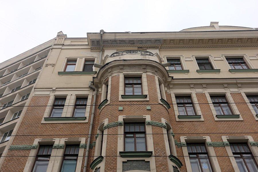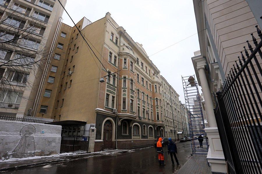 Еще несколько лет назад вместо правого трехстворчатого большого окна на первом этаже располагалась арка, ведущая в обширный внутренний двор здания. Однако сегодня двор этот застроен: вместе с тыльной частью доходного дома он превращен в один из корпусов поликлиники № 1 Управления делами Президента РФ, а арка заложена.