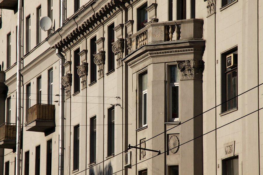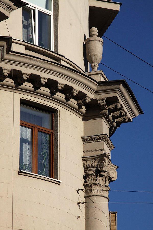 Огромное здание занимает весь торец квартала между Вишняковским и 1-м Новокузнецким переулками. Скругленный угол в виде ротонды. Сам фасад вертикально вытягивают полуколонны гигантского композитного ордера. Их антаблемент украшен декоративными вазонами. Центр фасада выделен гранёным двухэтажным эркером. Центральный и боковые ризалиты декорированы плоскими композитными пилястрами, визуально объединяющими второй-четвёртый этажи. Над окнами четвёртого этажа проходит раскрепованный карниз с частыми лепными кронштейнами-сухариками, который оформляет верх ротонды. Подъезды дома оформлены тонким рустом.