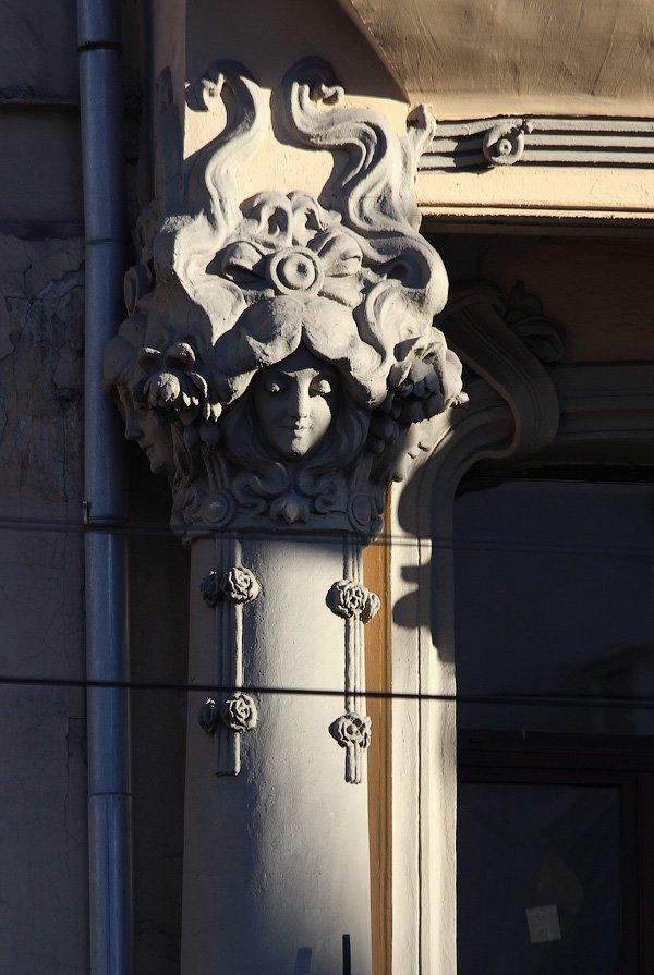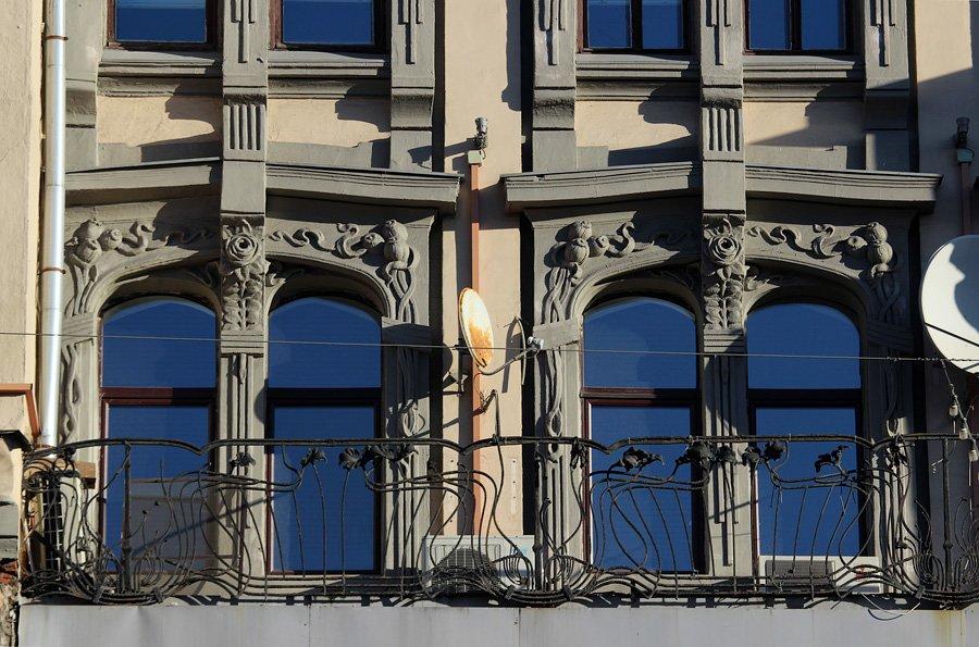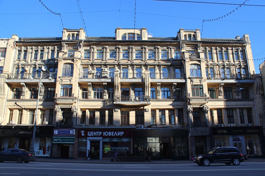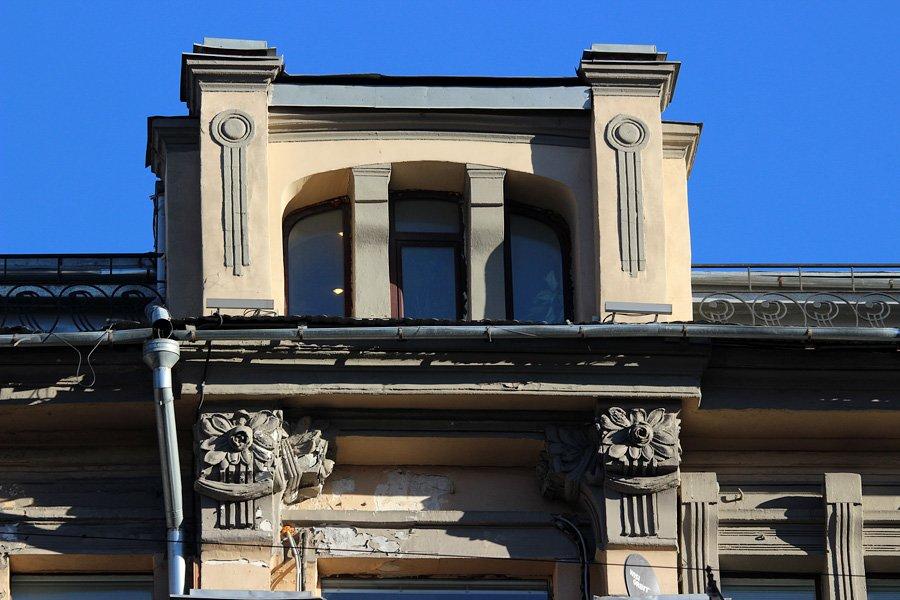Карл Гиппиус – крупный московский архитектор, много строивший для семьи Бахрушиных в разных их владениях. В его творчестве присутствуют разные течения, мотивы модерна. В этом доходном доме явно присутствуют мотивы французского ар нуво. Его фасад имеет причудливый сочный декор – один из характерных образцов московского модерна. Самым запоминающимся декоративным элементом дома являются металлические огаждения балконов – тонкие стебли с качающимися венчиками цветов. Два эркера по бокам фасада поддерживаются короткими колонками с капителями в виде женских масок с развивающимися волосами – лорелеями. По всему фасаду на уровне 4 этажа тянется балкон, в кронштейнах которого тоже лорелеи, они же подпирают козырек дома в центре. Вообще это самый богато декорированный дом архитектора Гиппиуса.
