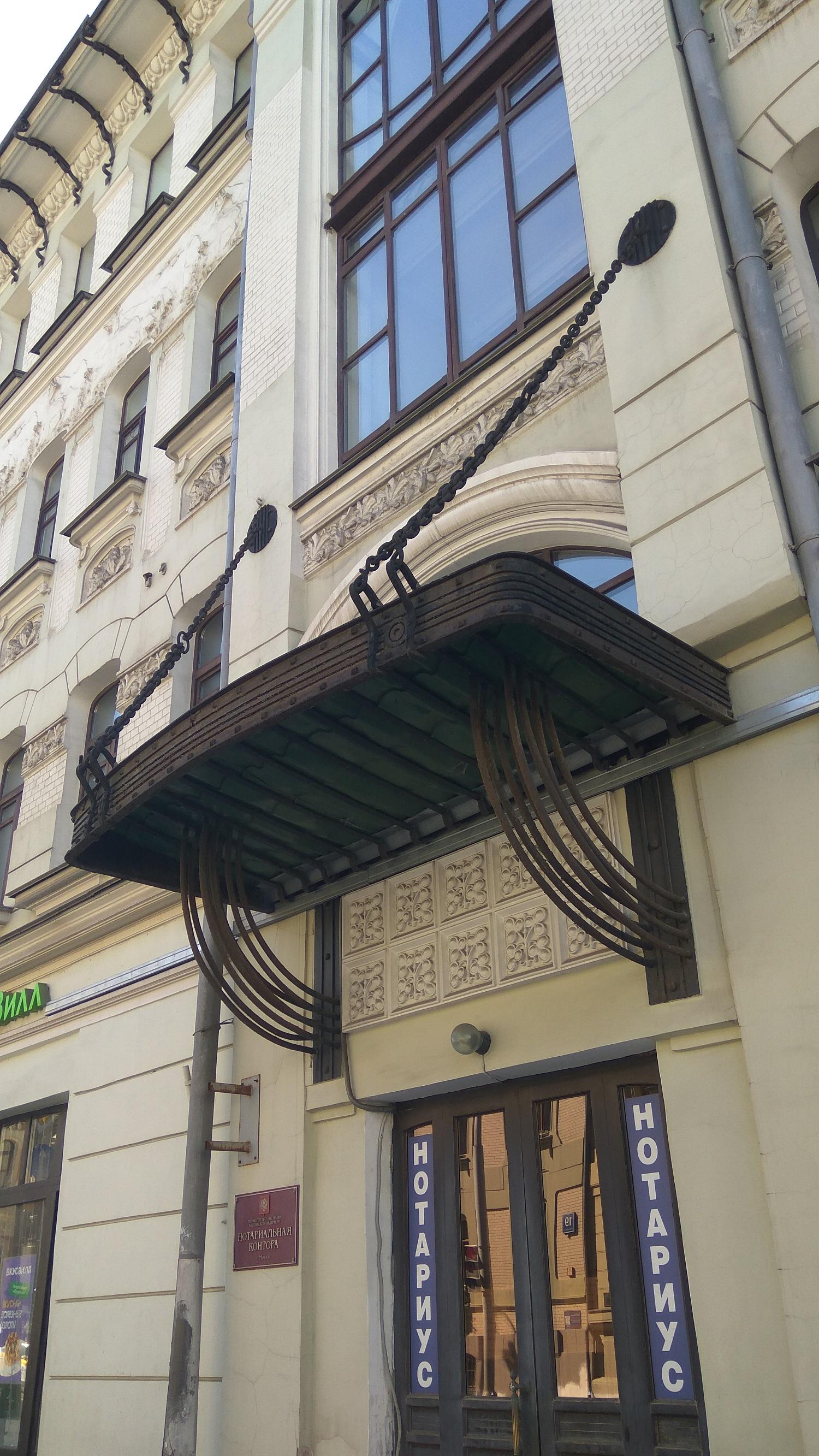 Примером могут служить металлические кронштейны, устроенные для поддержания далеко выступающего карниза и выполненные в духе бельгийского «Аар-Нуво», и металлический козырек, расположенный над центральным входом, больше напоминающий венский модерн.