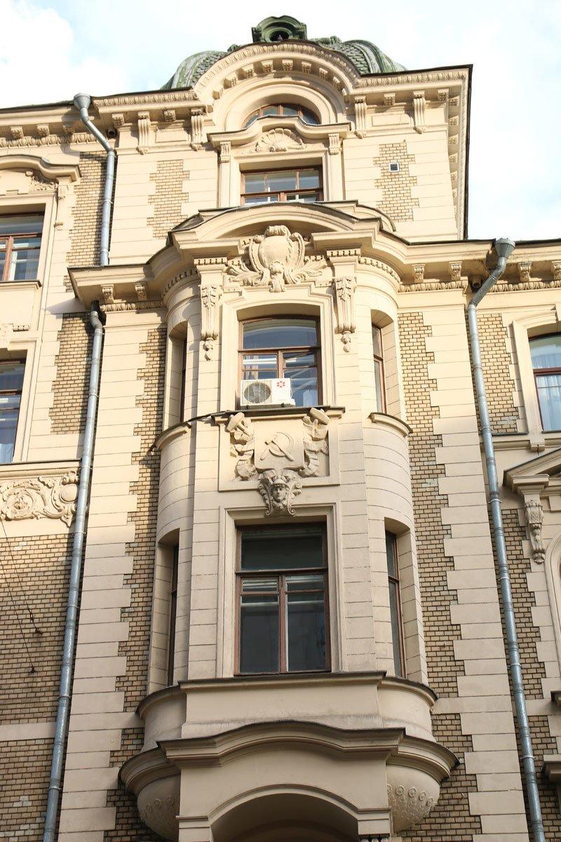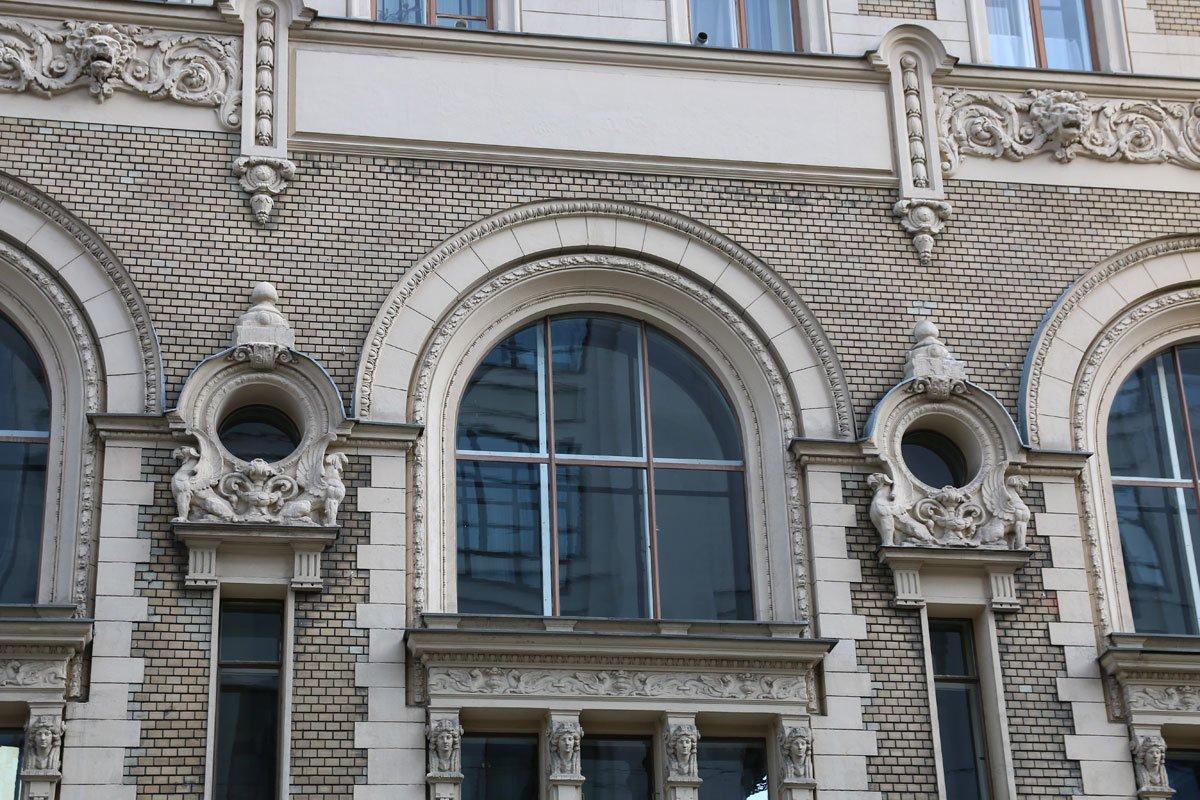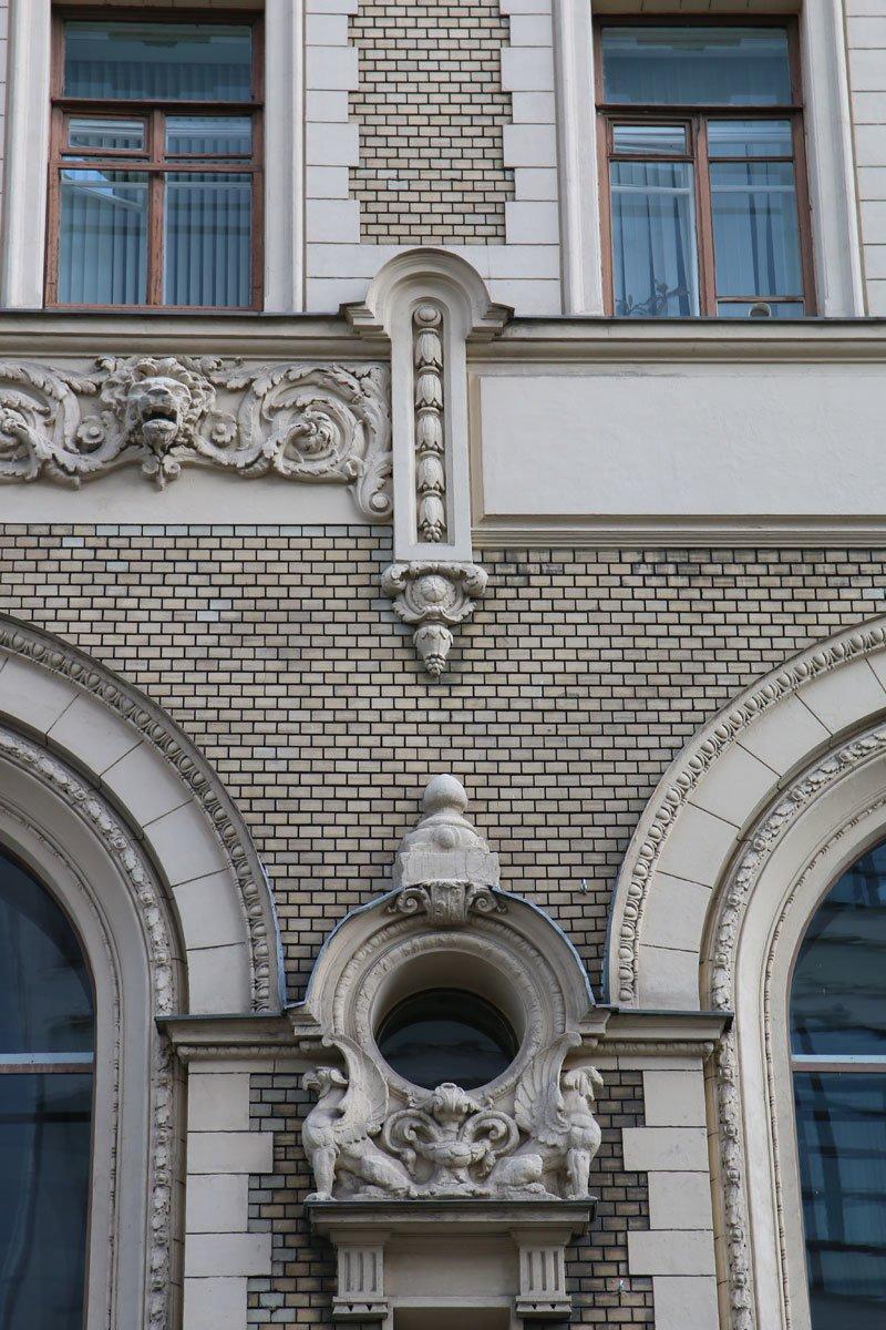 Интересной деталью оформления фасада являются медальоны между витринными окнами, на которых изображены профили крылатых грифонов — мифических существ, охраняющих сокровища. Эта символика как нельзя лучше подходила для здания, в котором размещались банковские учреждения.