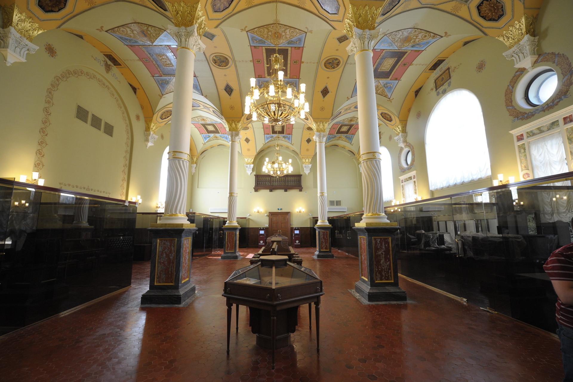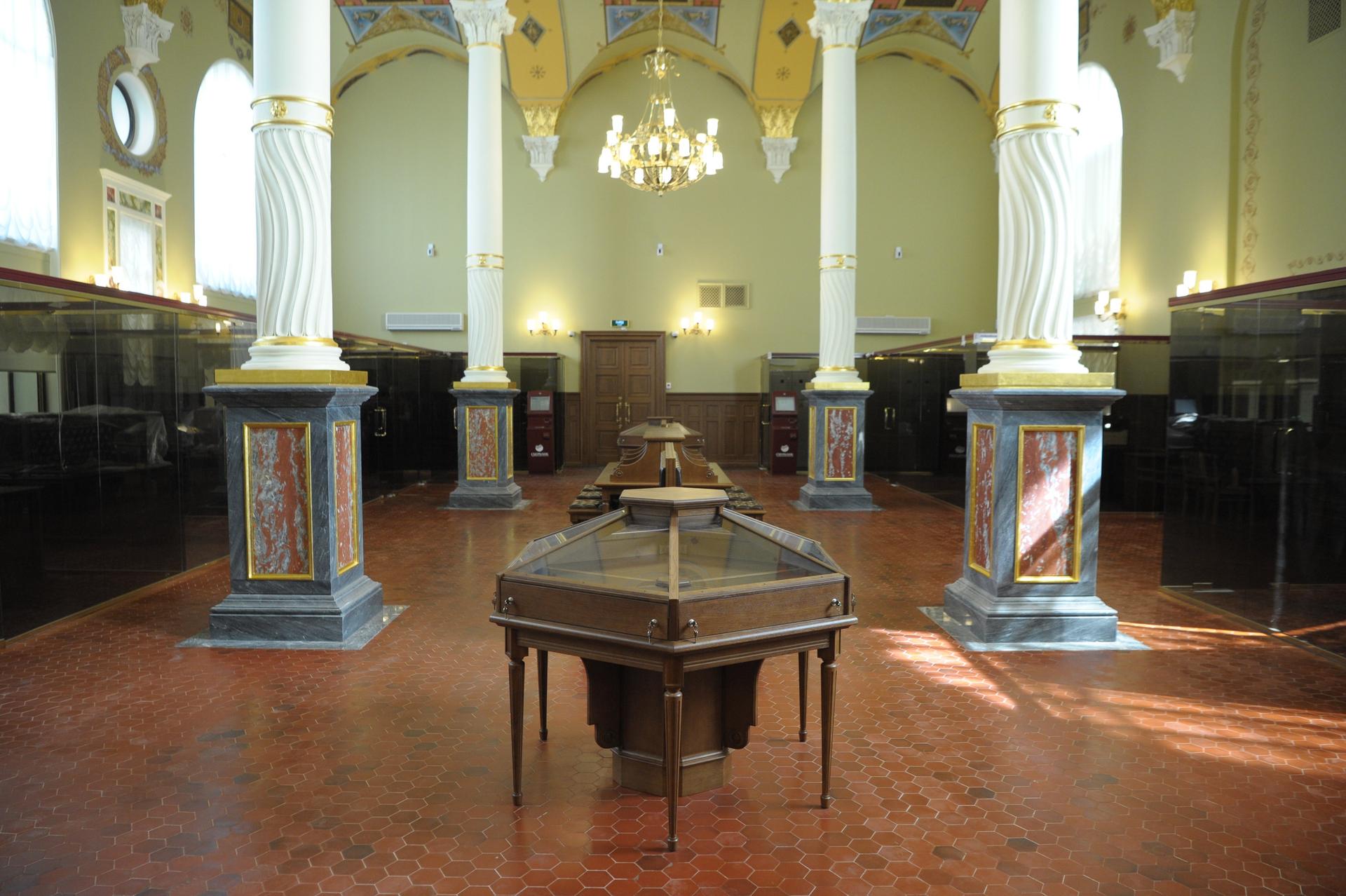 В результате реставрации и приспособления в зале появились невысокие стеклянные перегородки и мебель, выполненная в стилистике начала XX века из массива дерева. Среди новых элементов интерьера – две шестигранные витрины для размещения экспонатов в виде монет и ценных бумаг разных периодов, две двусторонних лавки с кожаной обивкой и шесть бюро со стульями для работы с бумагами.