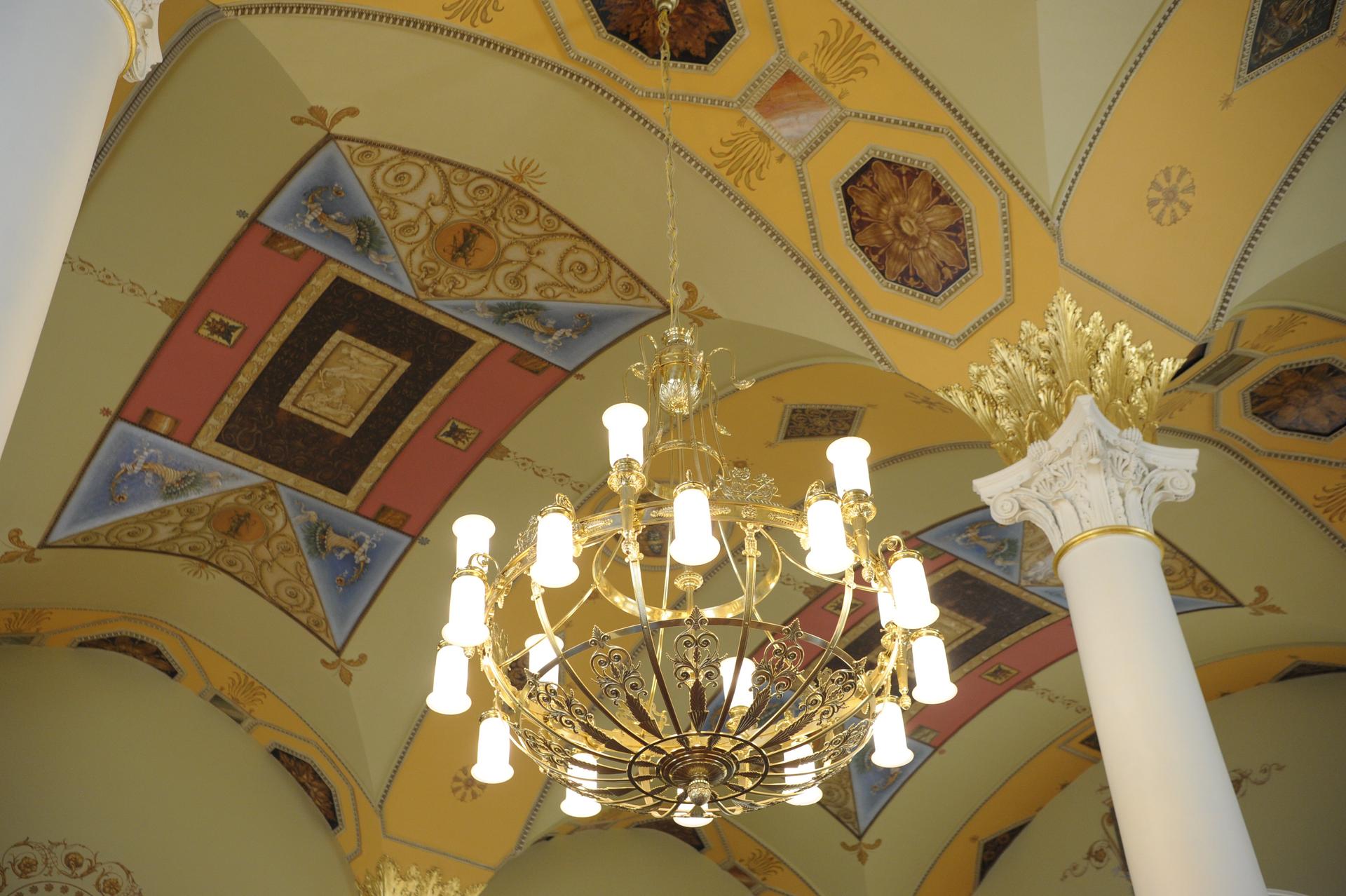 Реставраторы уделили особое внимание монументальной живописи потолочного плафона, выполненной на холстах и штукатурке. Автор росписи – художник Игнатий Нивинский – воплотил в жизнь задумку Клейна в виде античных сюжетов, исполненных с мотивами помпейской живописи. Специалисты бережно очистили живопись от загрязнений и укрепили красочный слой, сохранив авторский замысел.