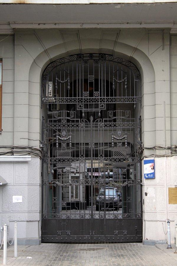 Внутрь дома ведут два высоких подъезда, расположенных в боковых крыльях здания, средний фасад прерывается высокой аркой, ведущей во внутренний двор и закрытой ажурными воротами. Подняться наверх можно по широкой лестнице, подъезды украшены лепниной, квартиры здесь имеют высокие потолки.