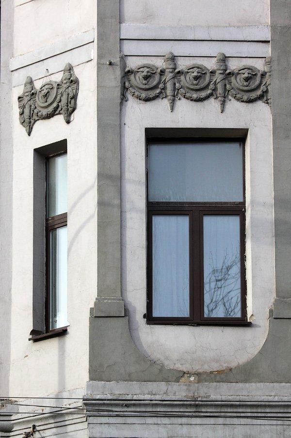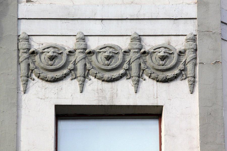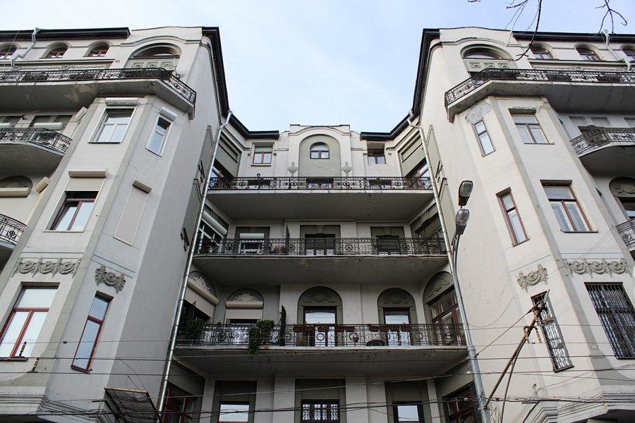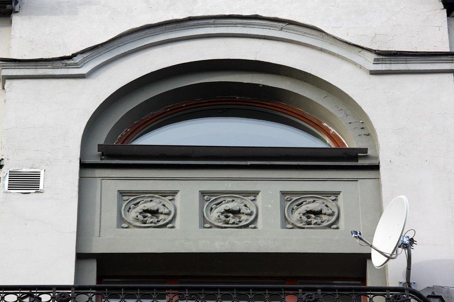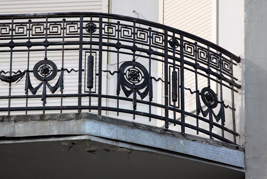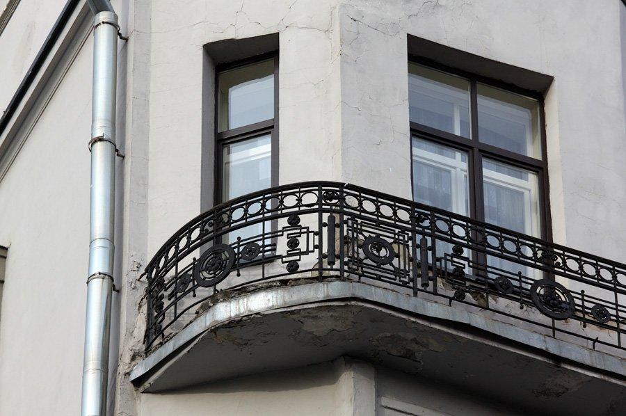 По всей длине фасада идут изящные балконы с кованными легкими решетками. Позднее длинные общие балконы станут «визитной карточкой» конструктивизма.
