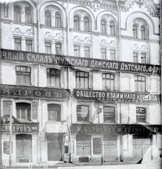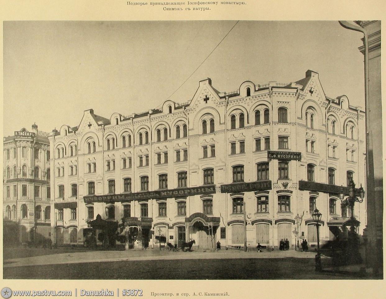В 1882-1884 году архитектор А.С. Каминский построил для монастыря новое здание подворья, используя в его оформлении и готические, и старорусские детали и мотивы. Архитектор явно создавал ансамбль с уже имеющимся напротив зданием Ново-Троицкого подворья. Таким образом, площадь была фланкирована монументальными зданиями подворий двух крупнейших монастырей России. Помещения опять стали сдавать внаем. На первом этаже располагались многочисленные магазины: текстильный, купцов Битепажа и Люшта, мануфактурный, фирмы «Братьев П.и С. Третьяковых и В. Коншина», башмачный, купца Королева - на самом углу здания, чайный, купца Боткина, голландский магазин Эйхтмейера. Была также известня маклерская контора Свечина и Рахманова.