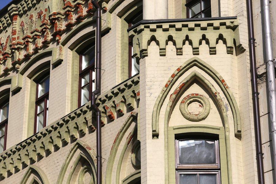 В 1897 г. архитектор Петр Павлович Щекотов выстроил красивый доходный дом в готическом стиле по заказу почетного гражданина Москвы Константина Федоровича Лазарева. Здание богато украшено портиками, резным декором, фигурными вставками, мозаикой, другими сложными архитектурными элементами и стилистически выделяется среди своих соседей.