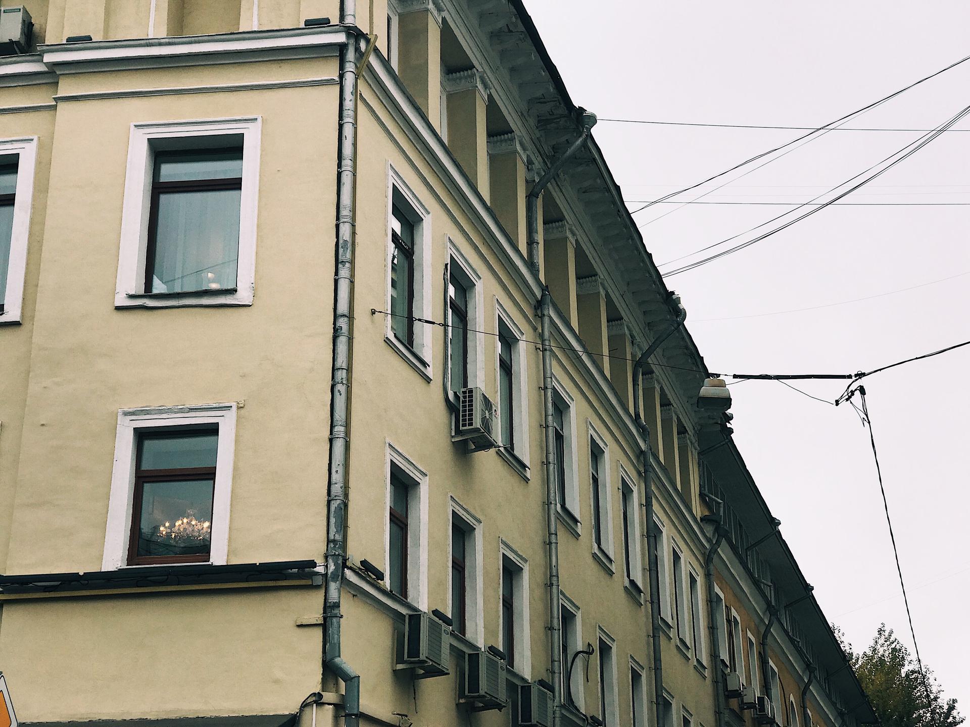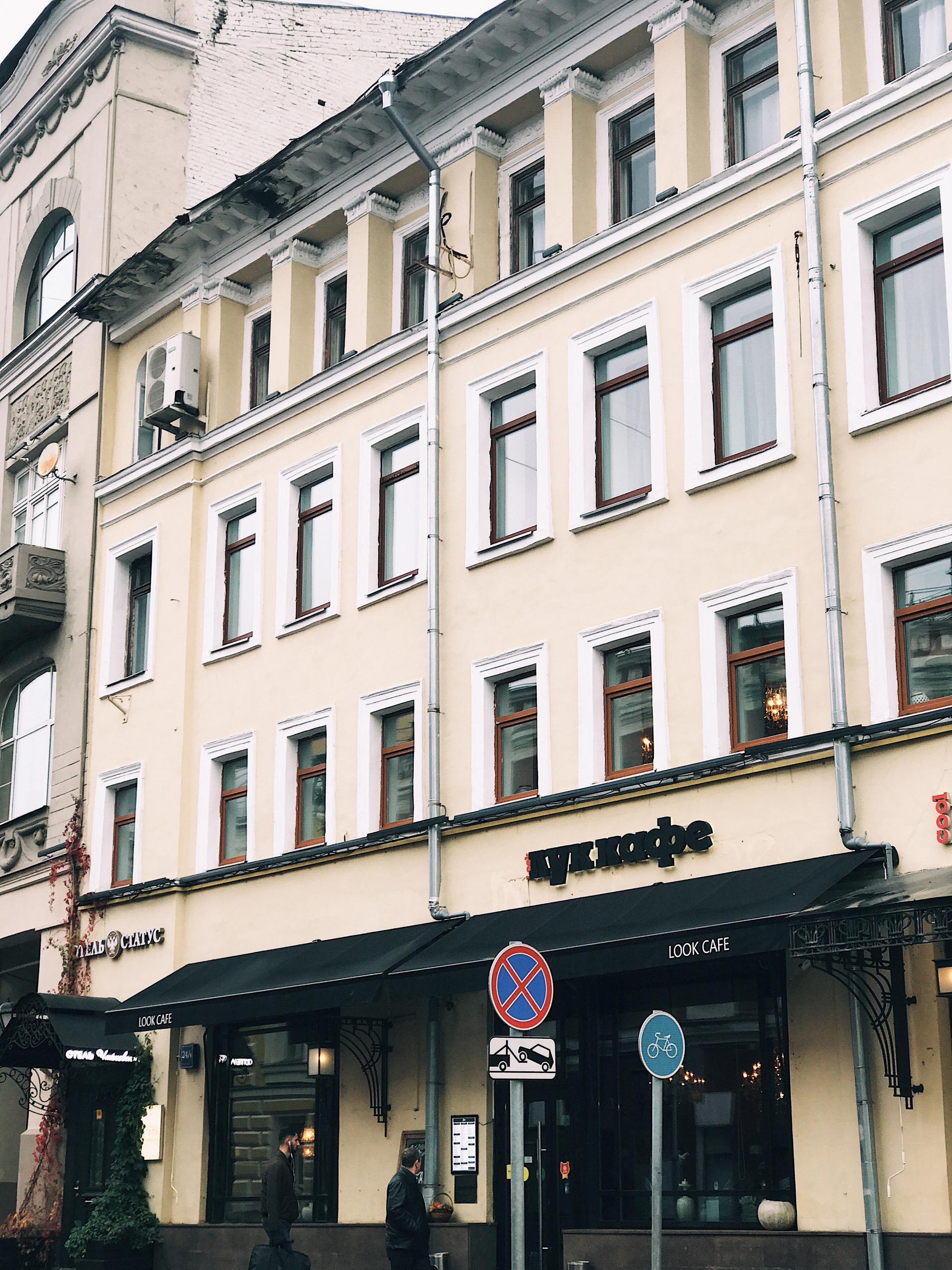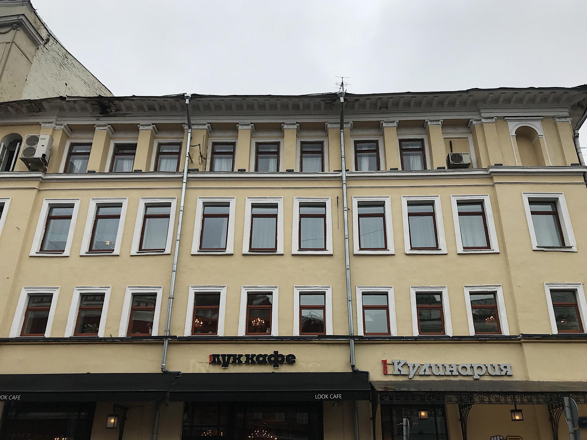 Новая жизнь владения началась в 1841 г., когда княгиня Голицына на углу Большой Никитской улицы и Хлыновского тупика построила четырехэтажный каменный жилой дом для квартир. Это был один из первых в Москве доходных домов, выстроенных специально для этих функций. В нижнем этаже были большие витринные окна для магазинов, по обеим сторонам витрин располагались два входа. Окна всех этажей были равной высоты ‒ достаточно радикальное решение для того времени. Автором проекта был известный московский архитектор М. Д. Быковский. Свой внешний вид этот дом не менял с тех пор. Утрачены только балкончики.