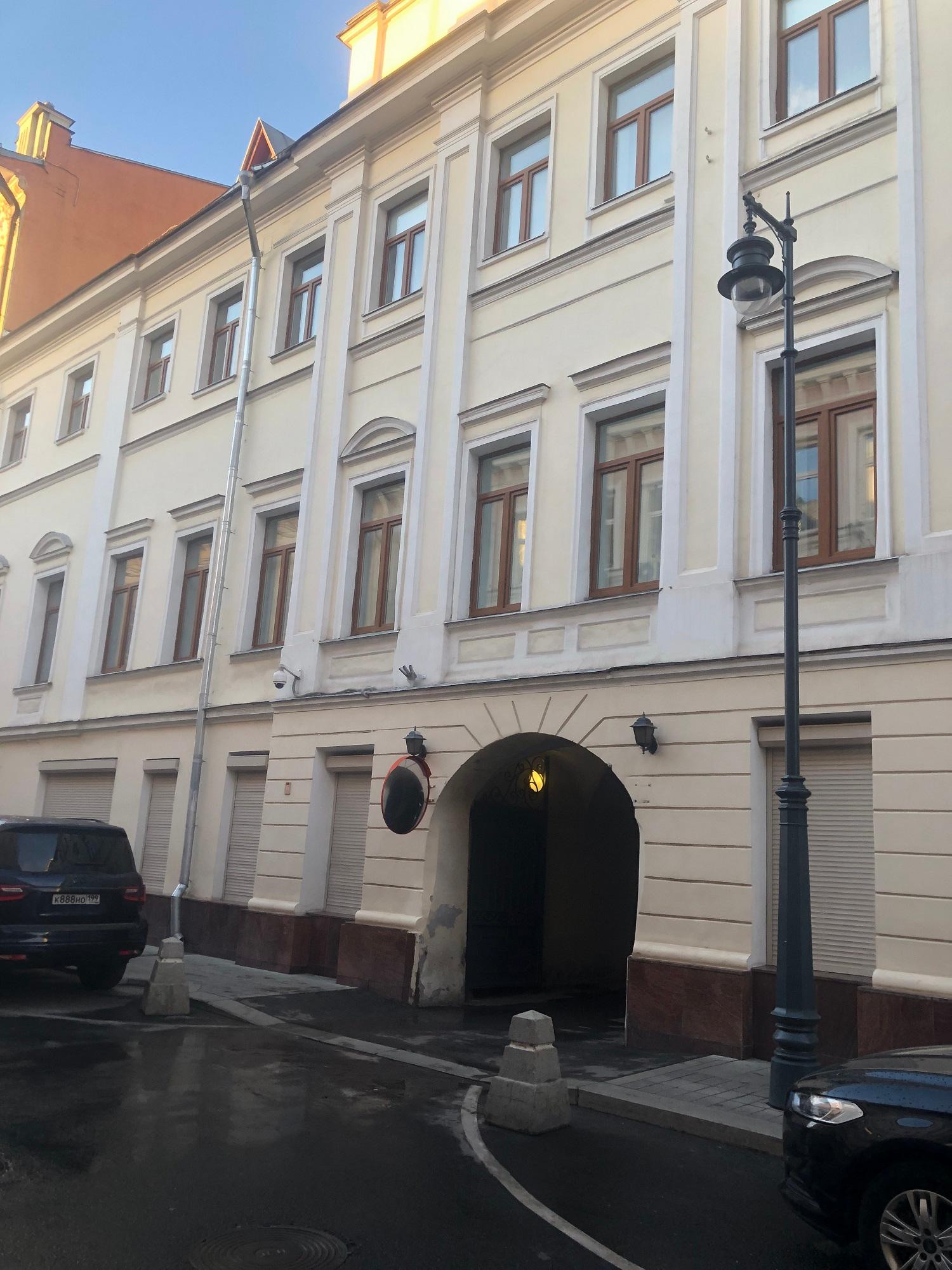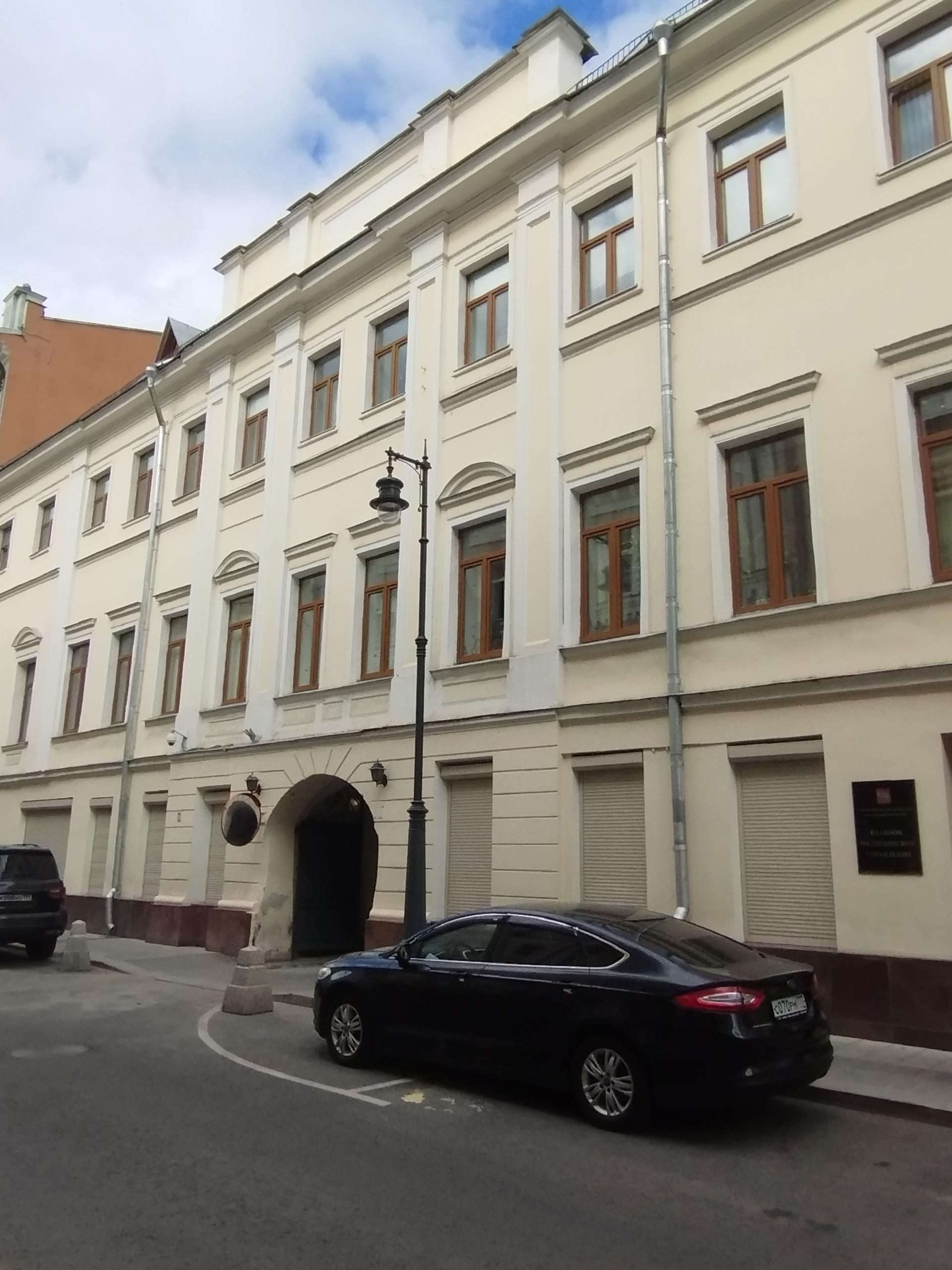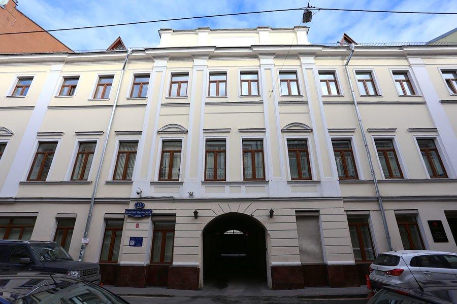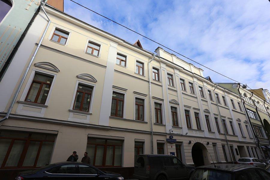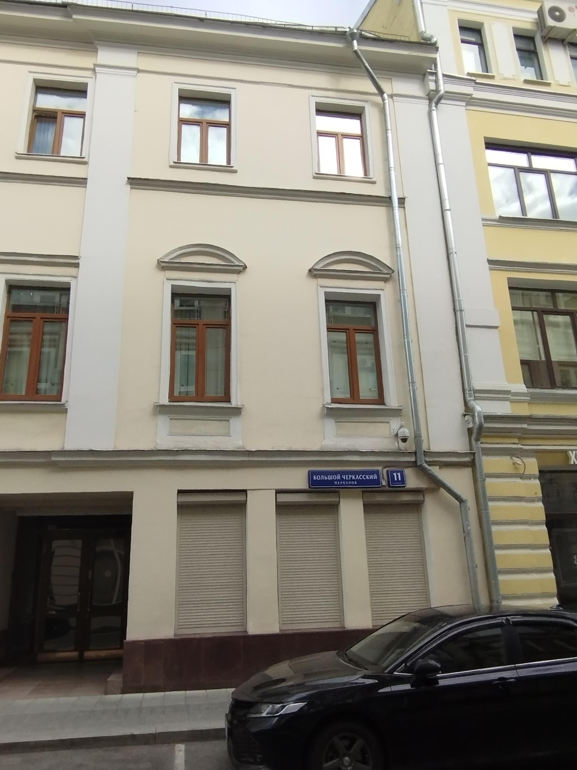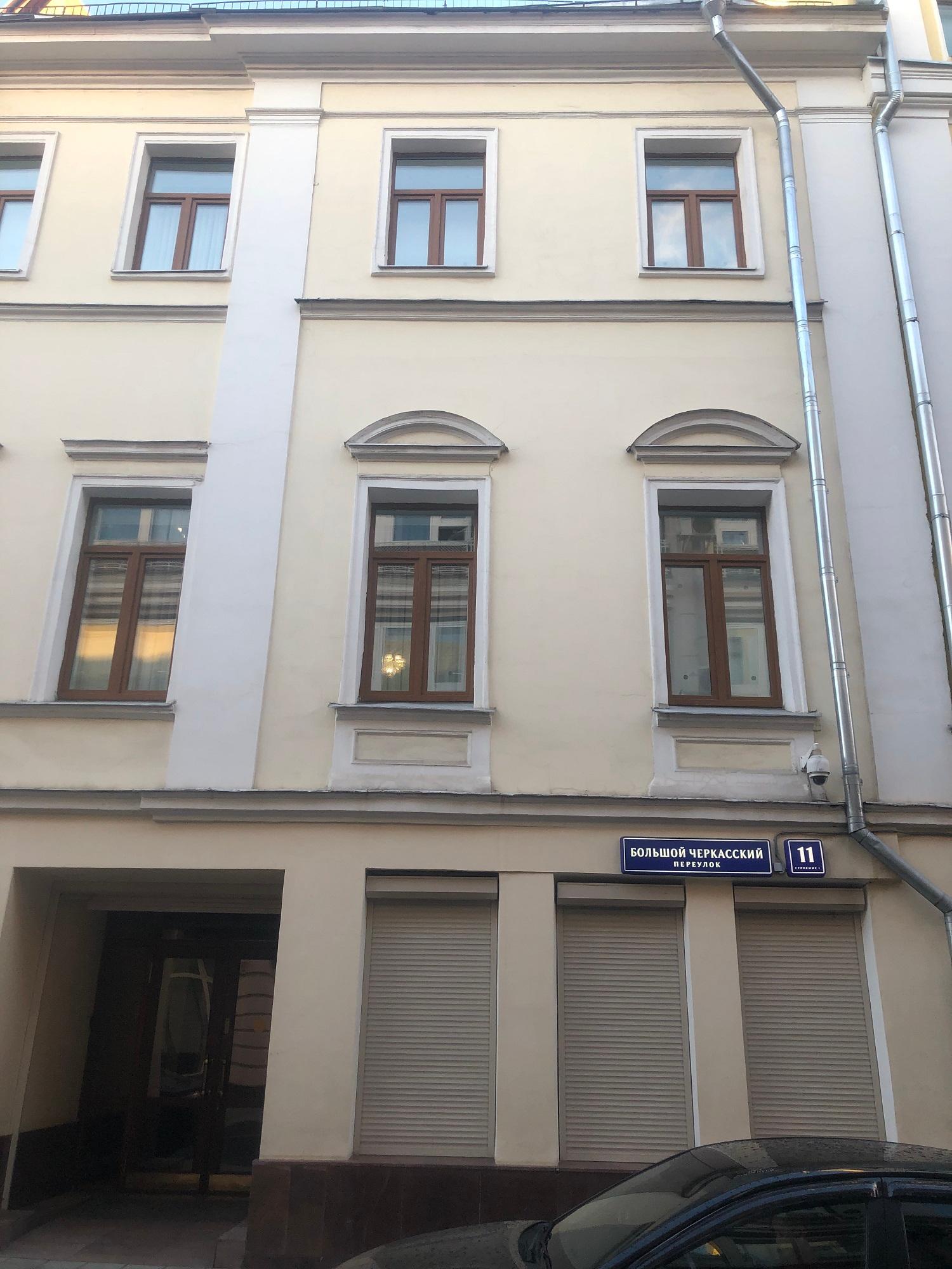 Здание торгового типа было построено тут после пожара 1812 года. Этот участок некогда составлял единое целое с участком № 9 и это был обширный двор князей Черкасских, именем которых и весь переулок получил название Большого Черкасского.