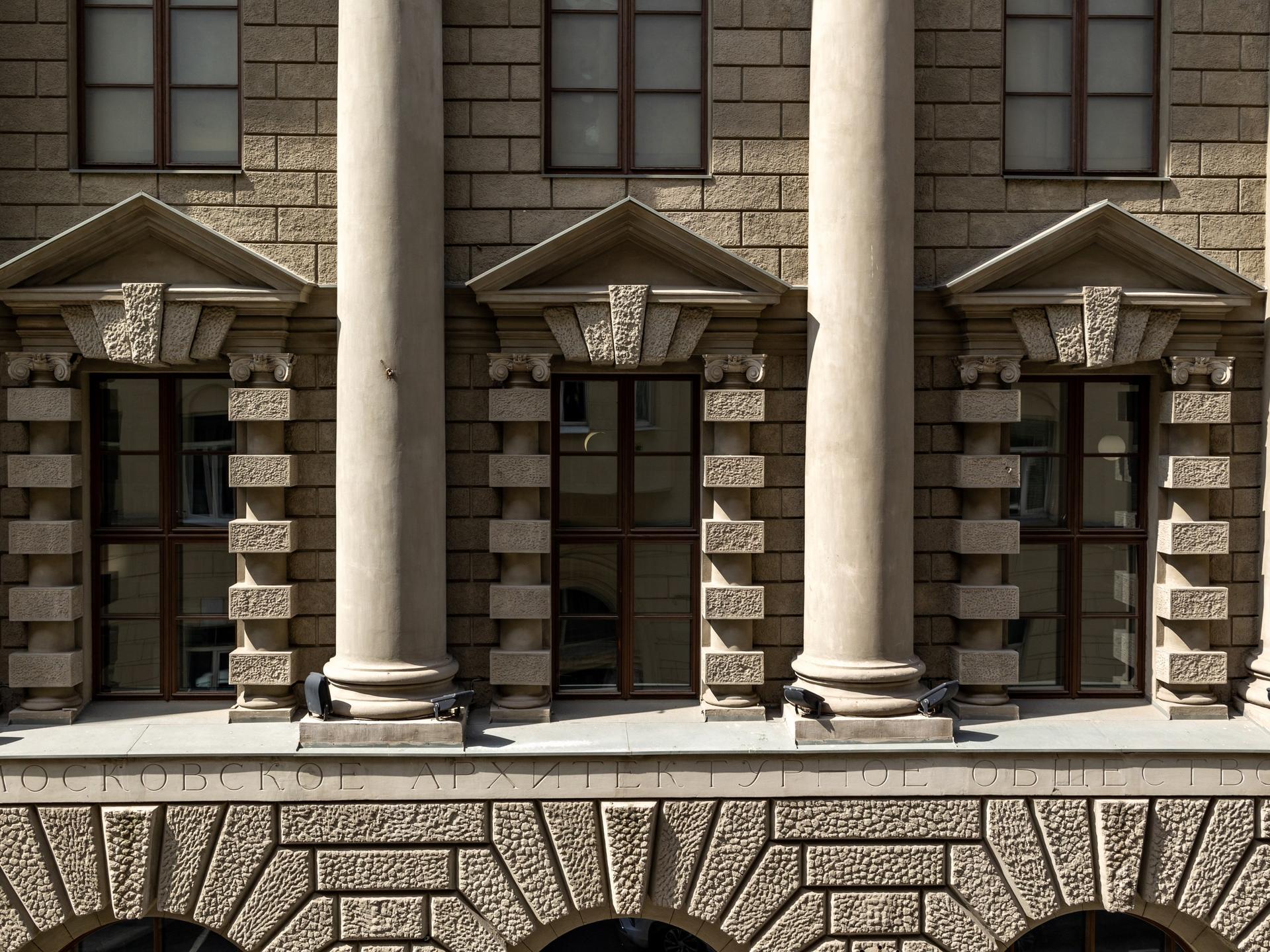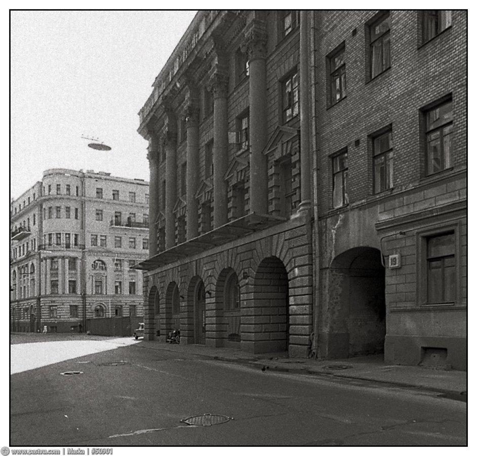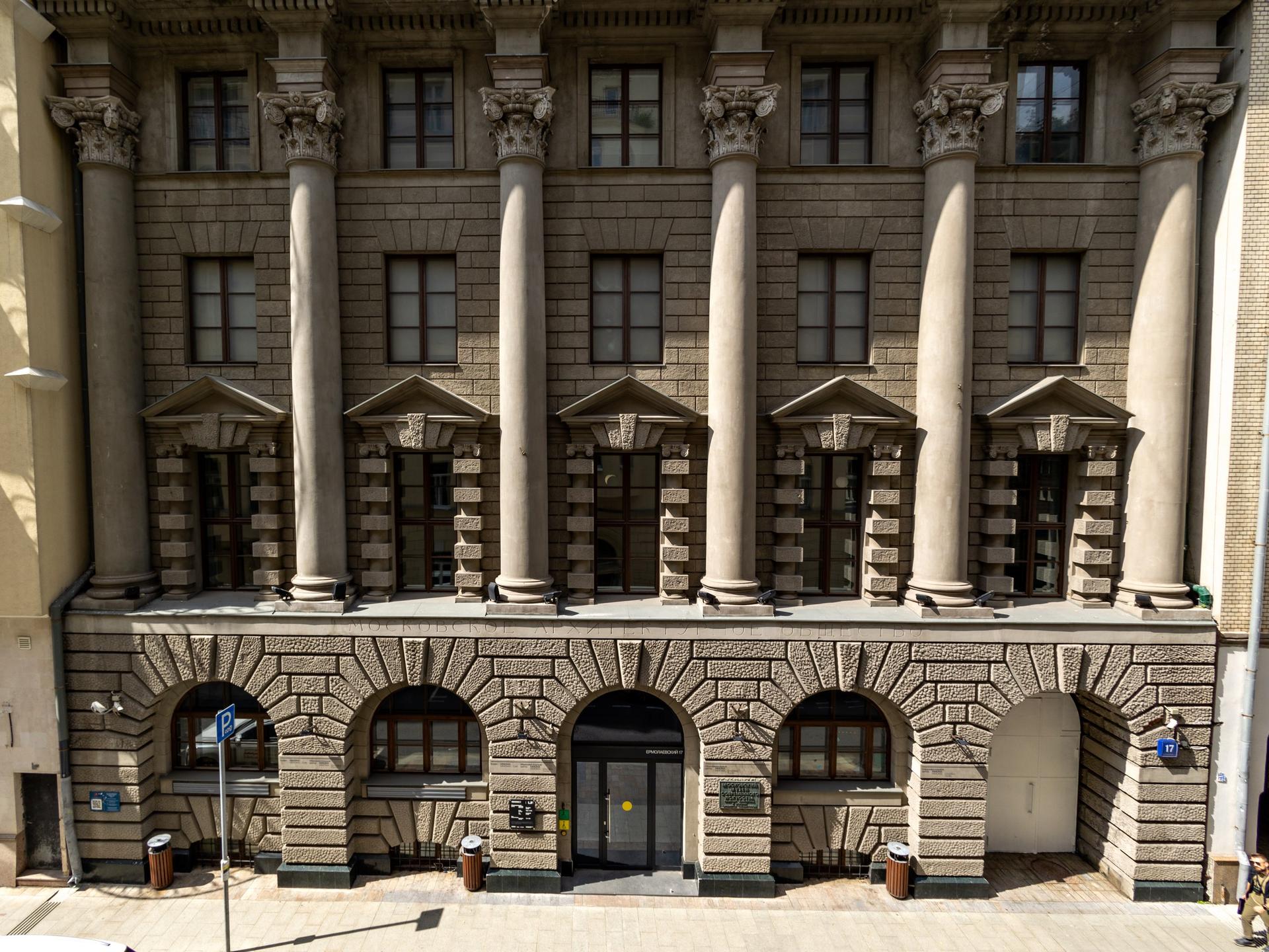 Впечатляющее неоклассическое здание в Ермолаевском переулке было построено в 1912-1915 гг. архитектором Д. С. Марковым и представляло собой доходный дом и клуб Московского архитектурного общества.