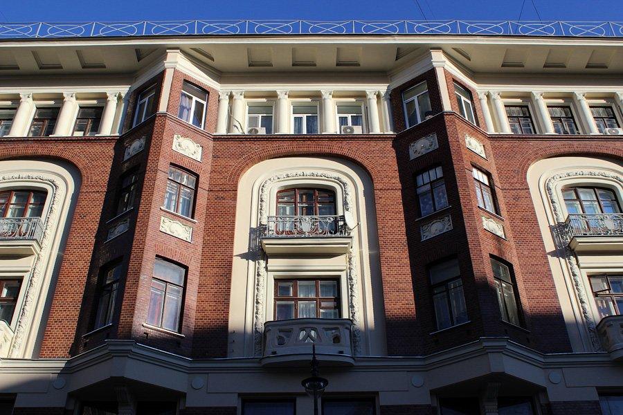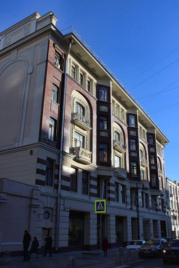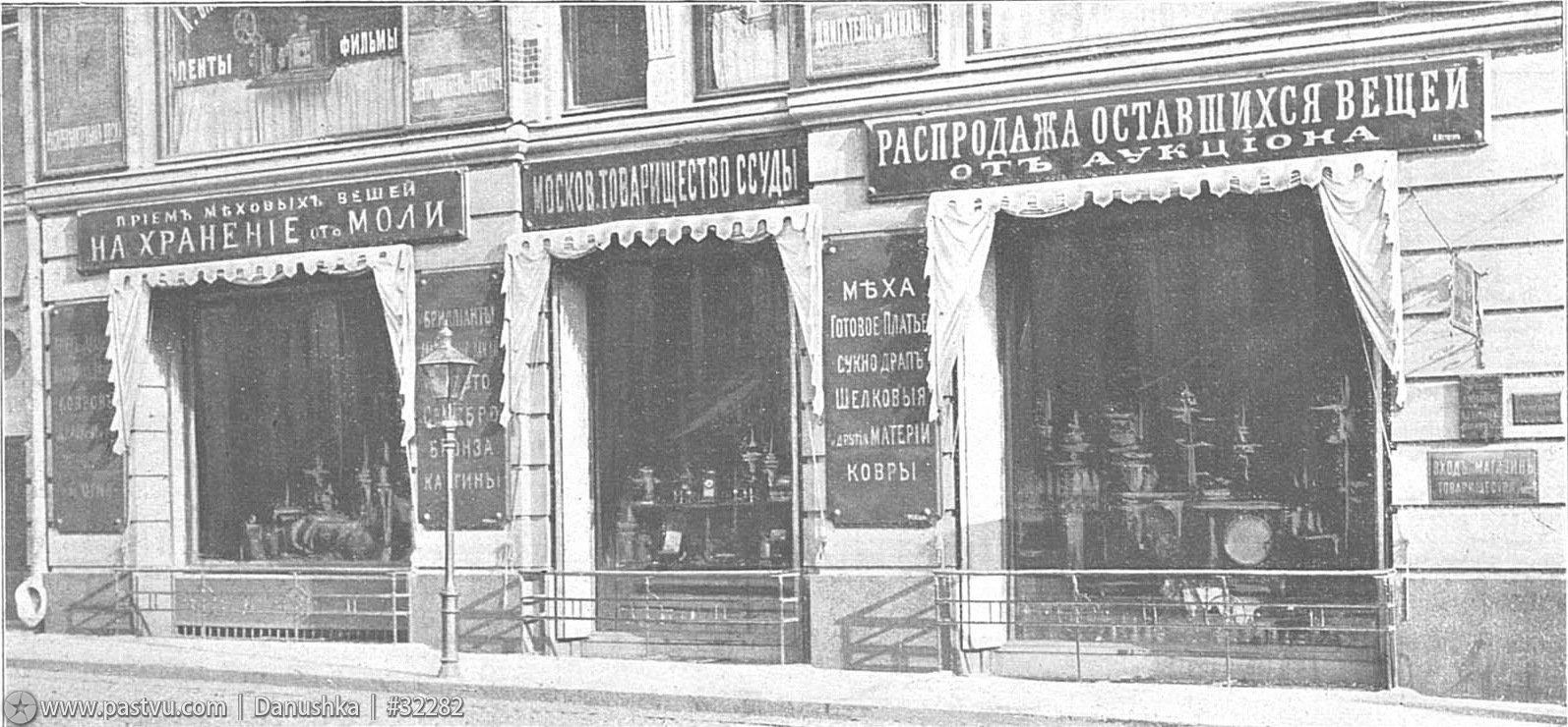 В 1904 году на Дмитровке вырастает пятиэтажный доходный дом, соответствующий всем требованиям: огромный подвальный этаж под склады магазинов первого этажа, лифты при парадных лестницах, хозяйственный корпус с прачечной и общественным туалетом во дворе, ванные и клозеты в квартирах, водяное отопление. Помимо магазинов на первом этаже размещаются правление, приемная, касса и канцелярия Товарищества, на втором – помещения Товарищества, представительство компании «синематографов Теофиль Пате» и квартиры, на пятом – шляпный магазин. Судя по описи, квартиры были большие - от пяти до десяти комнат. Что интересно, и после революции тут продолжал существовать ломбард, на конец двухтысячных годов сохранялись интерьеры залов ломбарда и многих квартир, а входящие в подъезд могли видеть необычную вывеску про «выдачу верхней одежды, тканей и обуви, принятых в залог» Собственно, ломбард есть здесь и по сей день, о чем можно прочесть на его сайте: «единственный функционирующий и по сей день - ОАО МГКЛ «Мосгорломбард». Датой рождения компании под государственным началом принято считать 5 июля 1924 года, когда постановлением Народного комиссариата финансов РСФСР был учрежден московский городской ломбард.