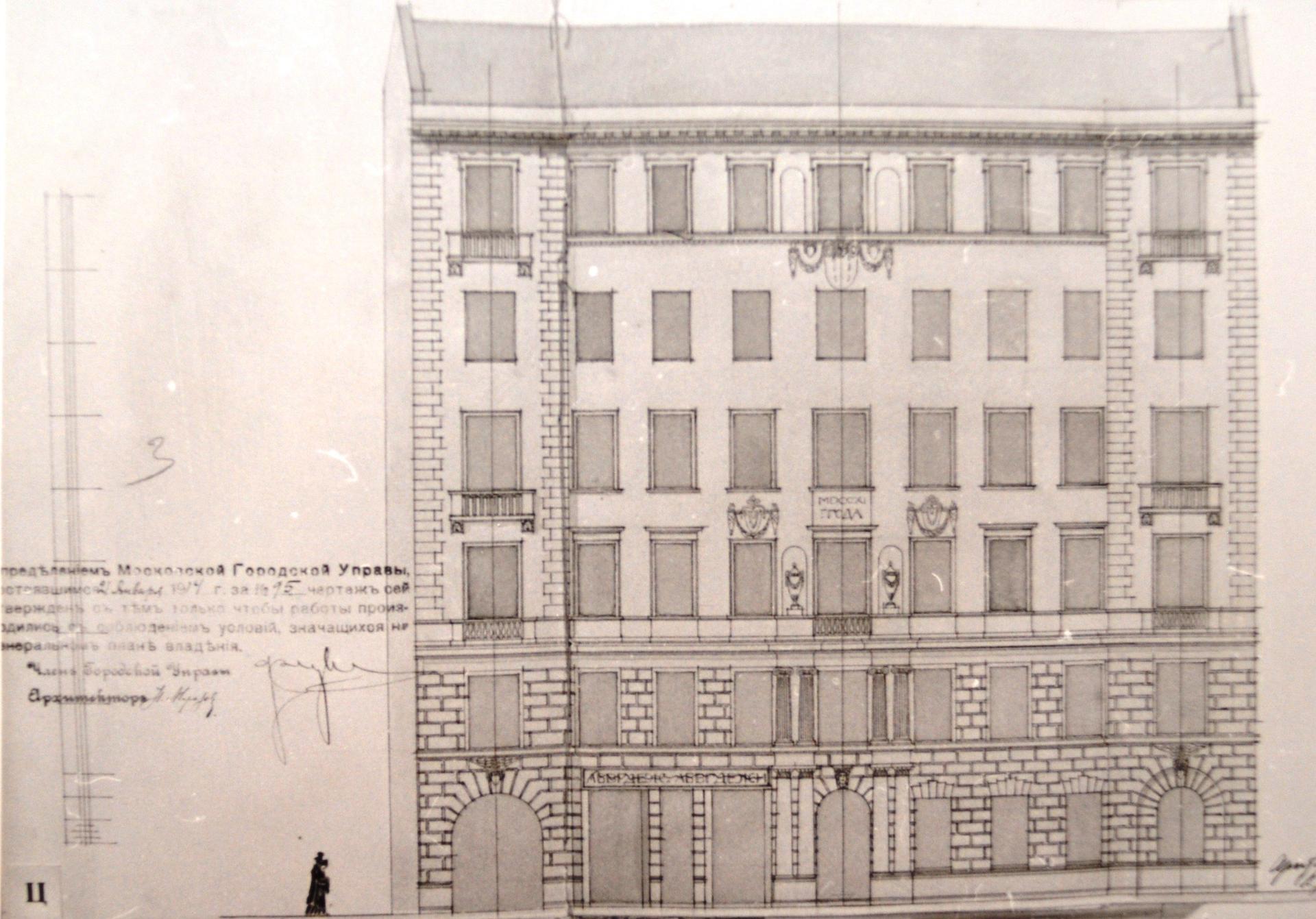 Дом в нынешнем его виде появился в 1914 году, когда вдова инженера Волобуева Ольга Назаровна выкупила старый дом, стоявший на этом месте и принадлежавший капельдинеру Императорского Московского театра Егору Кириллову, а затем московскому мещанину Лаврентию Федоровичу Соколову, снесла основное строение и несколько дополнительных и получила разрешение на постройку нового здания. В качестве архитектора Волобуева пригласила Владимира Дмитриевича Глазова, известного своей работой по перестройке гостиницы «Балчуг» и проектами особняка Г.П. Юргенсона, сына известного музыкального издателя, и дома врача-окулиста К. В. Снегирёва в Колпачном переулке.
