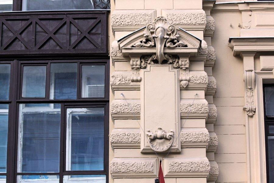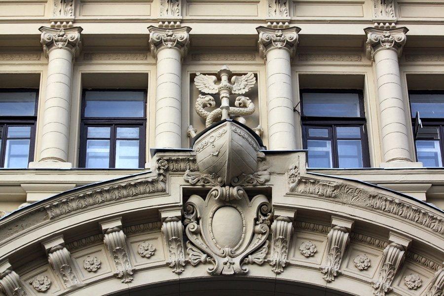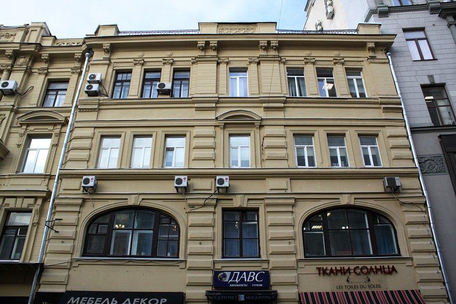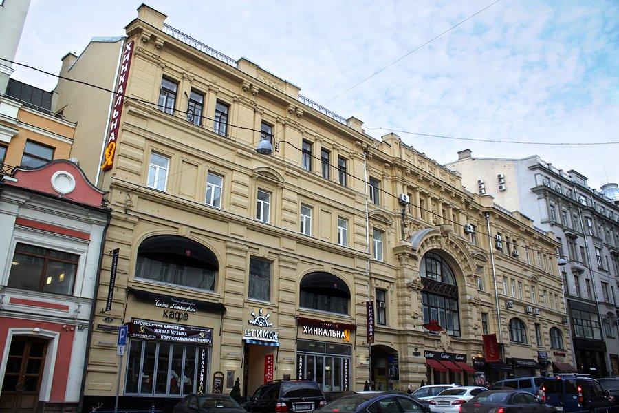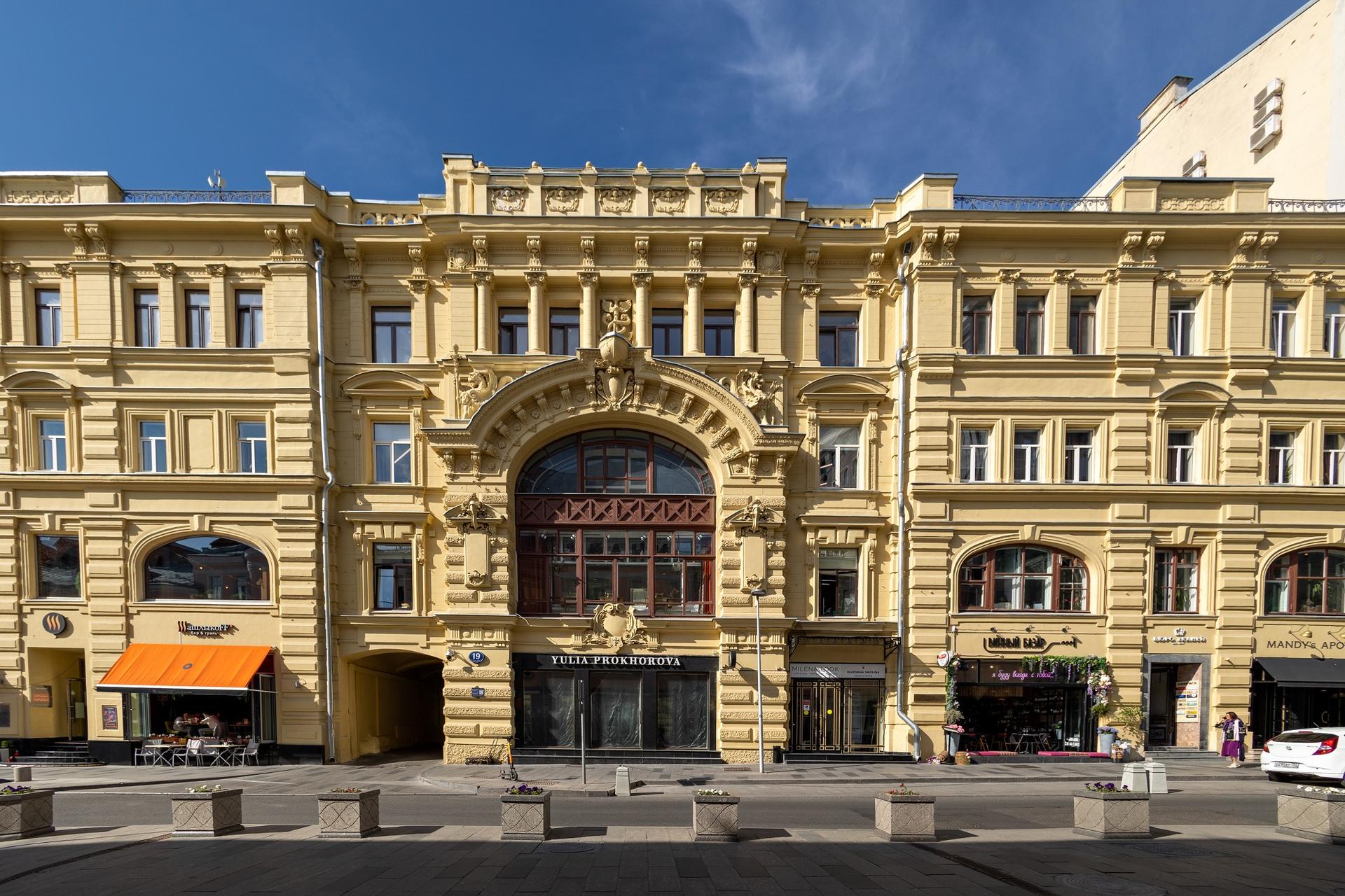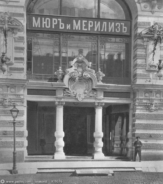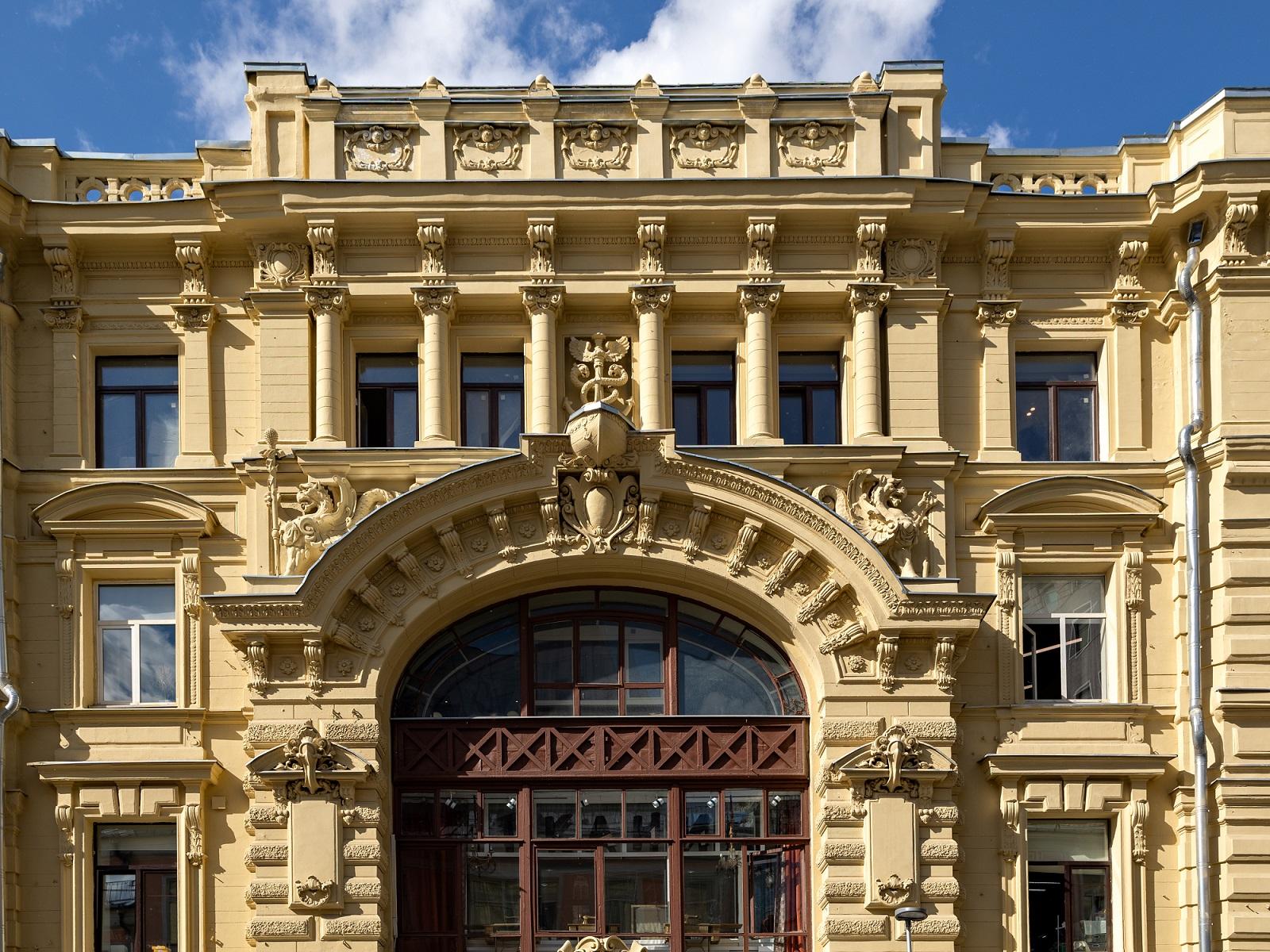 А в 1886 г. усадьба была перестроена по проекту В. Коссова. Вскоре здесь был открыт филиал знаменитого универмага «Мюр и Мерилиз», который торговал тут галантереей, канцелярией, посудой. Через десять лет, по пожеланиям владельцев «Мюр и Мерилиз», была осуществлена еще одна перестройка — теперь уже под руководством известного московского архитектора Р. Клейна, включившего главный дом и оба флигеля в единый архитектурный объем. Фасад здания получил богатый лепной декор, включающий в себя фигуры грифонов и кадуцей — жезл бога торговли Меркурия. В центре фасада обращает на себя внимание гигантское двухэтажное окно, в верхней части арки которого расположен горельеф, изображающий нос лодки с якорем.