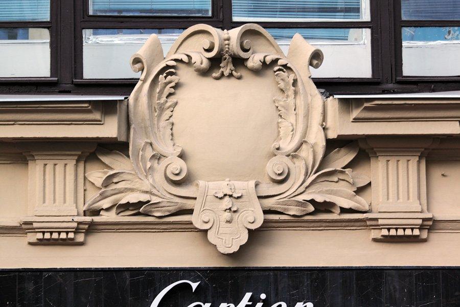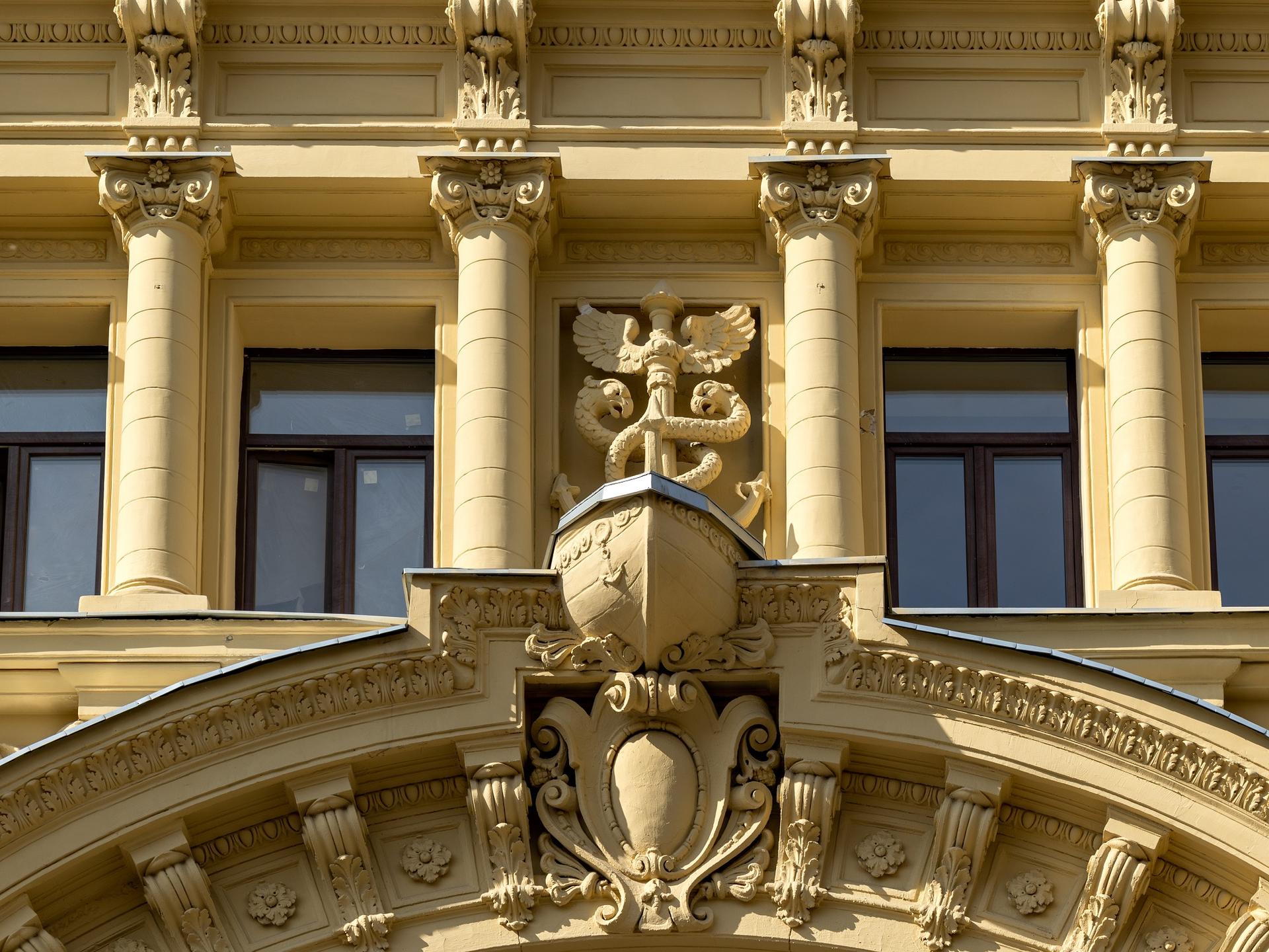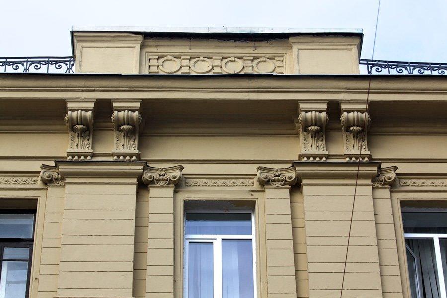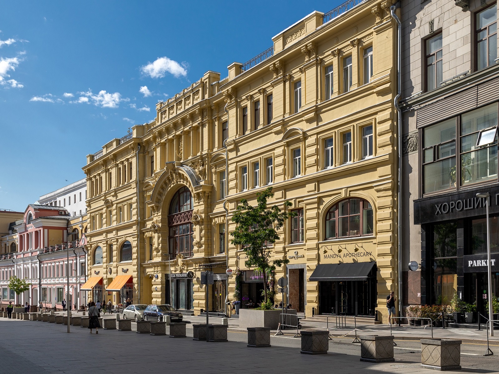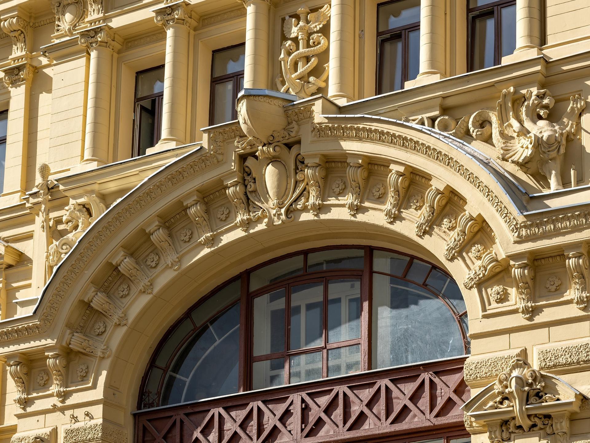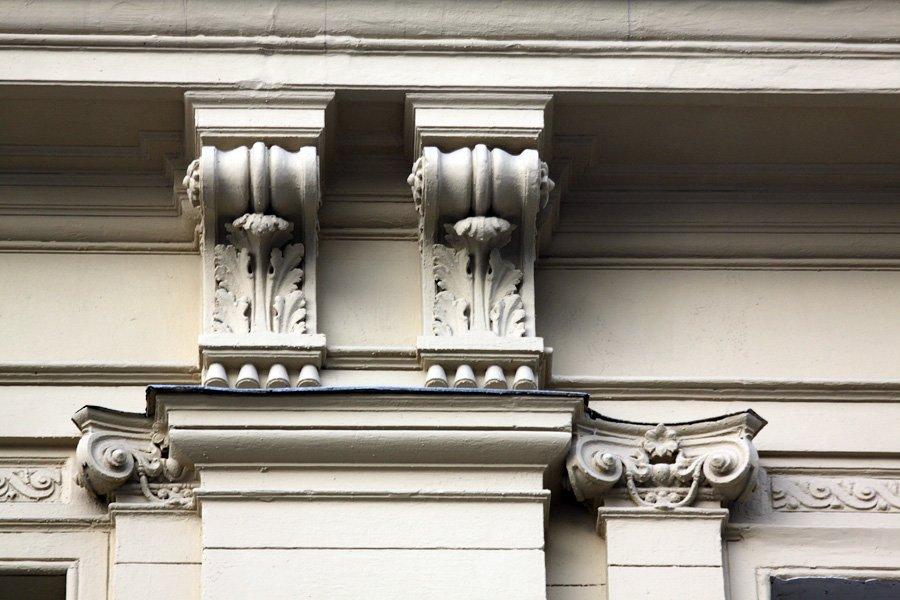 А в 1886 г. усадьба была перестроена по проекту В. Коссова. Вскоре здесь был открыт филиал знаменитого универмага «Мюр и Мерилиз», который торговал тут галантереей, канцелярией, посудой. Через десять лет, по пожеланиям владельцев «Мюр и Мерилиз», была осуществлена еще одна перестройка — теперь уже под руководством известного московского архитектора Р. Клейна, включившего главный дом и оба флигеля в единый архитектурный объем. Фасад здания получил богатый лепной декор, включающий в себя фигуры грифонов и кадуцей — жезл бога торговли Меркурия. В центре фасада обращает на себя внимание гигантское двухэтажное окно, в верхней части арки которого расположен горельеф, изображающий нос лодки с якорем.