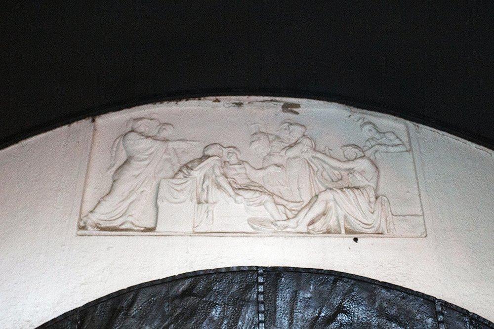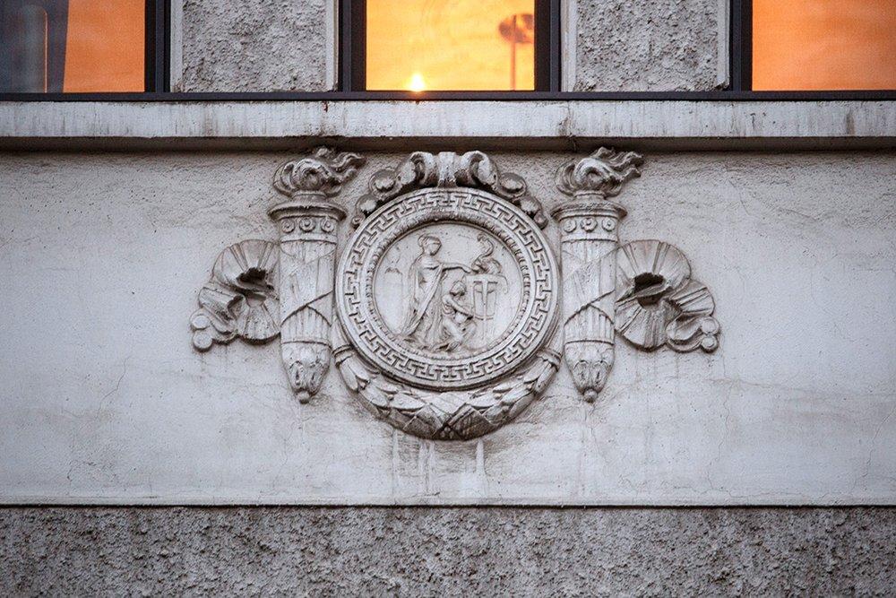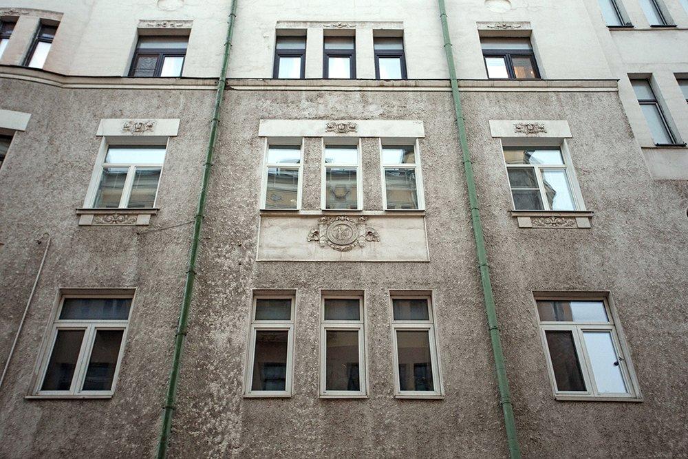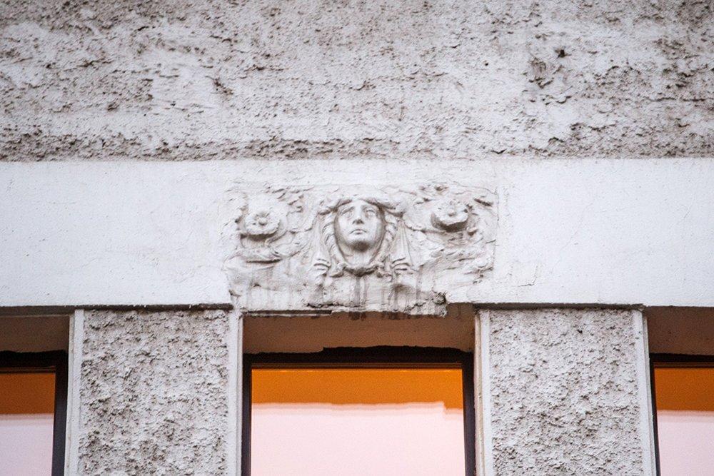 Дом имеет достаточно сдержанный асимметричный фасад, хотя большая часть фасада все же имеет симметрию со второго по пятый этаж. Первый этаж рустован, второй и третий покрыты «шероховатой» цементной шубой, четвертый и пятый – гладкой штукатуркой. Максимальное количество декора встречается на третьем этаже: прямоугольные вставки с лепниной над окнами и под ними. Там можно встретить детали, стилизованные под ампир 1820-1830-х гг.: медальоны с венками, гирляндами, факелами, а еще женские маски. Лепнина попроще украшает прямоугольные ниши над окнами четвертого этажа. Подлинные двери парадных подъездов не сохранились. Остались вставки с барельефами на античную тематику над этими дверьми.