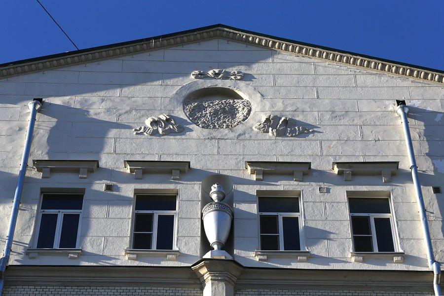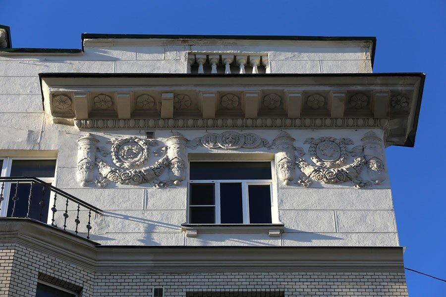Здание на Пятницкой улице – одно из самых высоких в этом районе – выполнено в традиционных для Москвы того времени формах неоклассики с крупными рельефными украшениями под карнизами. Обращают на себя внимание два гранёных эркера и ваза на декоративном кронштейне, расположенная в полукруглой нише по центру симметричного фасада. Капитально дом никогда не перестраивался и поэтому сохранил в основном свою внутреннюю планировку и отделку.