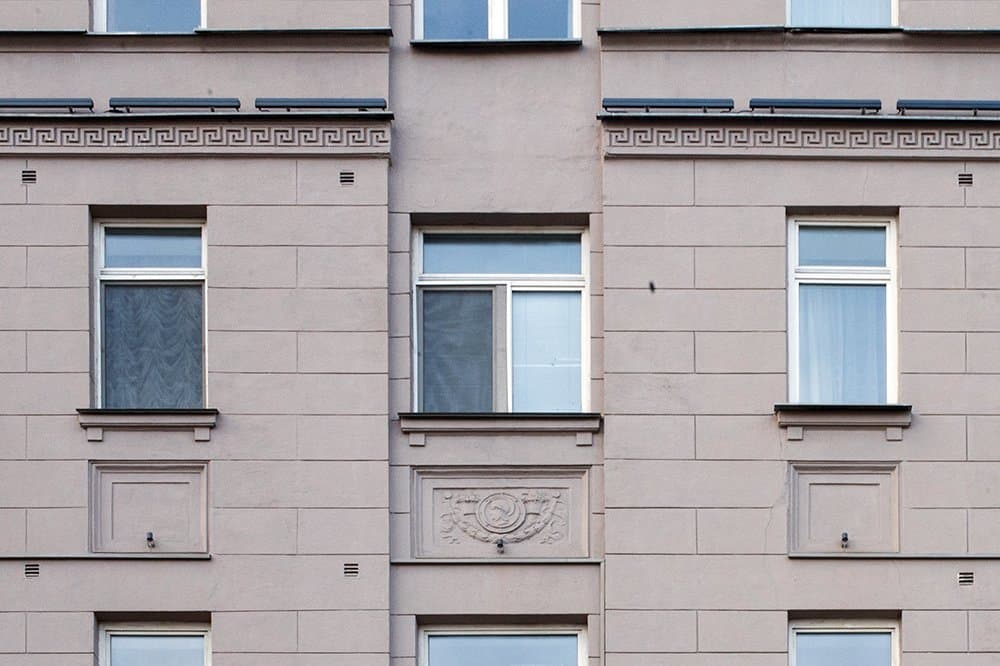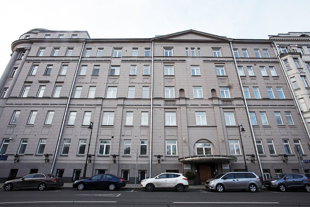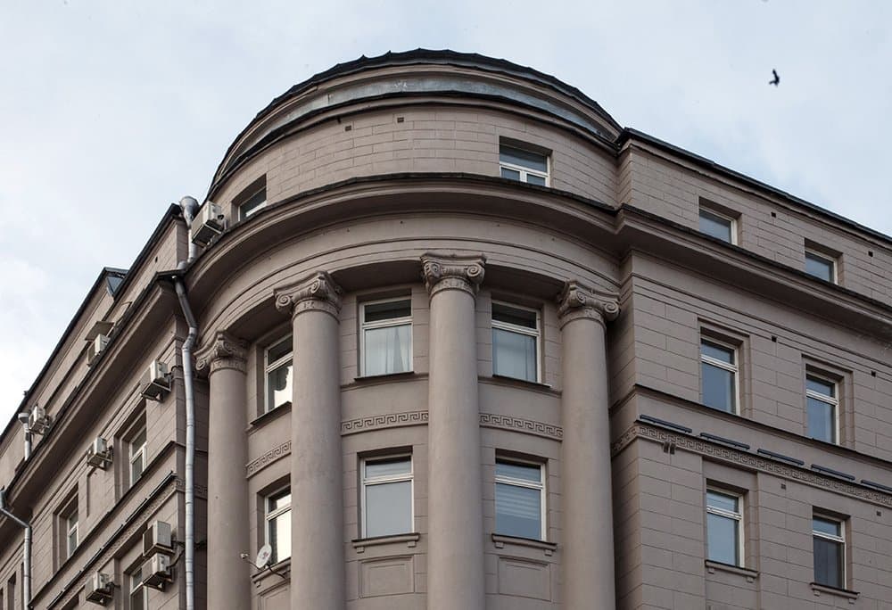Типичные приемы неоклассицизма – руст по всему фасаду, пояс из греческого меандра (между пятым и шестым этажом), треугольный фронтон (со стороны Малой Дмитровки), прямоугольные ниши с декором и балясинами.