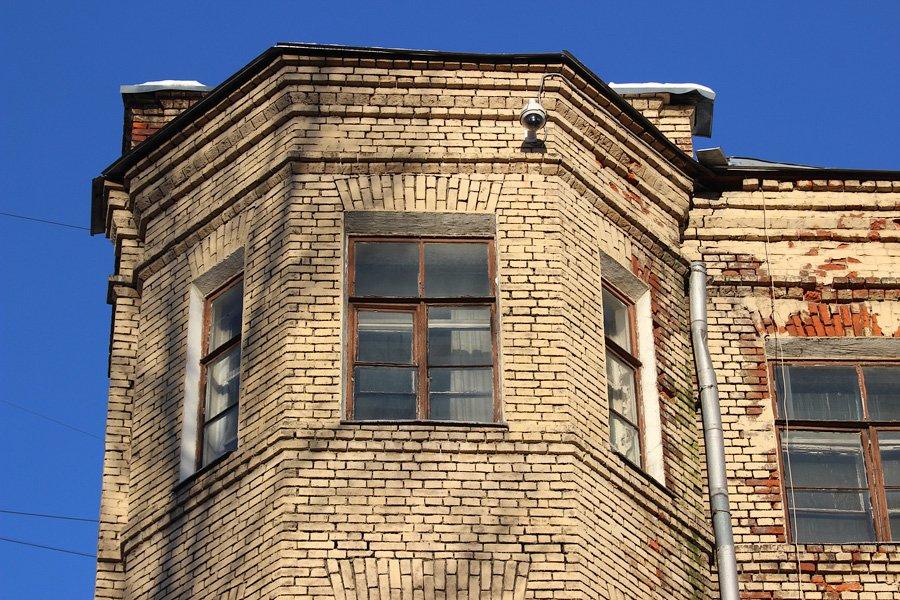 С обеих сторон странного, ассиметричного шестиэтажного здания № 12 по Сивцеву Вражку нет строений, и оно возвышается кирпичной громадой, похожей на печальный замок.