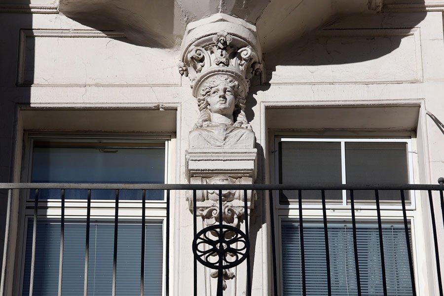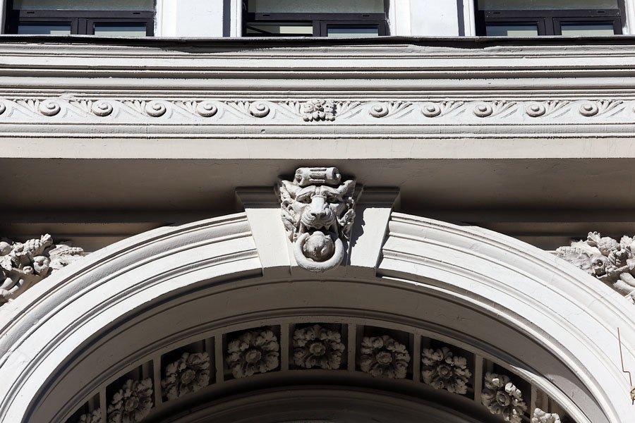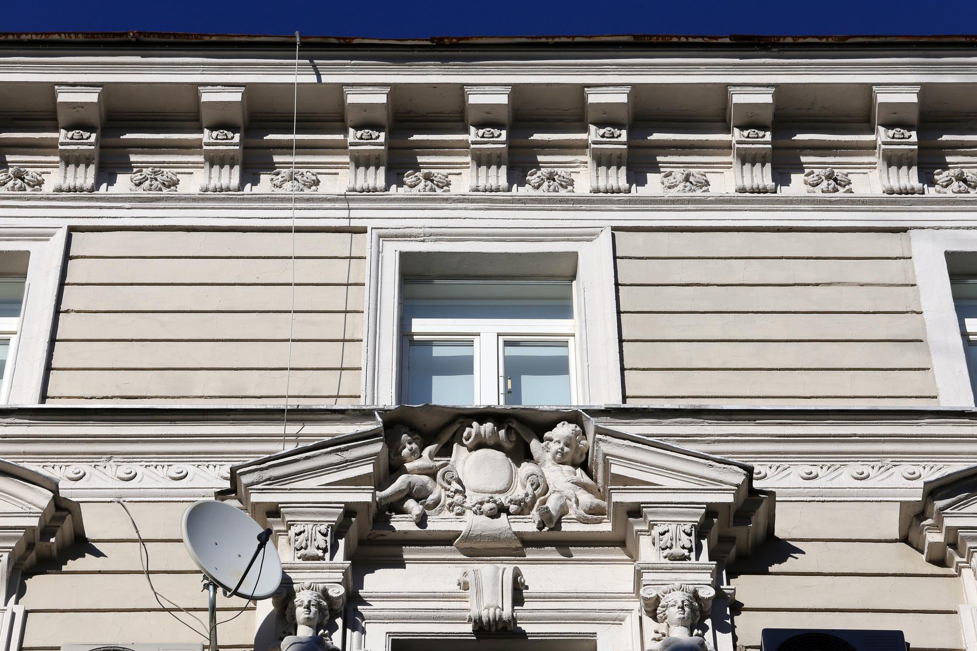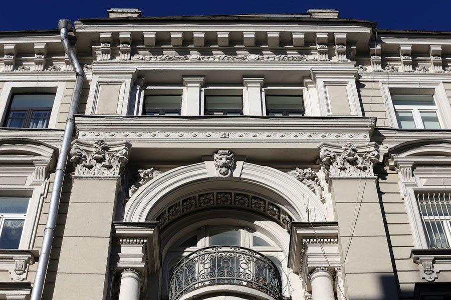 Архитектор хорошо чувствовал пропорции и стремился преодолеть плоскостность, монотонность ритма фасадных композиций использованием двух рядов эркеров с левой и правой сторон фасада. Центральную часть он незначительно вынес вперед и на уровне четвертого и пятого этажей разместил арочную нишу на несущих колоннах с полукруглым балконом. Последний украшала изящная кованная решетка.