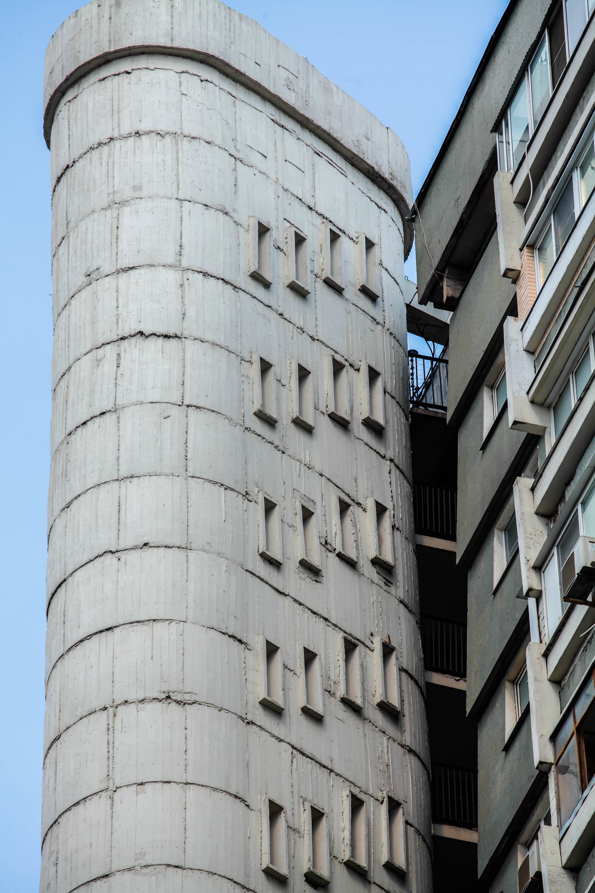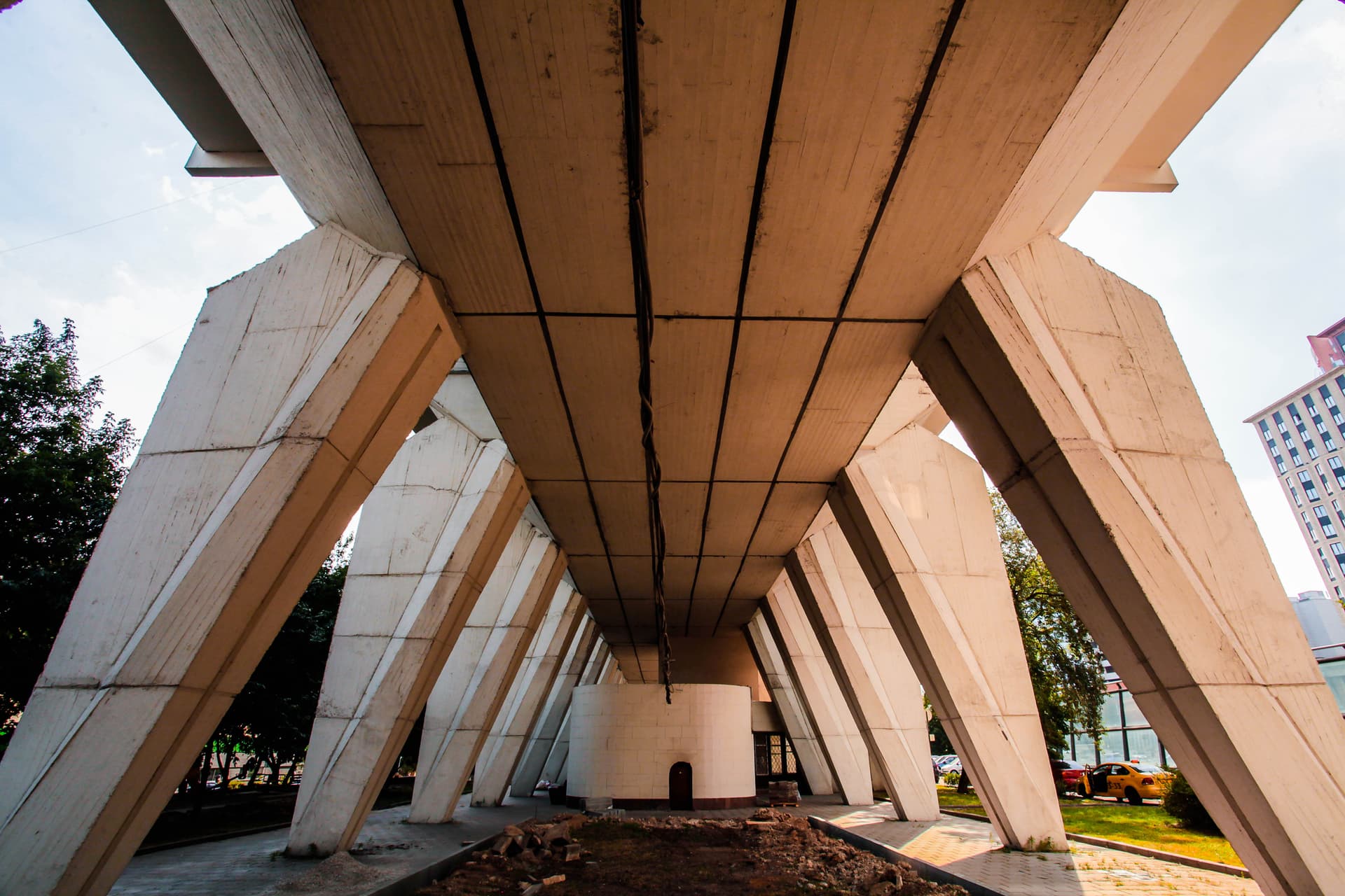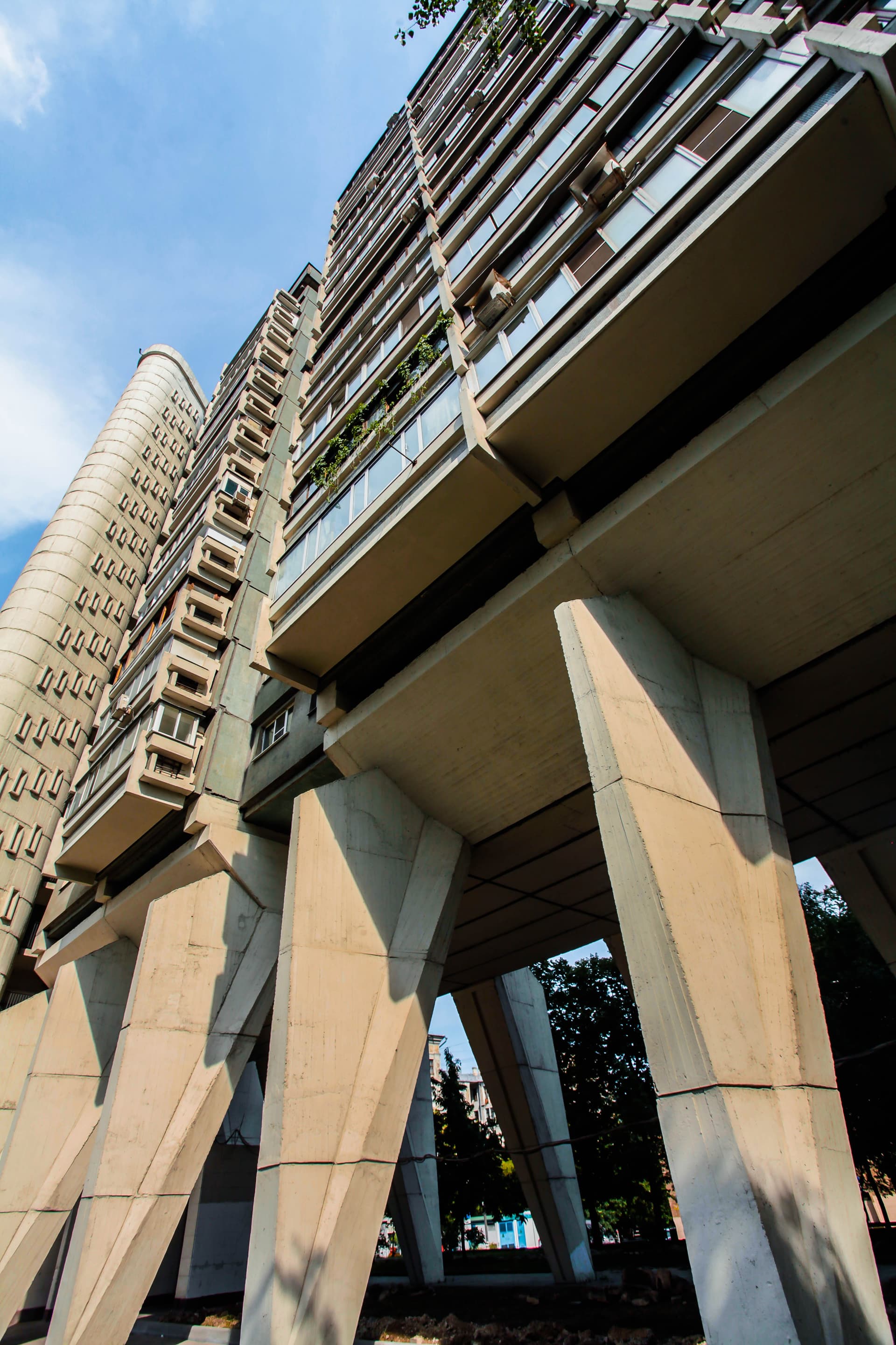 Впечатление грандиозности дома усиливается ещё и тем, что визуально дом расширяется вверх. Всё здание стоит на 20 парах мощных железобетонных «ног», которые сужаются к нижней части здания настолько, что их могут обхватить два человека. Из-за этого создаётся иллюзия неустойчивости постройки, хотя на самом деле опоры и основание дома выполнены из монолитного железобетона.