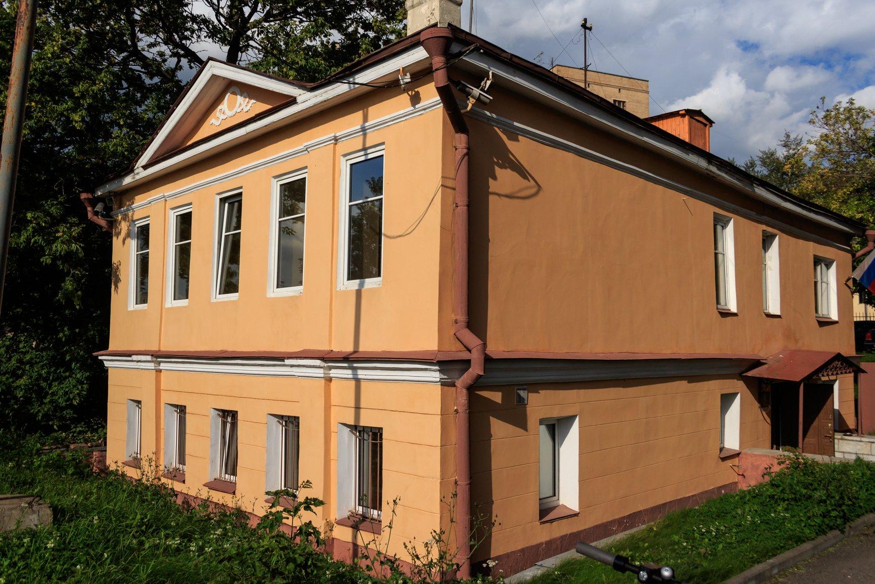 Это хороший образец ампирной архитектуры. Он построен в послепожарное время, не ранее 1820 года, купцом Я.Ф. Кикиным. Довольно сдержанное убранство фасада, даже определенная строгость, оживляются лепными веночками на фронтоне и четырьмя ионическими пилястрами на втором деревянном этаже.