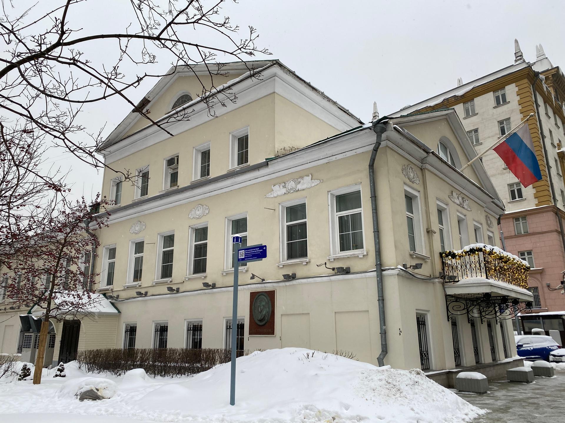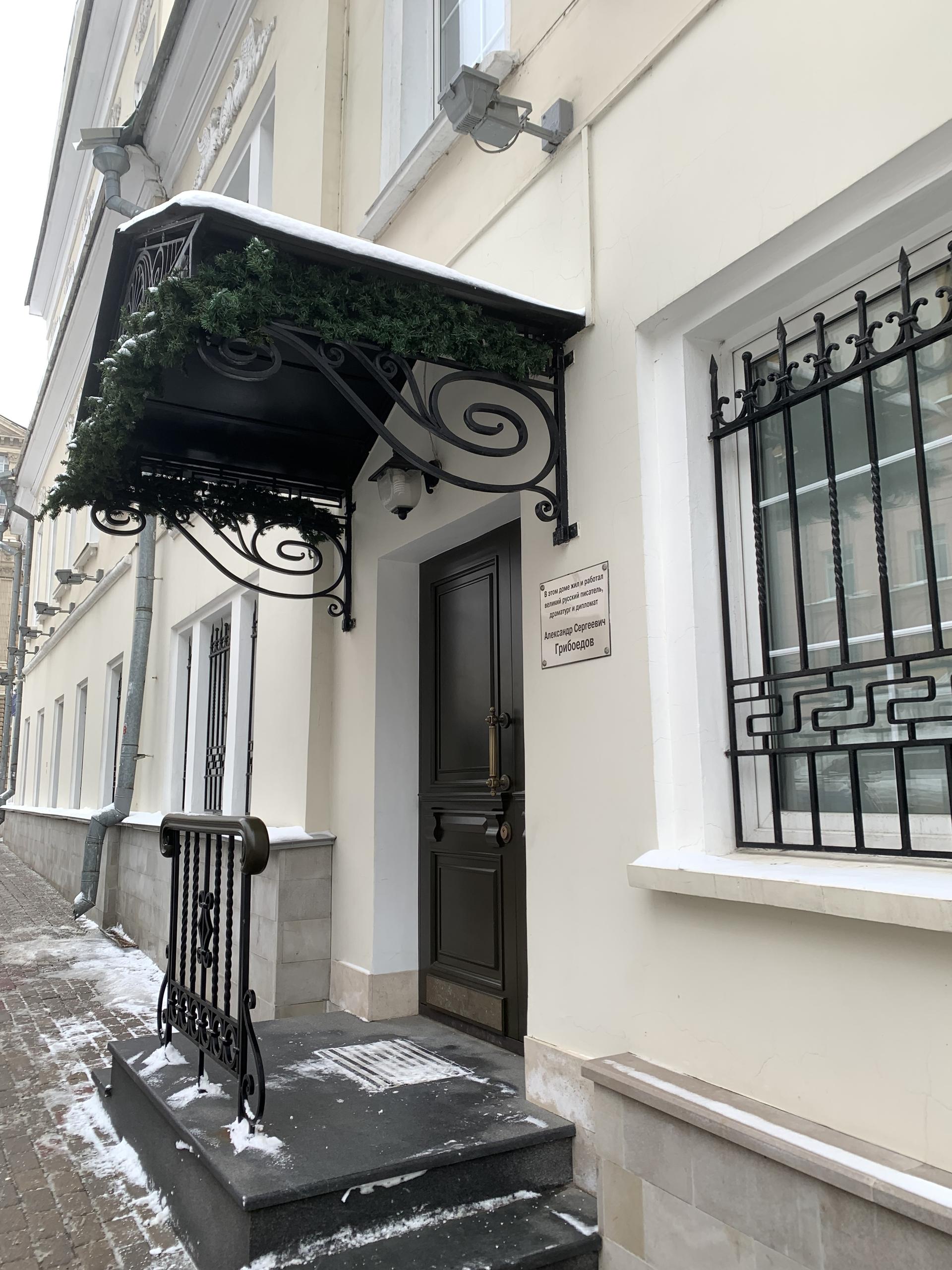 На стене дома висит барельеф с портретом писателя Александра Сергеевича Грибоедова. Дом, в котором Грибоедов провел свое детство, сильно пострадал от пожара 1812 года и был перестроен, однако в нём до 1834 г. продолжала проживать мать драматурга. «Отечество, сродство и дом мой в Москве», — в 1818 г. писал Грибоедов.