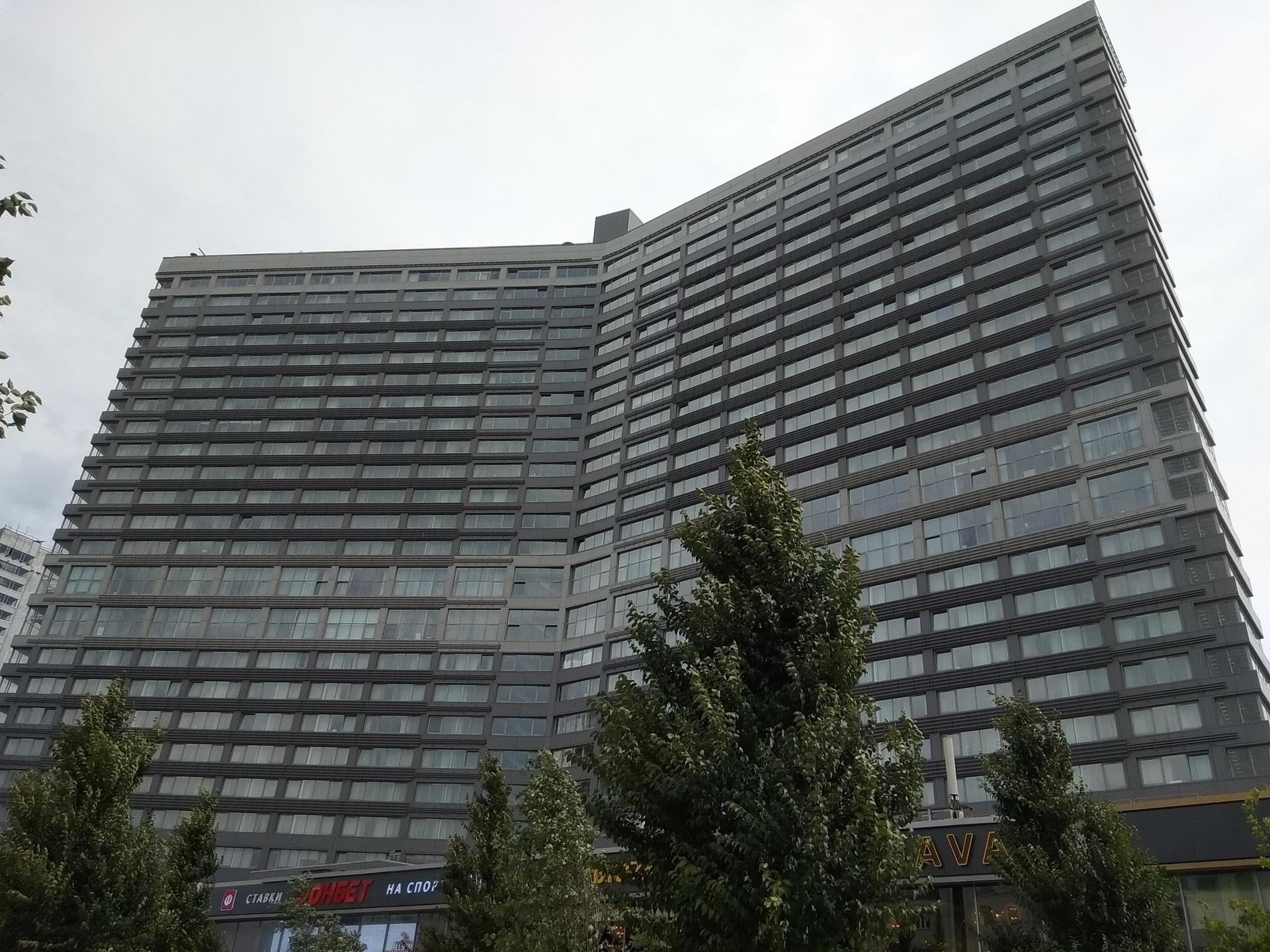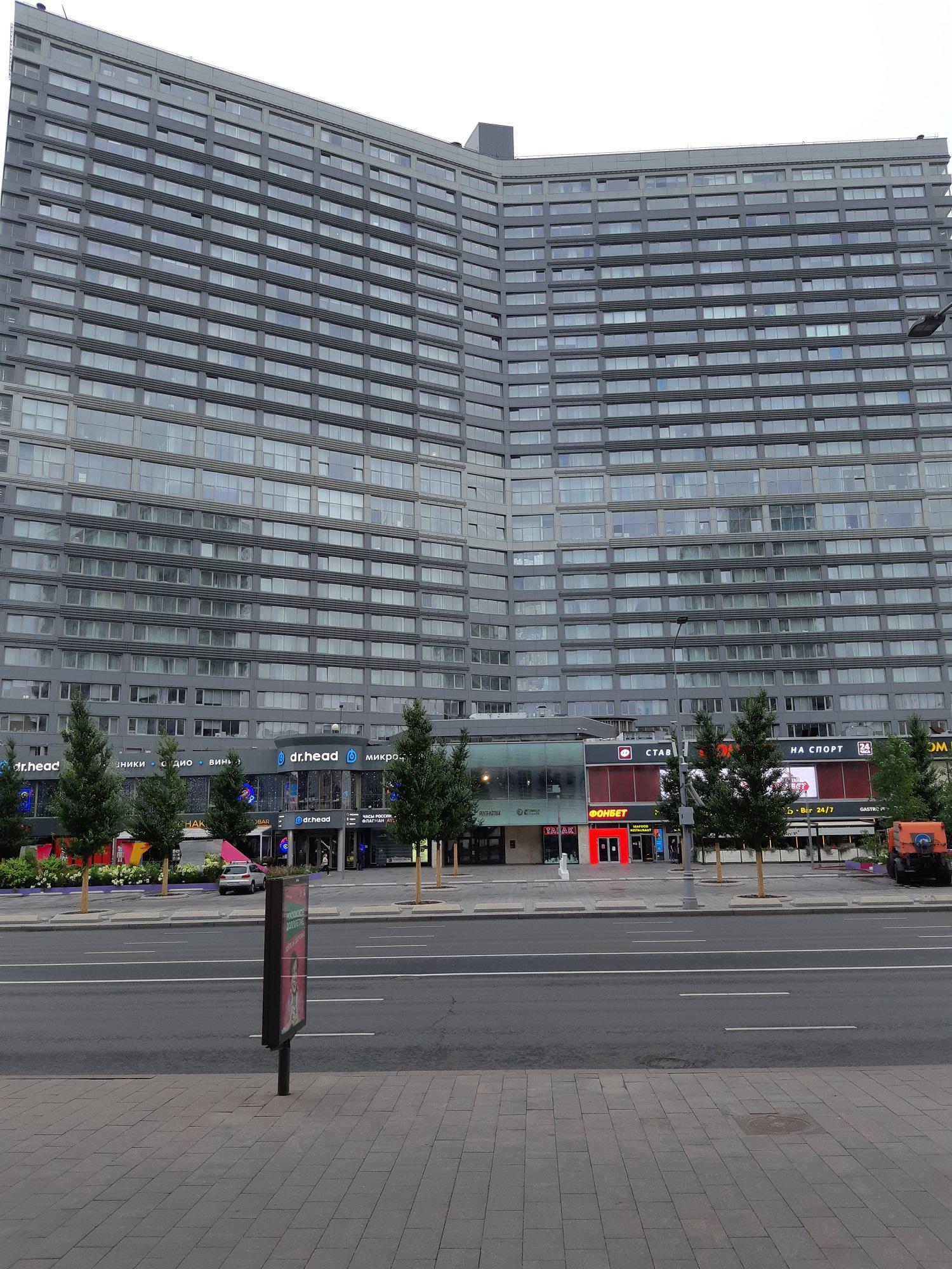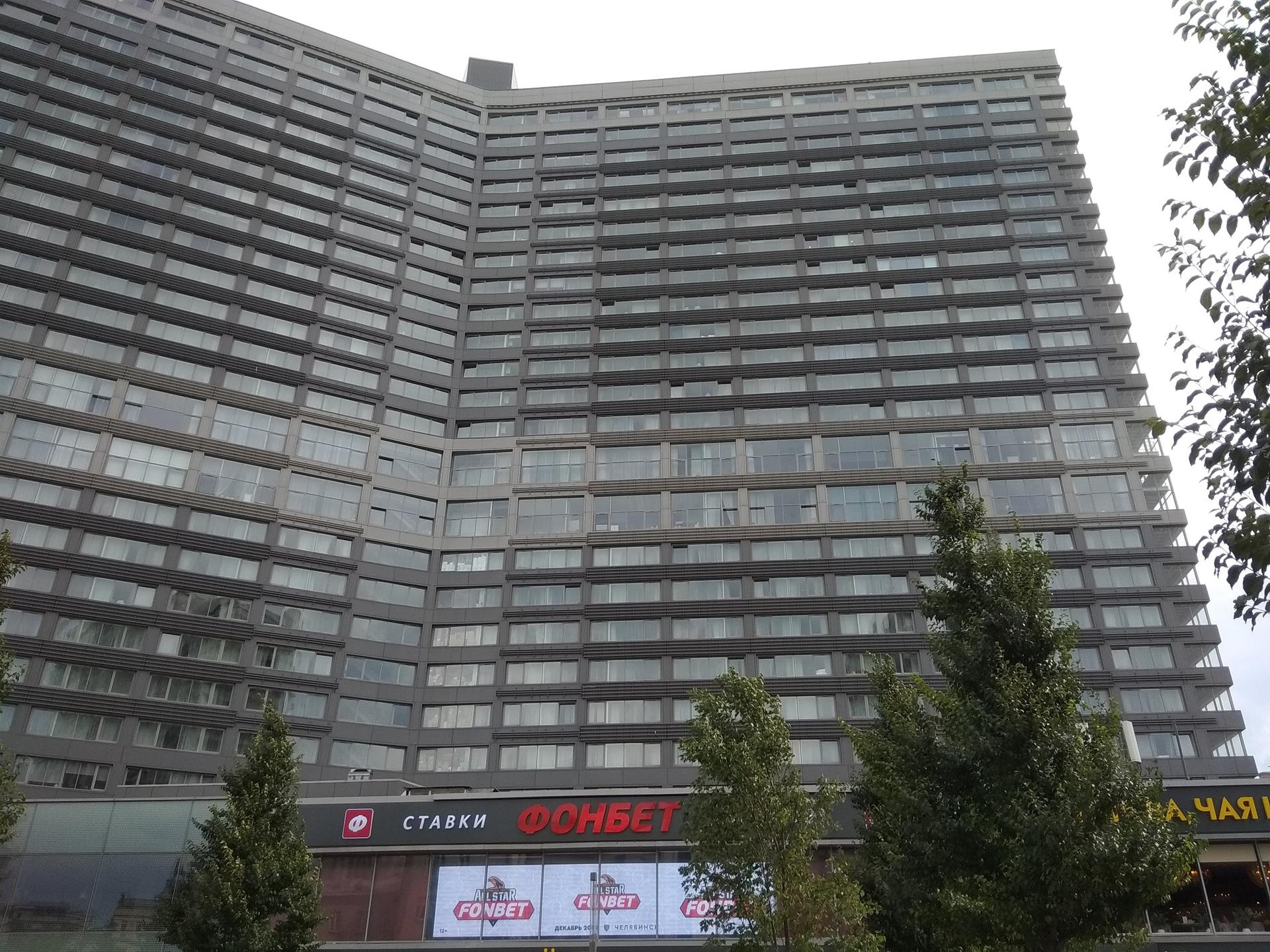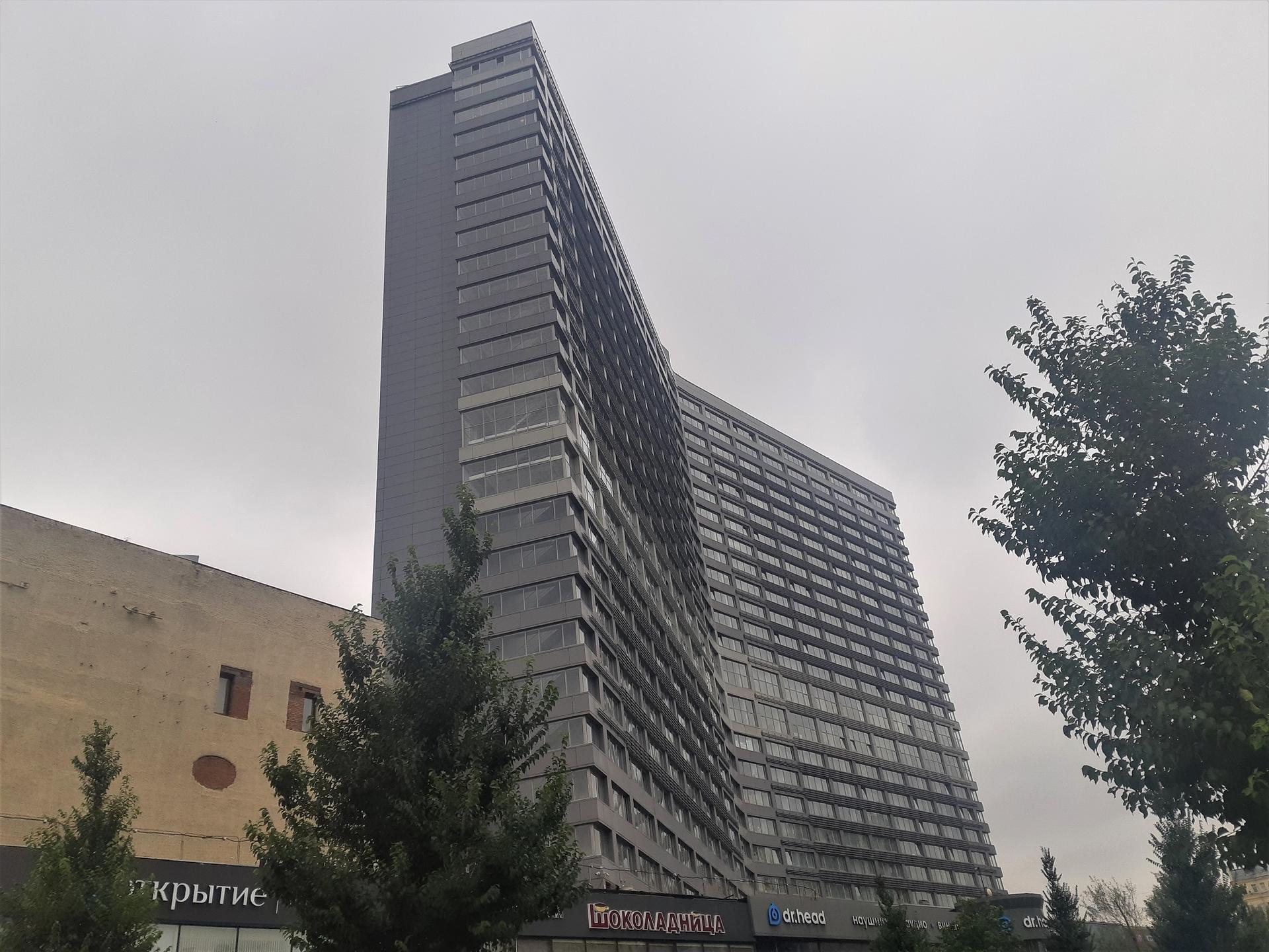 Стремительный разлет двух расположенных под углом друг к другу фасадов создает впечатление легкости сооружения, которое как бы вырастает из горизонтального двухэтажного стилобата. Фасады расчленены ритмическими лентами сплошных горизонтальных окон. Два средних этажа – двенадцатый и тринадцатый – имеют большую высоту и иной рисунок оконных переплетов.