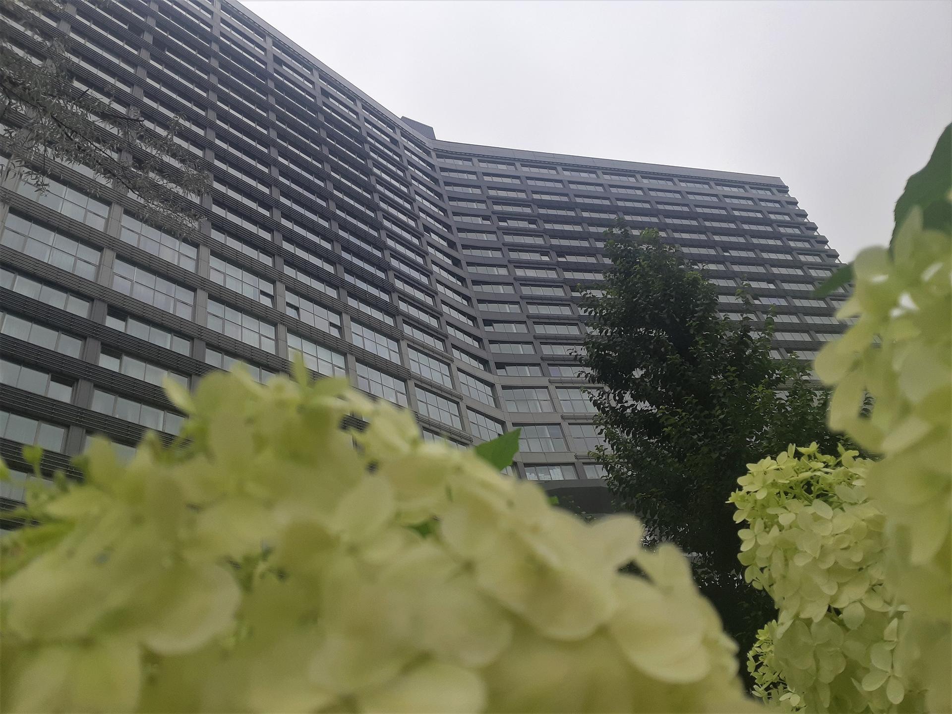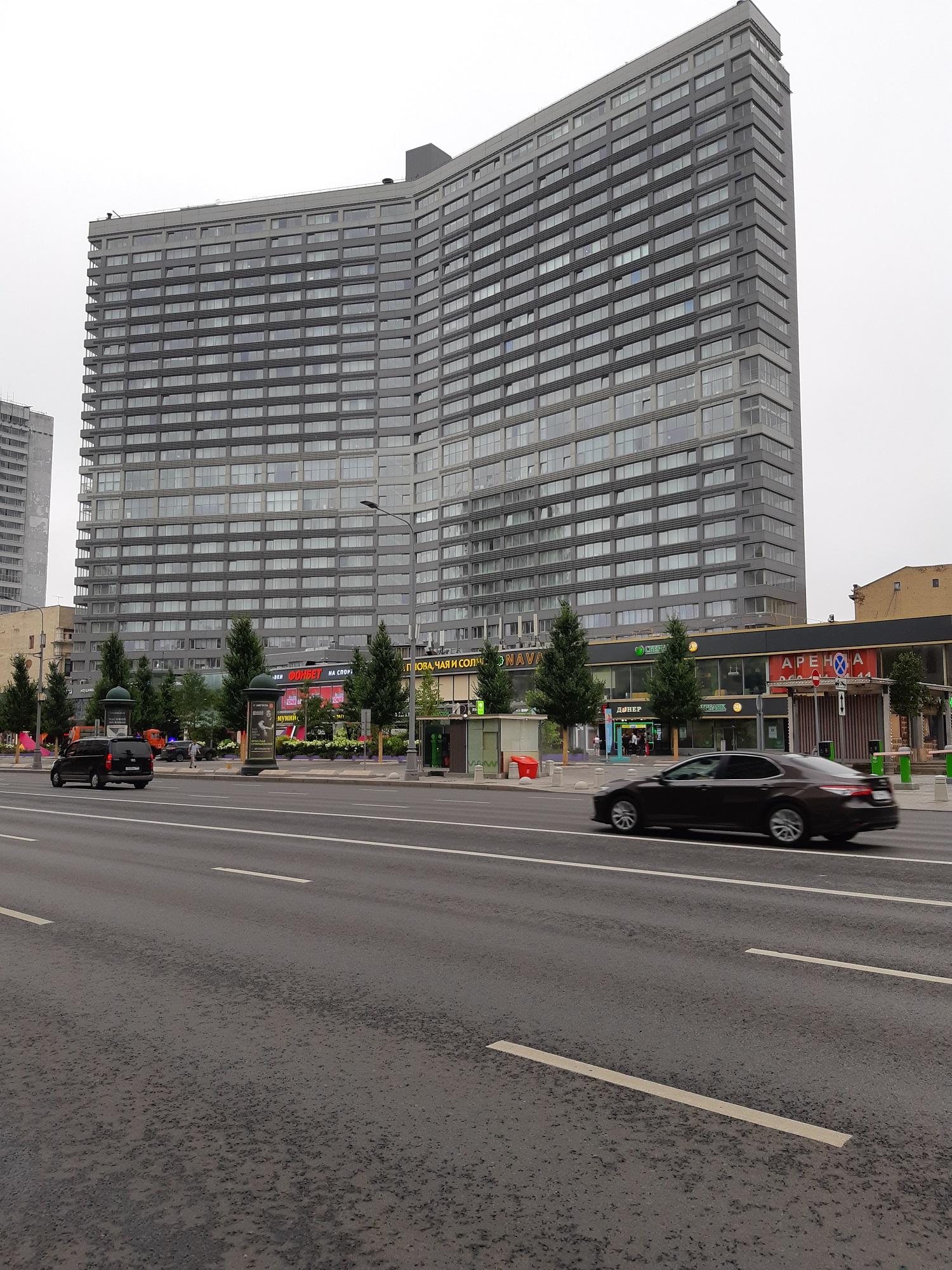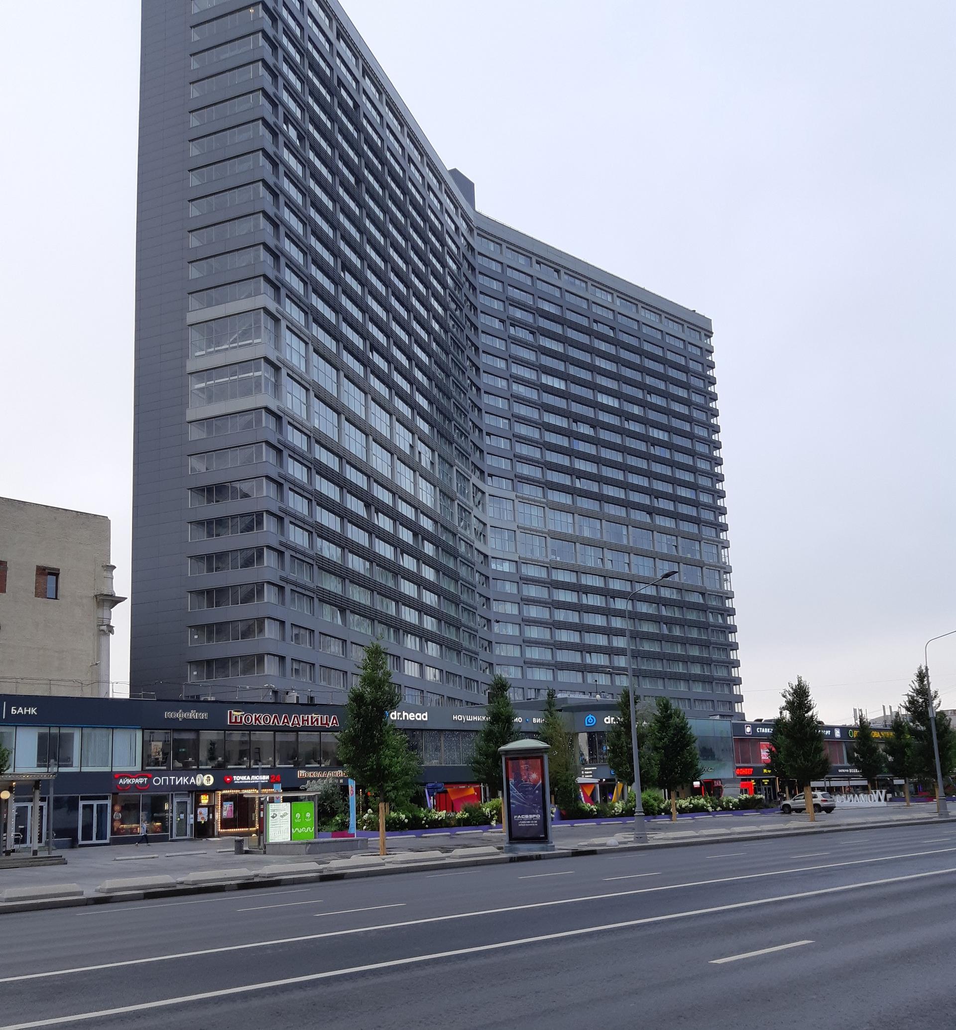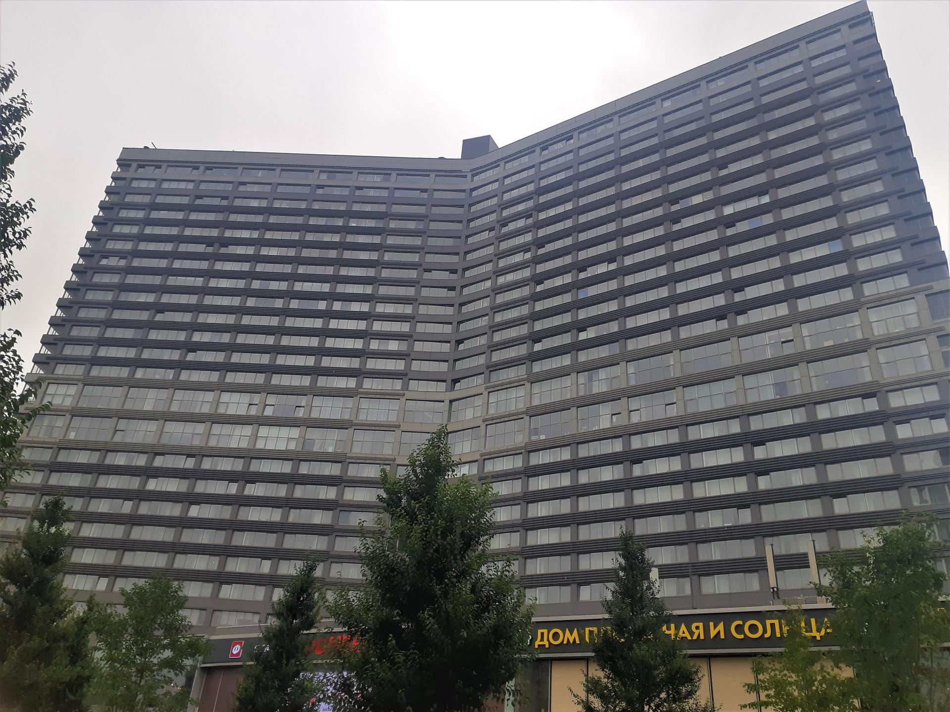 Стремительный разлет двух расположенных под углом друг к другу фасадов создает впечатление легкости сооружения, которое как бы вырастает из горизонтального двухэтажного стилобата. Фасады расчленены ритмическими лентами сплошных горизонтальных окон. Два средних этажа – двенадцатый и тринадцатый – имеют большую высоту и иной рисунок оконных переплетов.