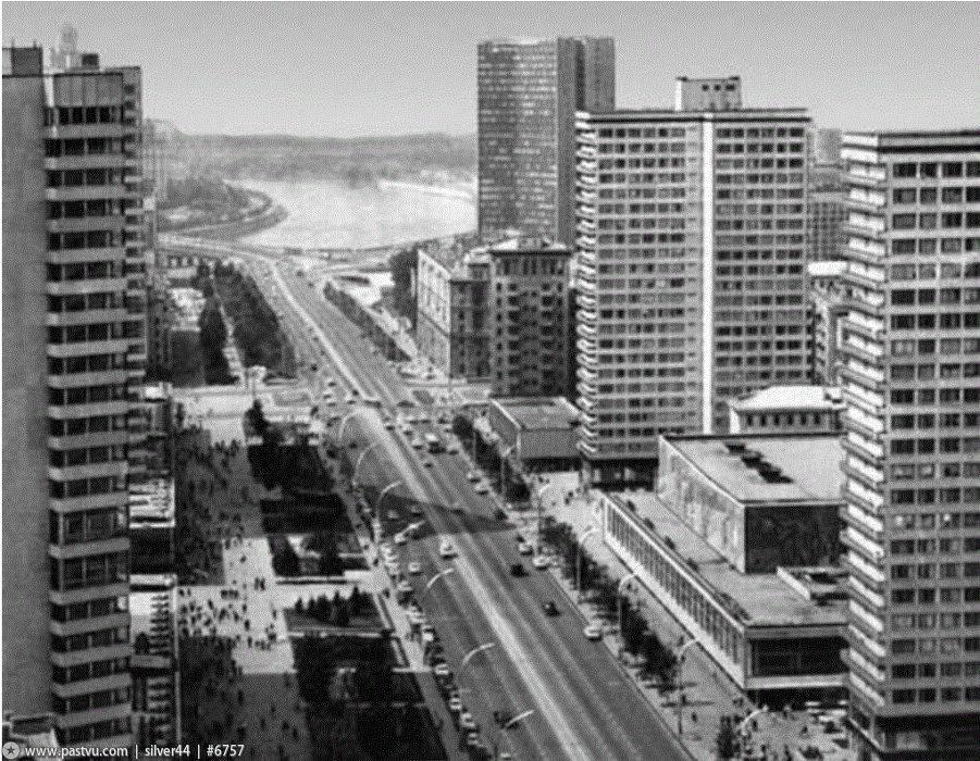 Одно из четырех административных зданий Нового Арбата, «дом-книжка», выстроен в 1963 – 1968 годах. Именно тогда, по проекту группы архитекторов (М. Посохин, А. Мндоянц, В. Г. Макаревич, Б. Тхор, Ш. Айрапетов, И. Покровский, Ю. Попова, А. Зайцева) был сформирован новый городской ансамбль, где единому замыслу было подчинено всё — от общего направления пространственной структуры до деталей благоустройства и рекламы.
