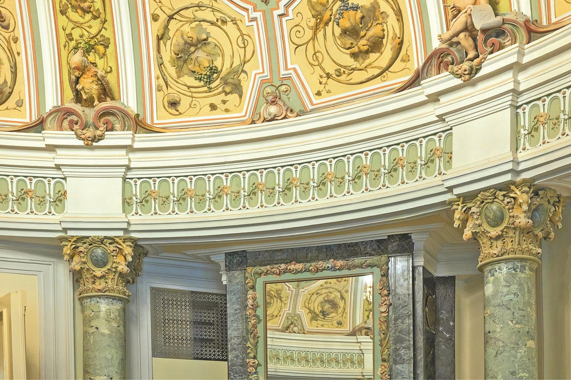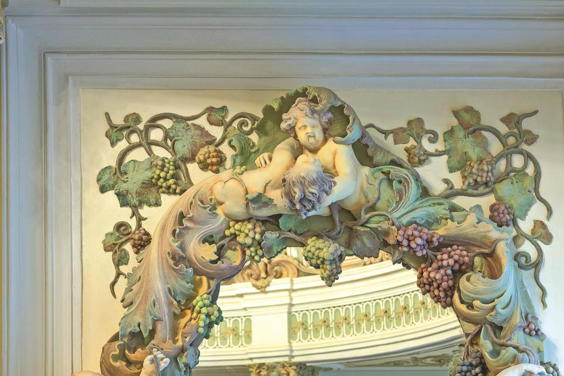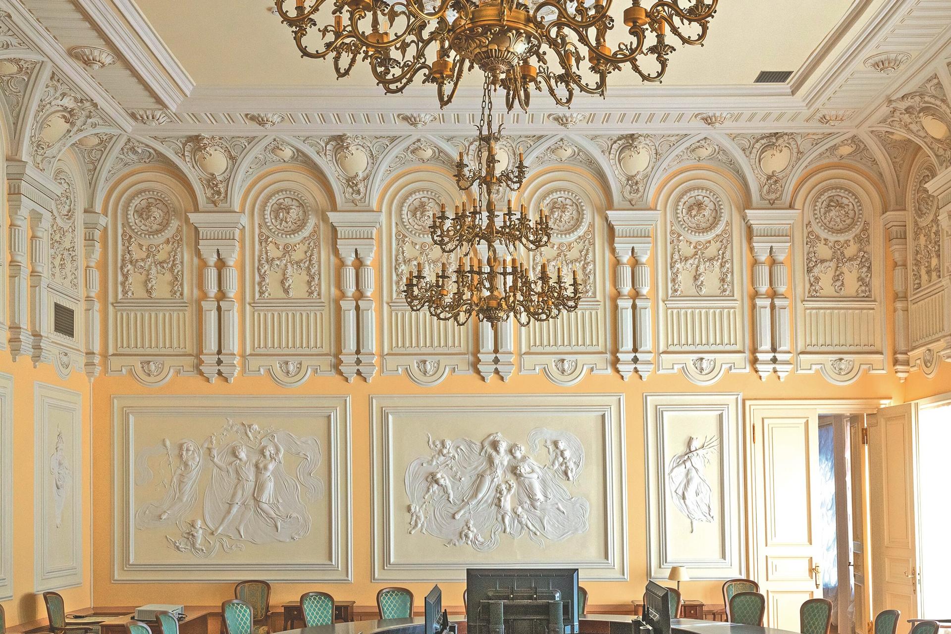 Особую ценность представляют восстановленные настенная и потолочная живопись, а также отреставрированные печи и камины XIX века с зеркалами над ними.