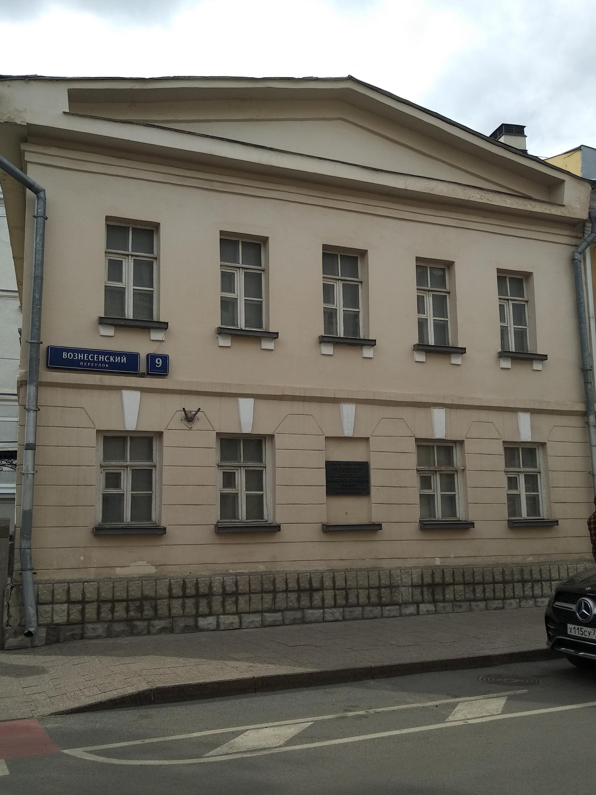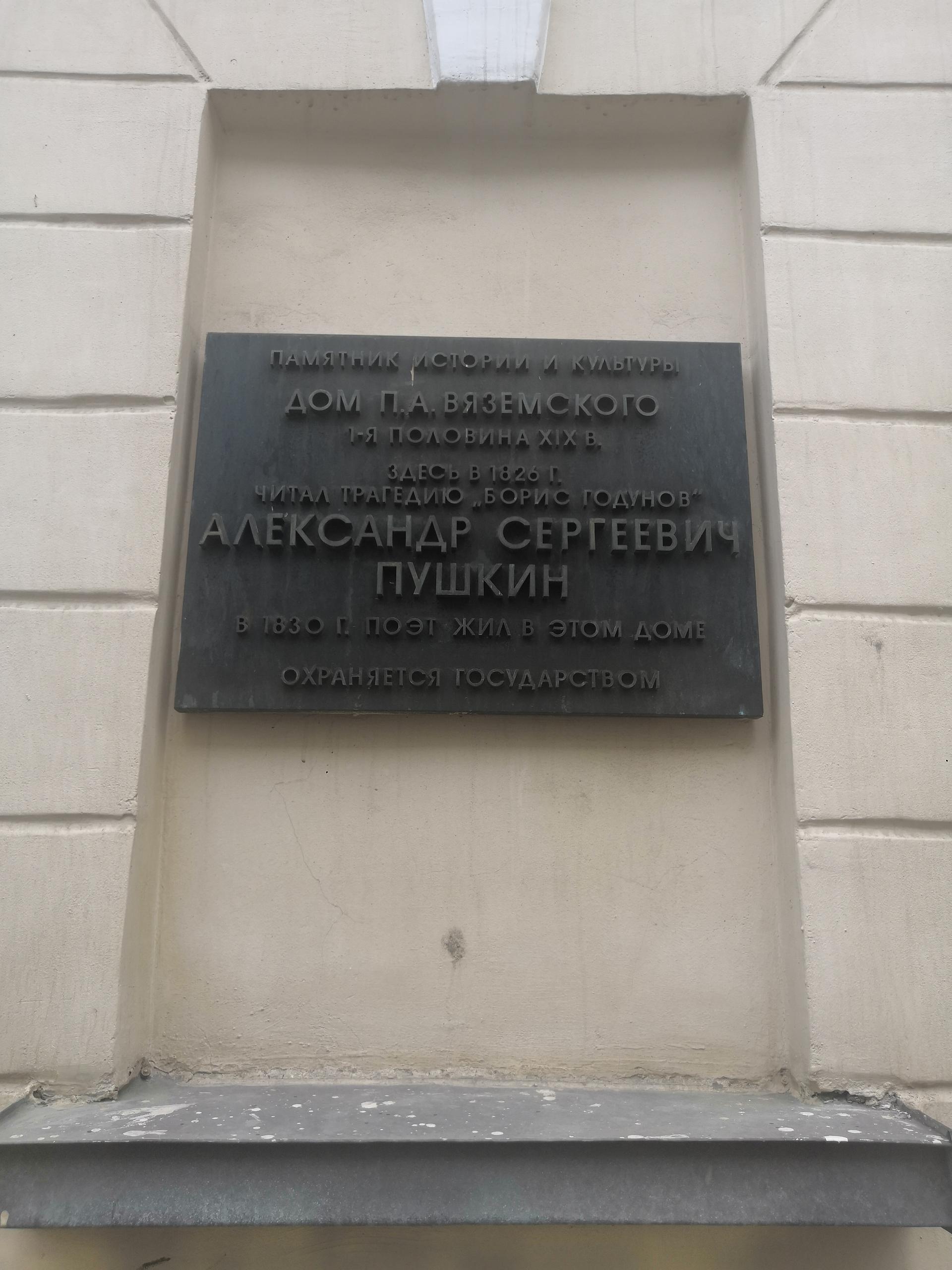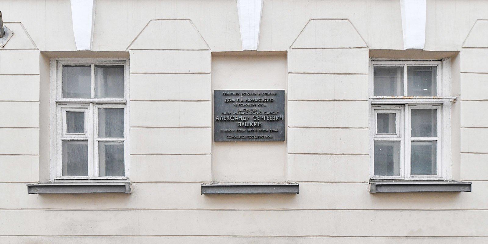 А. С. Грибоедов в 1824 году читал здесь «Горе от ума». В этом доме бывал и А. С. Пушкин. В 1826 году он читал здесь трагедию «Борис Годунов». В 1830 году, приехав из Петербурга, Пушкин жил в этом доме у Вяземского с августа по сентябрь. Отсюда он в начале сентября 1830 года уехал в Болдино. Об этих двух событиях напоминает табличка на фасаде дома.