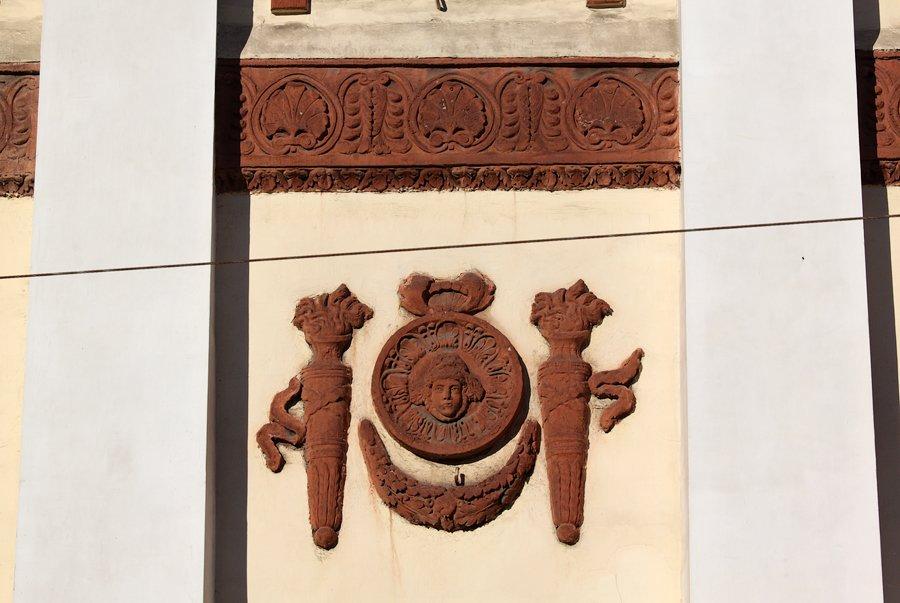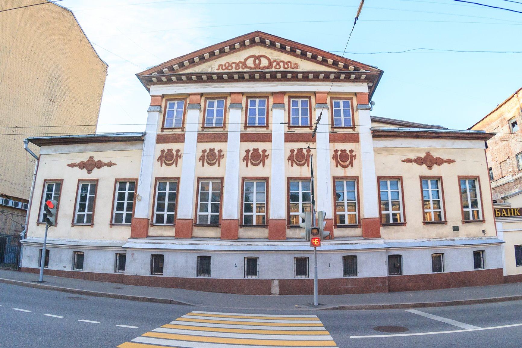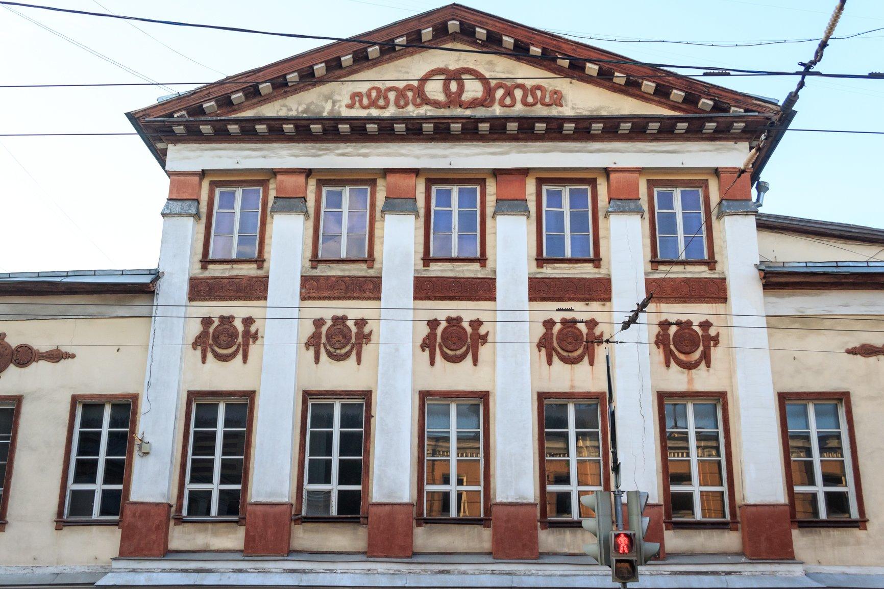 Ампирный дом был выстроен в дереве на допожарном каменном основании. Его фасады оштукатурены, в результате чего создаётся имитация каменного здания – это соответствовало архитектурной моде того времени. Использование декора в стиле ампир с пилястрами, венками славы, лентами и медальонами ещё более усиливает эффект каменной постройки. Первый этаж по традиции занимали парадные комнаты, отмеченные высокими окнами, с бальный залом и кабинетом хозяина. Вместо второго этажа дом венчает мезонин, в котором находились спальни, хозяйская столовая и другие помещения, не предназначенные для глаз гостей.