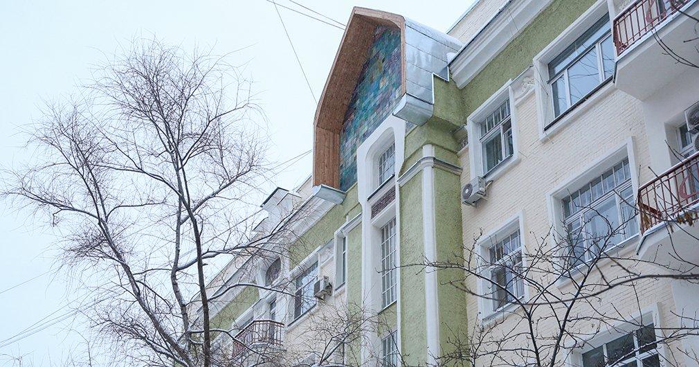 Самые большие майоликовые панно расположены над входами в подъезд здания. Две мозаики выложены из разноцветных плиток квадратной формы в бирюзово-сине-фиолетовой гамме. Панно дополняют изразцы «Рыбки», выполненные по эскизу Михаила Врубеля. Мозаики меньшего размера расположены в нишах над балконами. На одном из них изображена девушка с распущенными волосами, пробирающаяся через заросли. На другом — арка, увитая ветвями с плодами, под ними плывет пара лебедей к стоящему на берегу павлину. Считается, что прообразом этого сюжета послужила картина Константина Коровина «Лебеди».