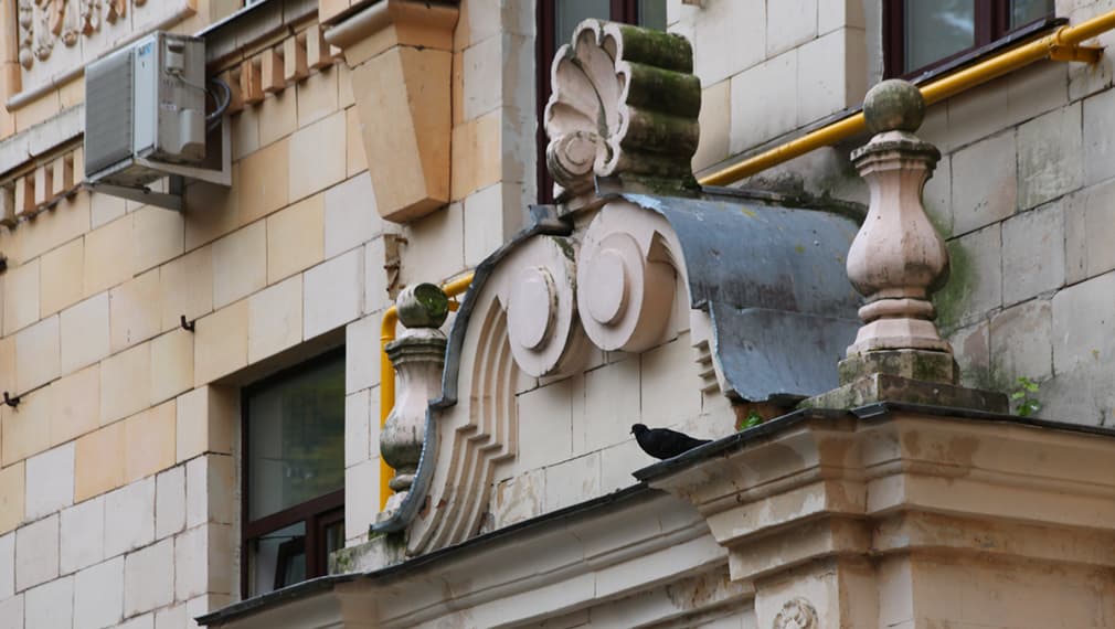 У этого здания возникли два близнеца. Один из них, знаменитый дом-полтинник, или, как его еще называют, дом отставных вождей, был построен на Фрунзенской набережной. Второй появился также в Гагаринском районе, как бы в зеркальном отражении на соседнем Университетском проспекте, — это дом сотрудников министерства госбезопасности. Он строился позже, при Хрущеве, когда в стране уже началась борьба с архитектурными излишествами. В результате со здания счистили все яркие детали: облицован он уже не керамикой, а кирпичом, и никаких декоративных элементов не имеет.