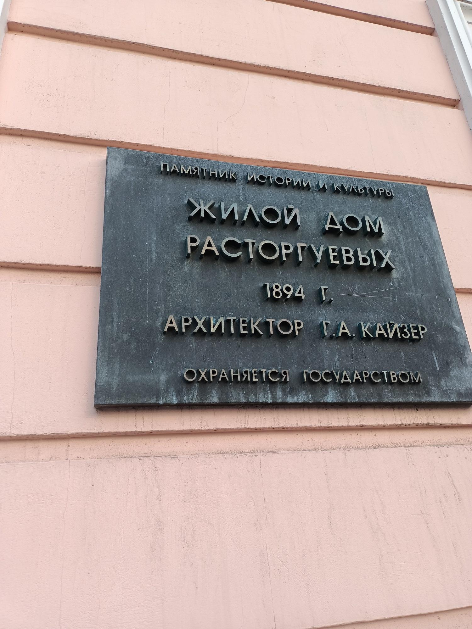 Дом Расторгуевых построил в 1894–1896 годах известный московский архитектор Георгий Кайзер. Предположительно, здание собирались сдавать в аренду, поскольку семья почетного гражданина Расторгуева продолжала жить в старом доме.