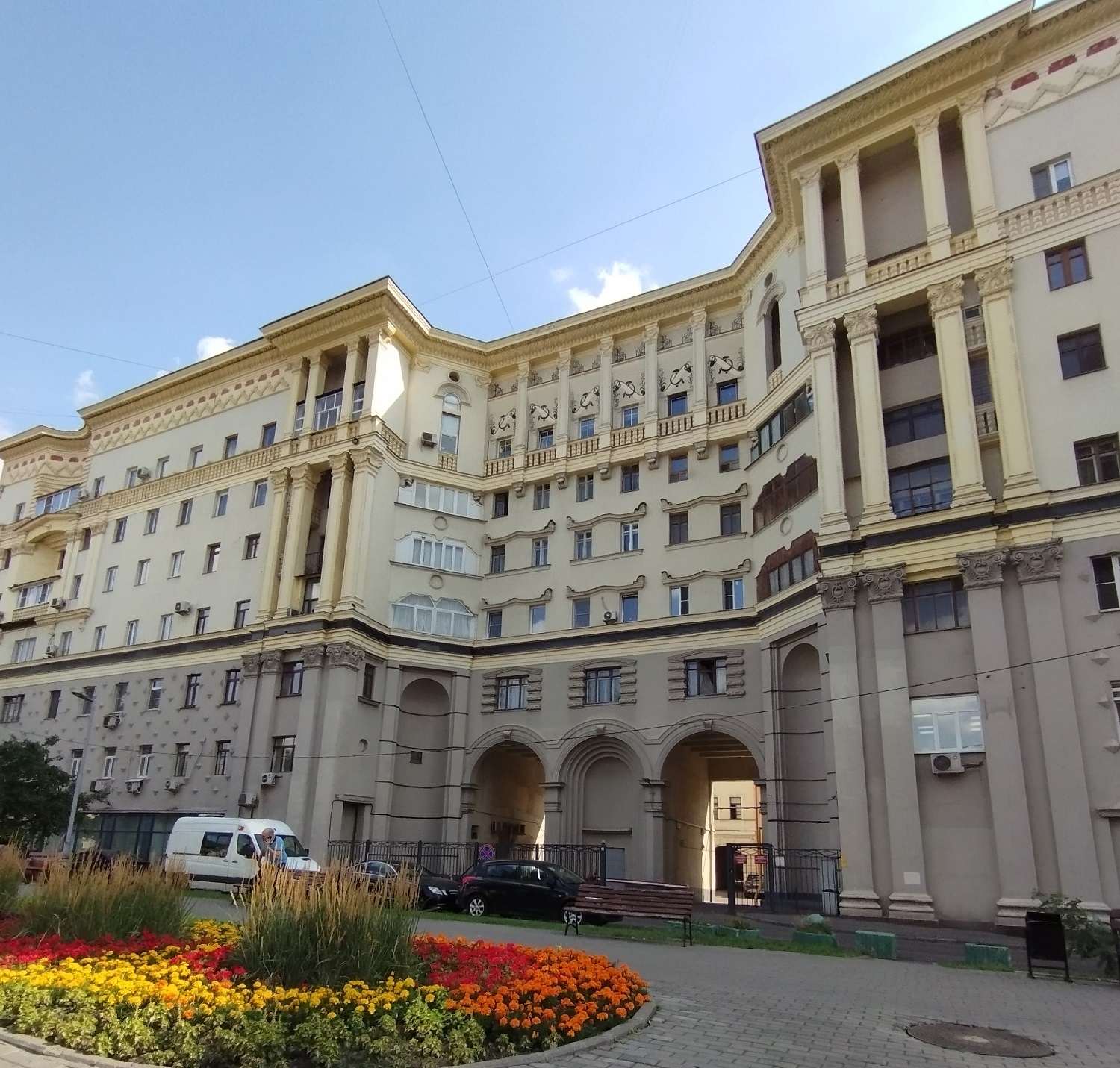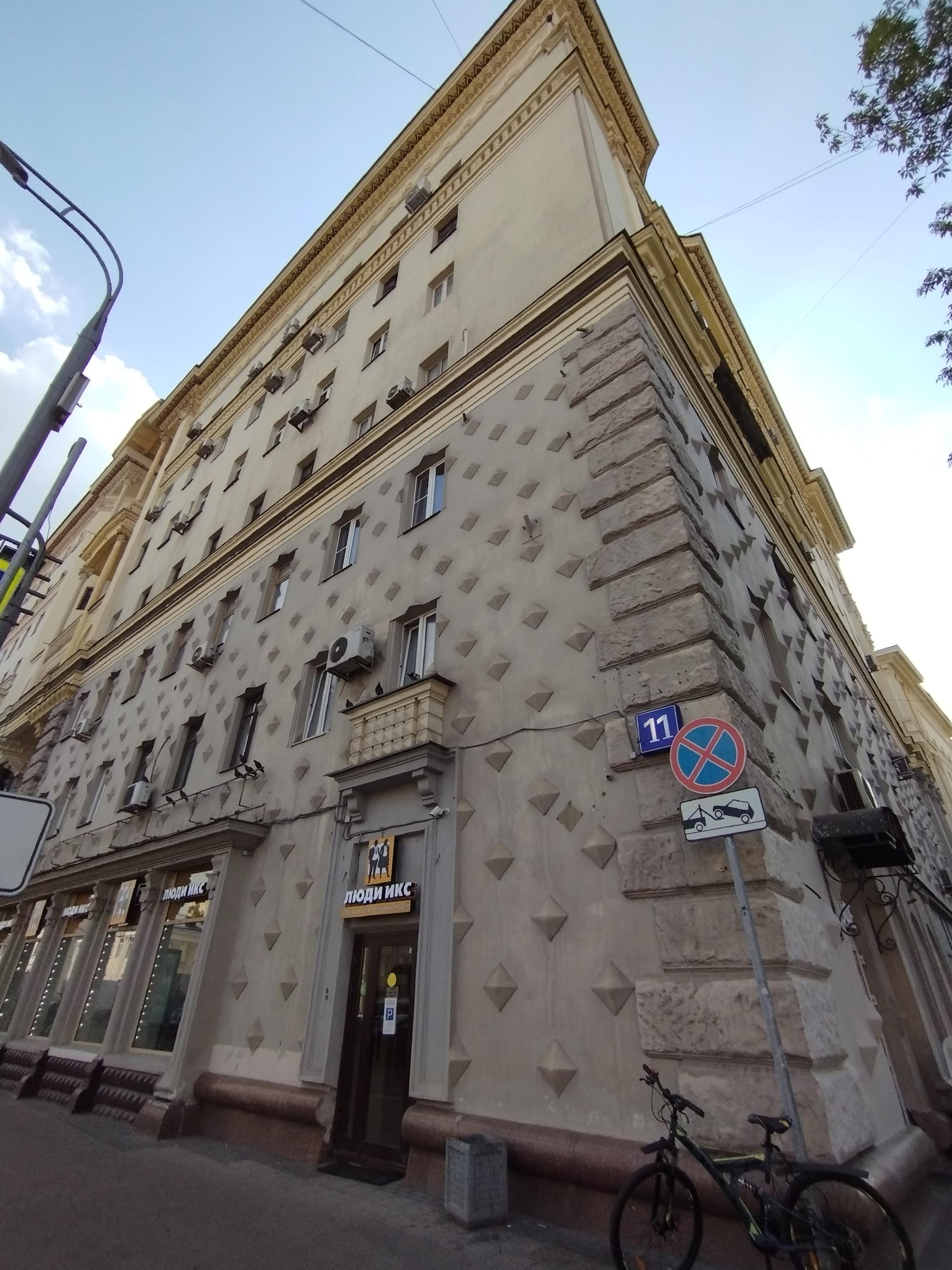 Огромный многоквартирный дом на проспекте Мира во владении № 7 – 11 был построен по проекту архитектора Д. Д. Булгакова в 1937-1944 годах для сотрудников Народного комиссариата связи СССР. Любопытная особенность здания – два парадных фасада. Один выходит на проспект Мира, другой смотрит на скверик, устроенный на месте снесённого в 1936 году старинного храма св. Адриана и Натальи. В соответствии с Генпланом Москвы 1935 года здесь, перпендикулярно 1-й Мещанской улице (проспекту Мира), должен был пролегать широкий проспект – дублёр Садового кольца. К счастью, этот проект так и не был осуществлён, хотя адриановская церковь всё же явилась его жертвой.