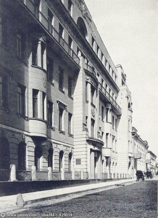 Многоэтажный серый дом с массивными эркерами и легким балконом, идущим по четвертому этажу фасада, был построен для Главного управления уделов, которое ведало имуществом царской семьи. Вдоль первого этажа идет ажурная решетка, отделяющая дом от тротуара. Здание построено по проекту архитектора П.П. Малиновского в 1912-1913 гг. и имеет огромные прекрасно оборудованные подвалы для хранения и разлива марочных вин.